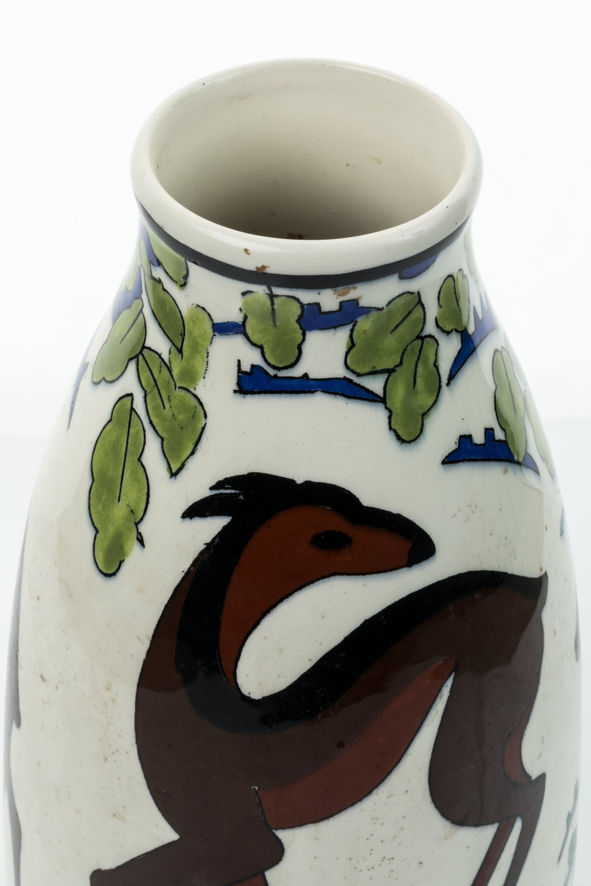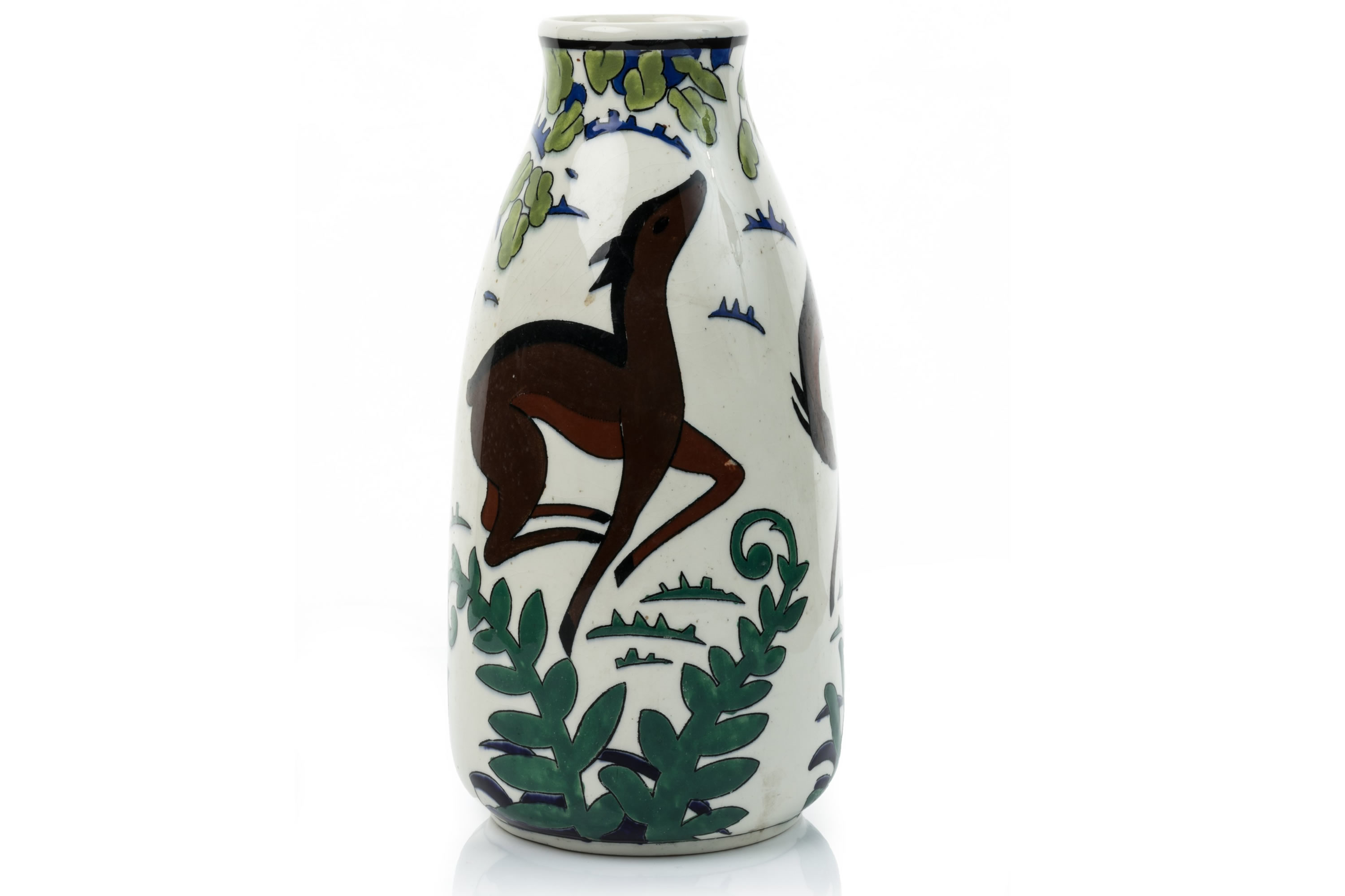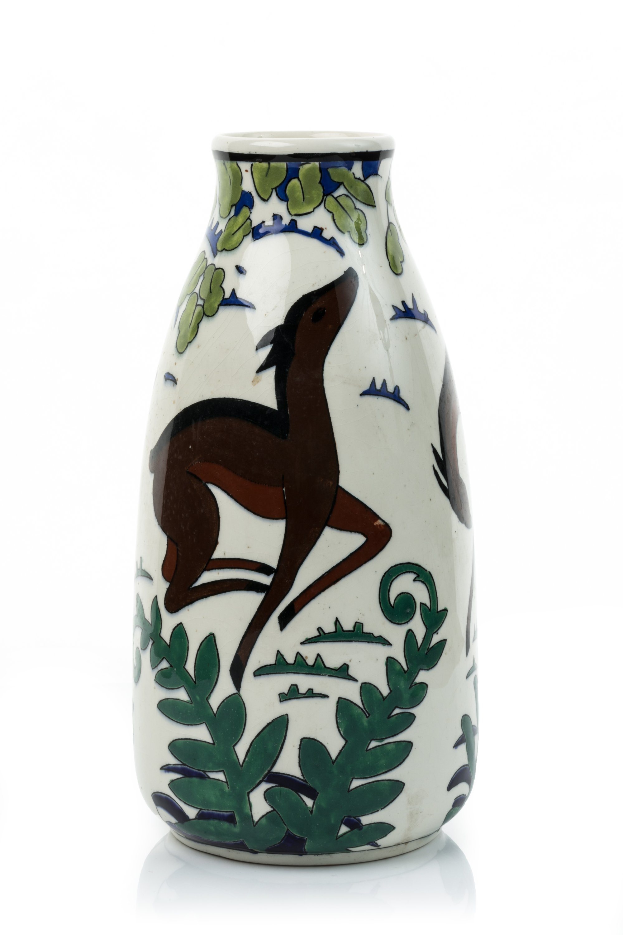 en faïence blanche à décor polychrome sur couverte figurant trois cervidés dans un entourage végétal.