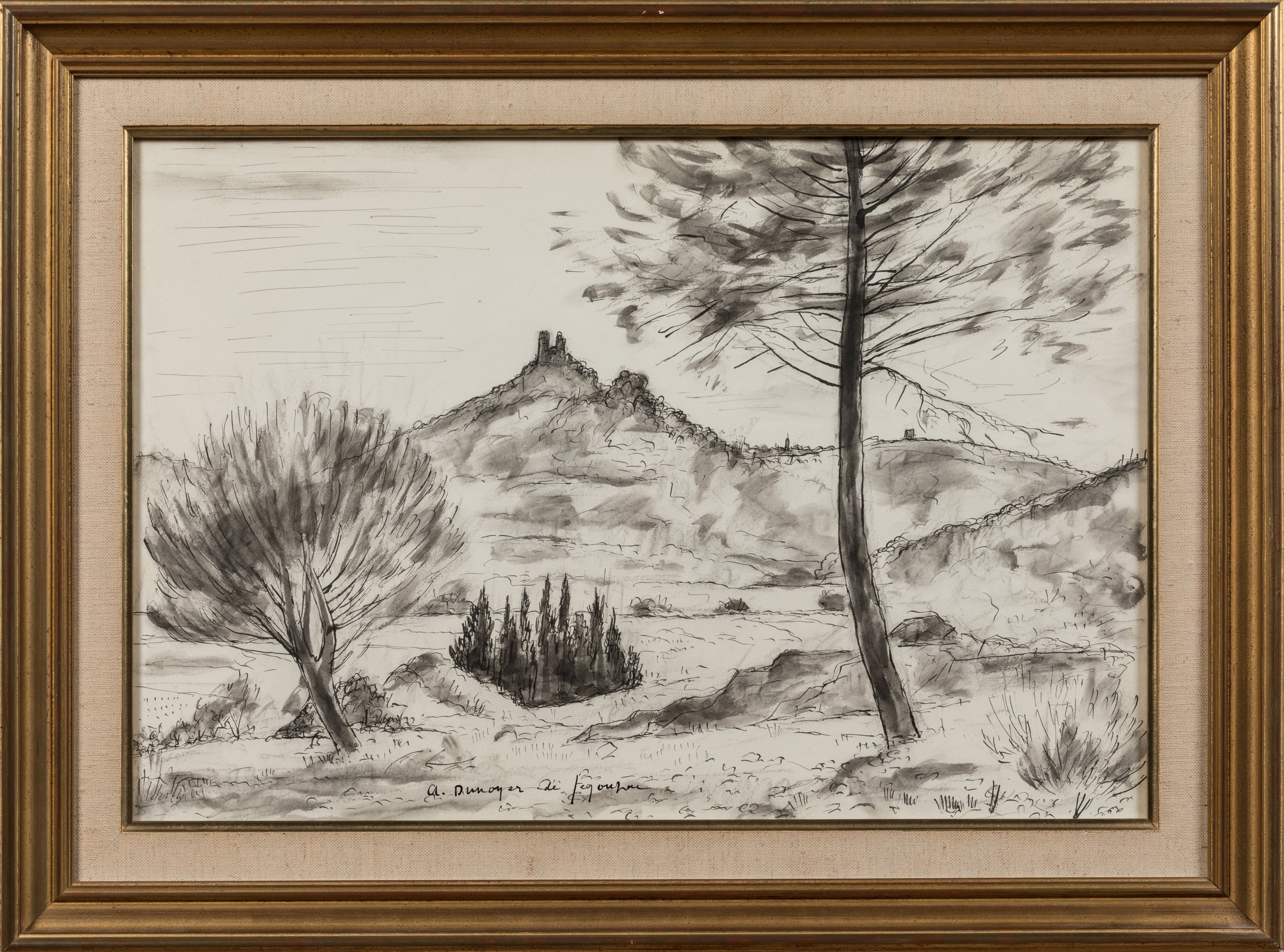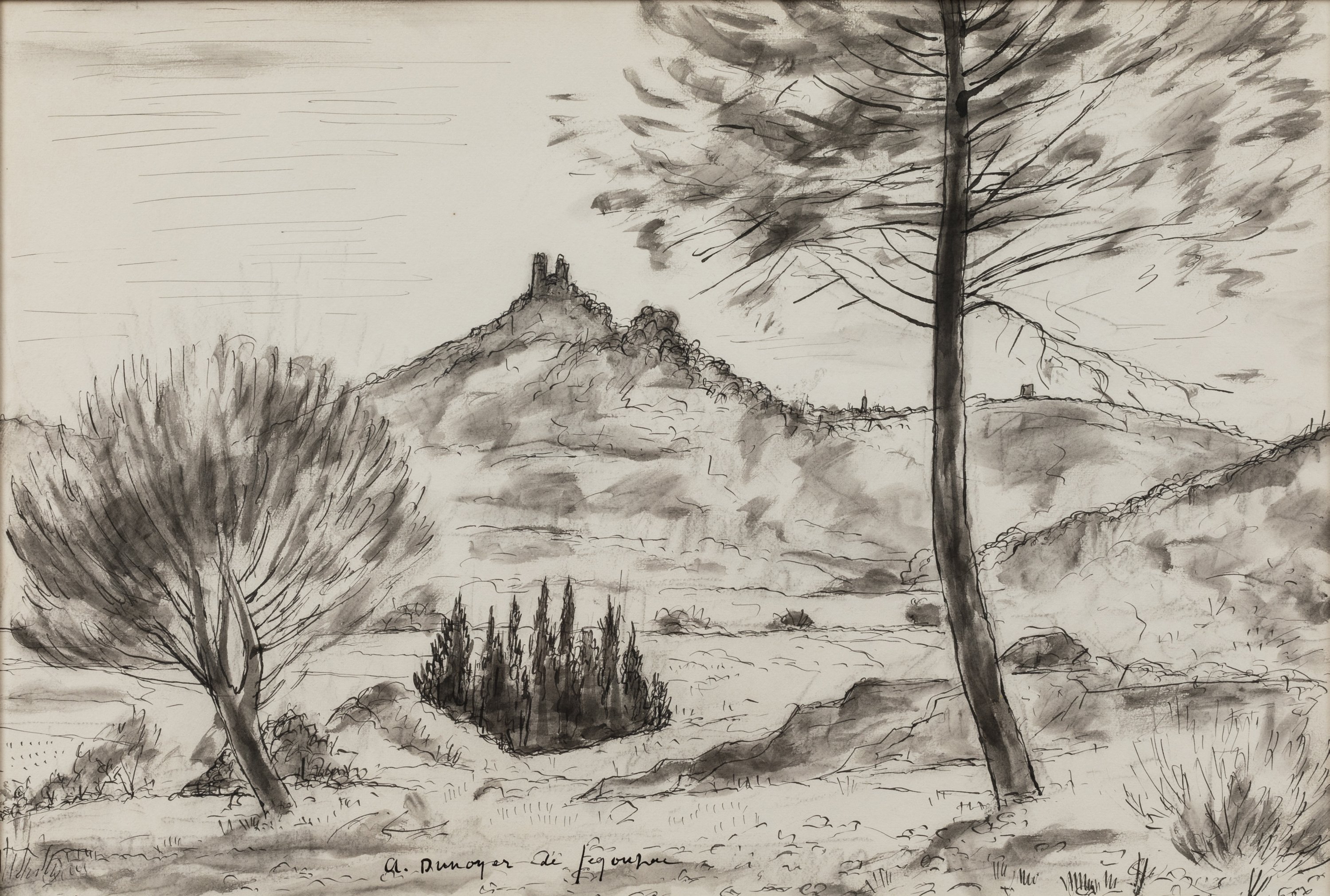 Le dessin à l'encre et au lavis précède tous les travaux d'André Dunoyer de Segonzac, comme il le confie lui même dans un entretien en 1974. Deux ou trois séances lui sont nécessaires pour former "le lit et l'architecture" du tableau, qui sera peint à l'aquarelle. Il met à profit cette technique dans ses paysages du Sud de la France. "Autour de Saint-Tropez, l'artiste rayonnait dans sa Provence mais ne s'éloignait guère de plus de vingt kilomètres pour trouver ses motifs privilégiés" à l'exemple de Grimaud (op. 1973, p. 34). Ceci explique les nombreuses variations auxquelles Dunoyer de Segonzac donne un sentiment de plénitude, une joie mesurée, loin des représentations de Signac et Cross issus de la génération précédente.
