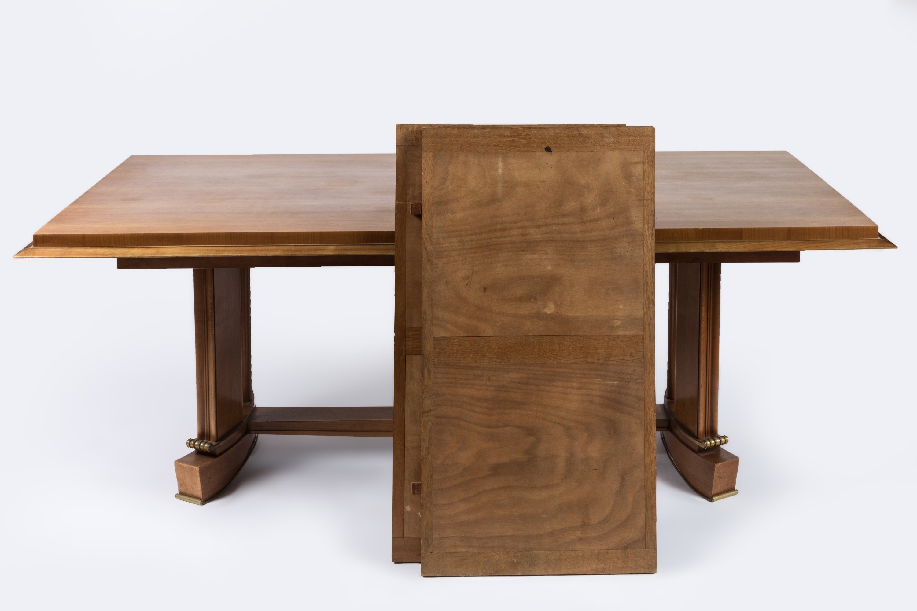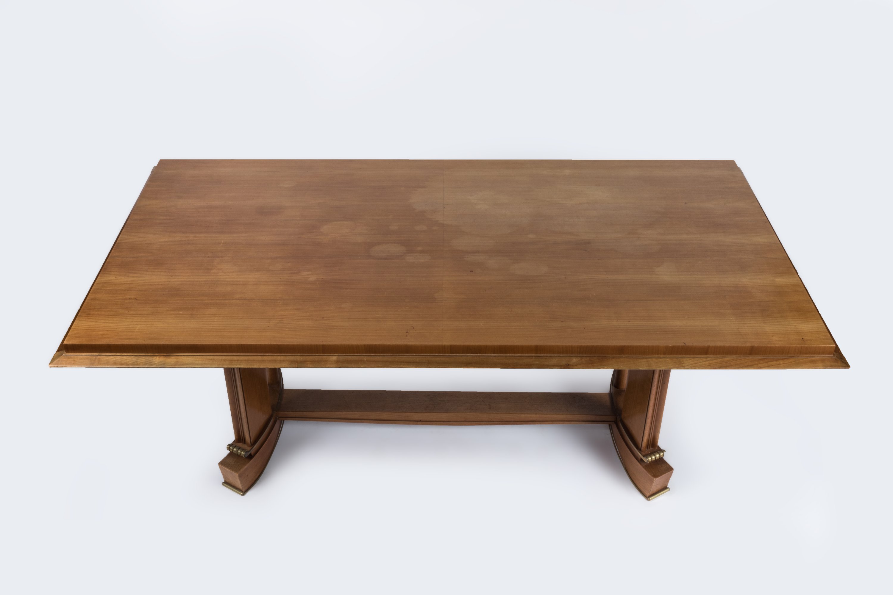 La table rectangulaire, à deux allonges latérales, repose sur deux pieds en patins réunis par une entretoise en H décorée de laiton doré.