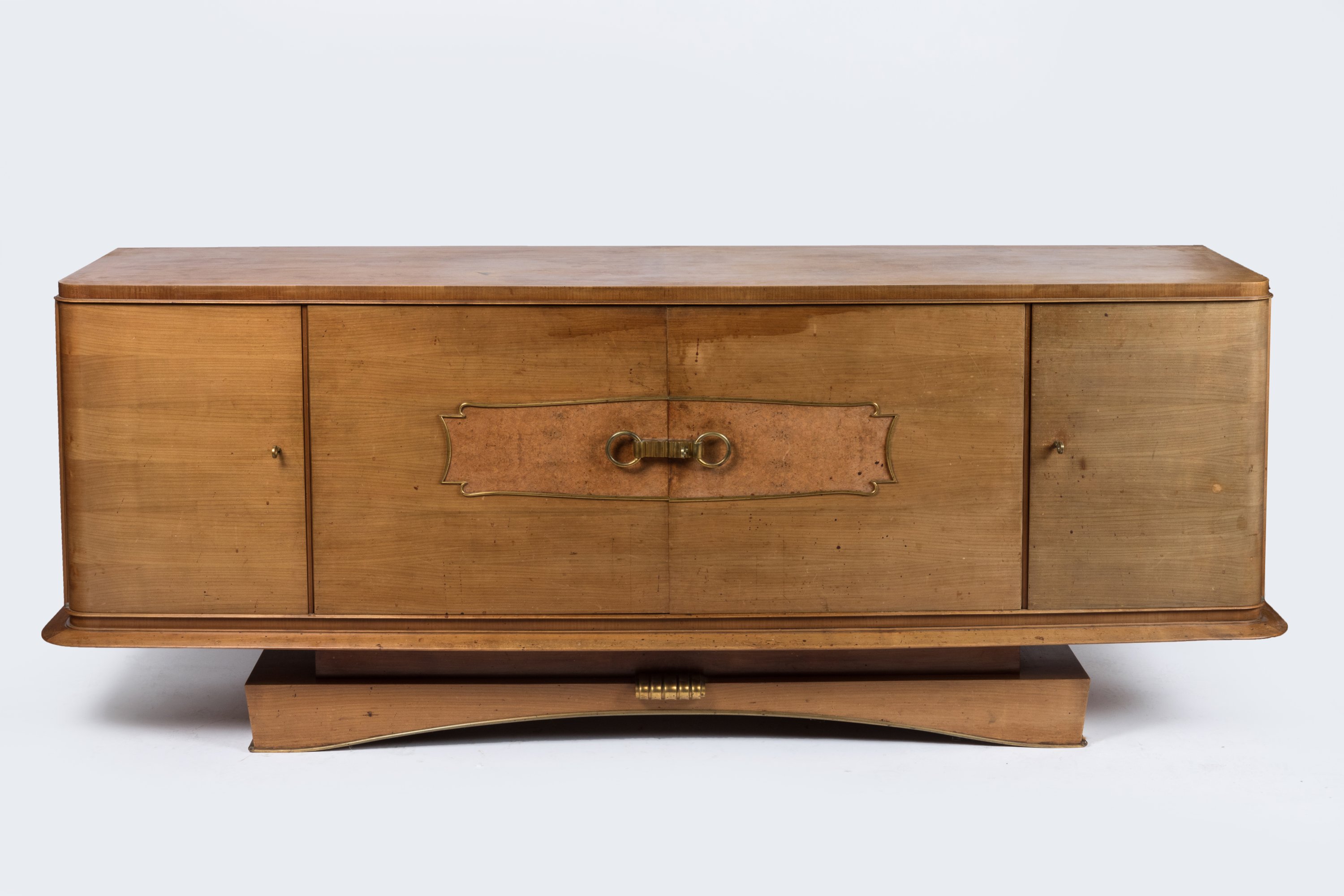 Le buffet en enfilade très légèrement galbée et aux angles supérieurs arrondis ouvre en façade par deux vantaux entourés de deux portes latérales dévoilant trois niveaux d'étagères sur les côtés et deux niveaux d'étagères et trois tiroirs en partie centrale. Il ferme par une importante serrure crénelée, à deux anneaux en laiton doré, entourée d'une plaque de loupe ornementale. Une corniche surplombe le piétement mouvementé décoré d'un motif de laiton doré en volute.