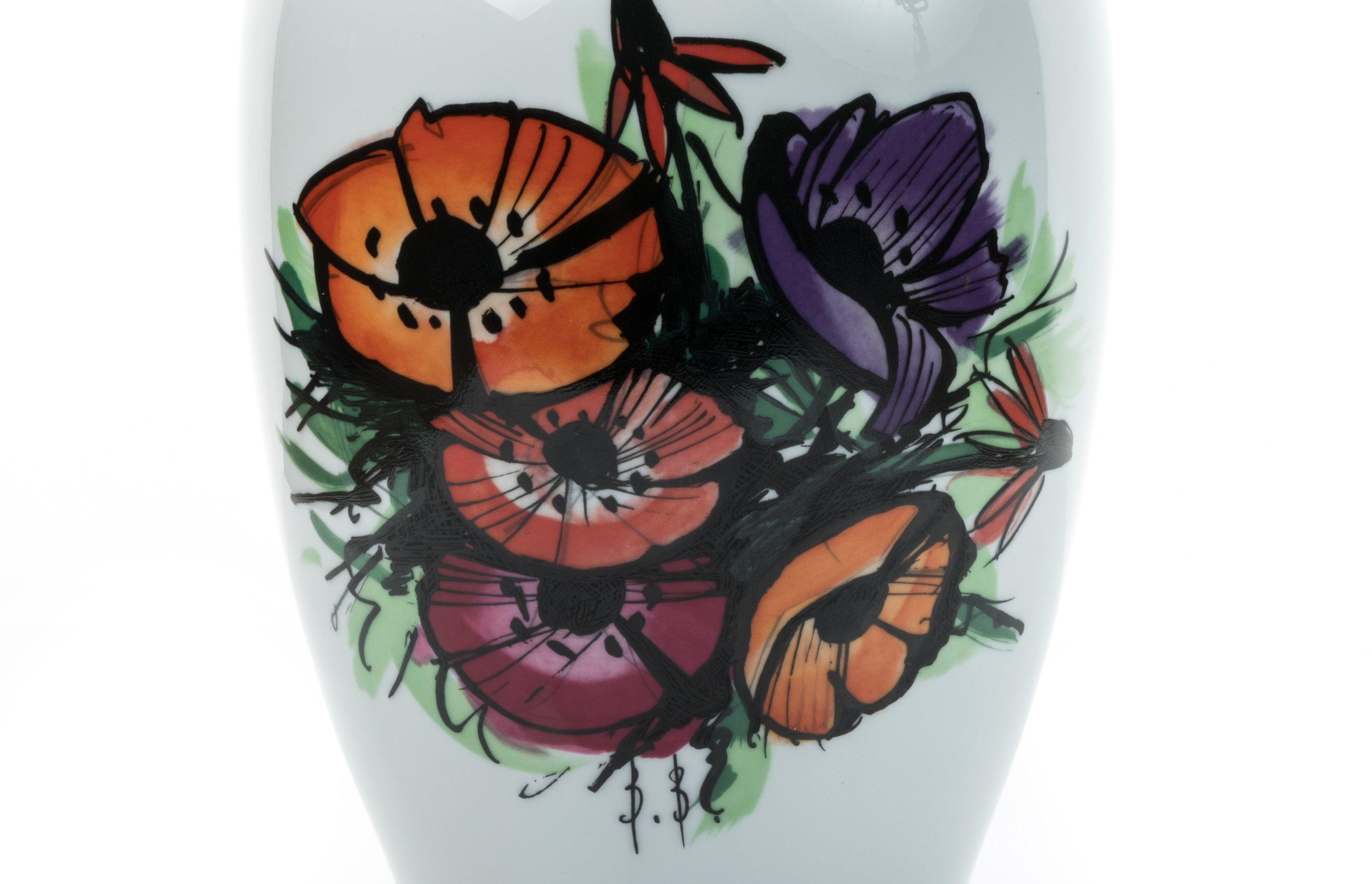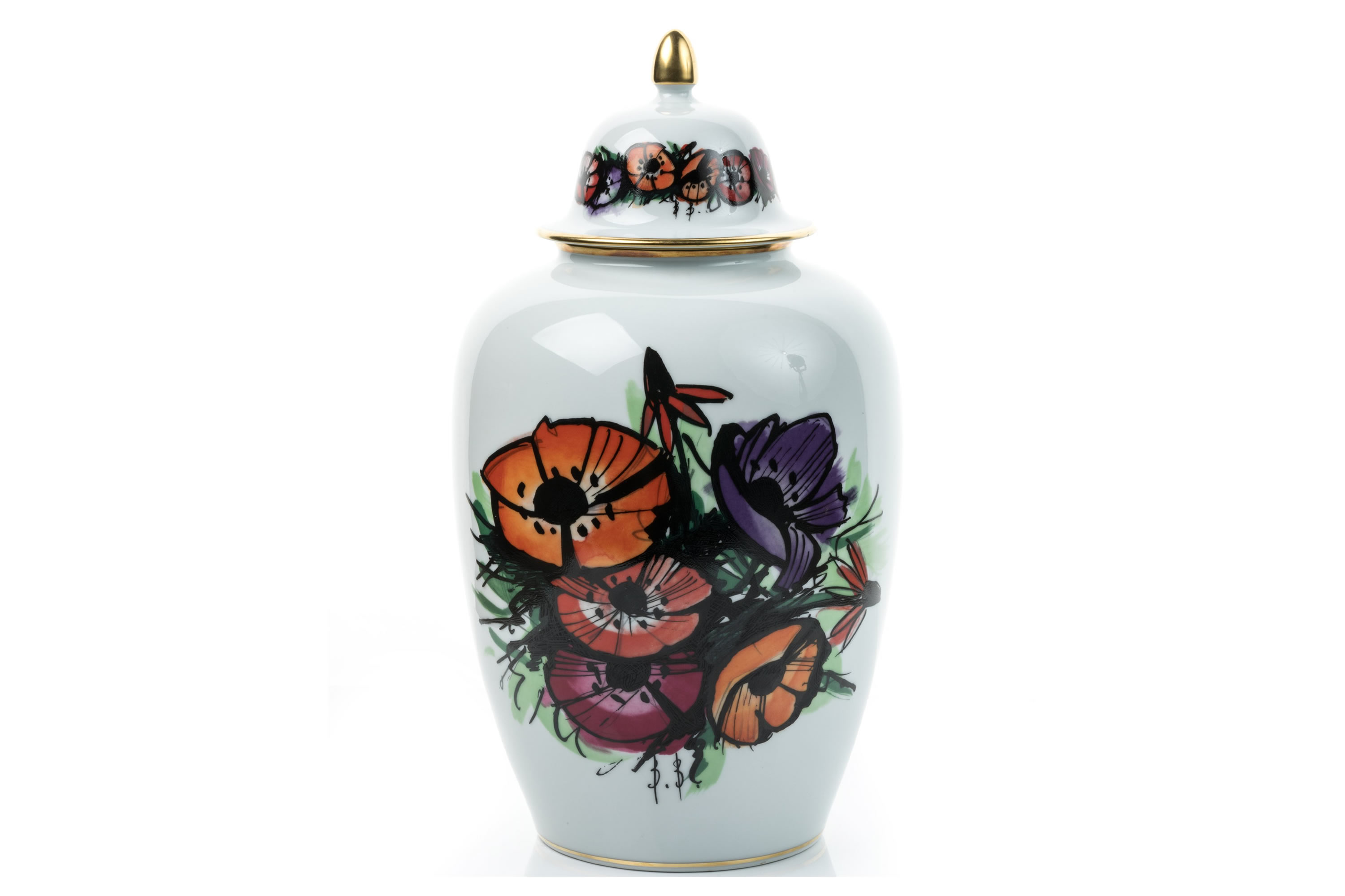 en porcelaine blanche au décor floral polychrome, rehaussé d'or sur la base, la lèvre et le couvercle. Titré "Les Anémones" sous la base et monogrammé "B.B." Signé.