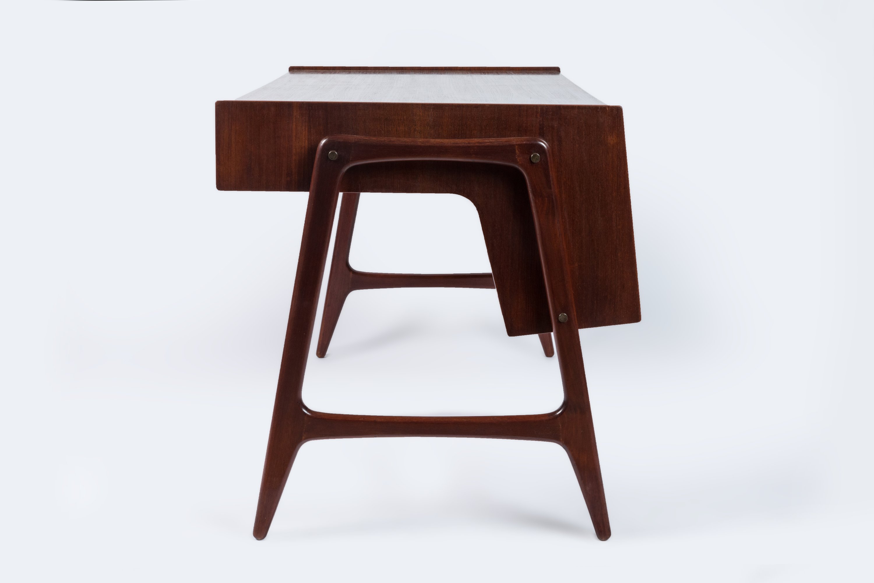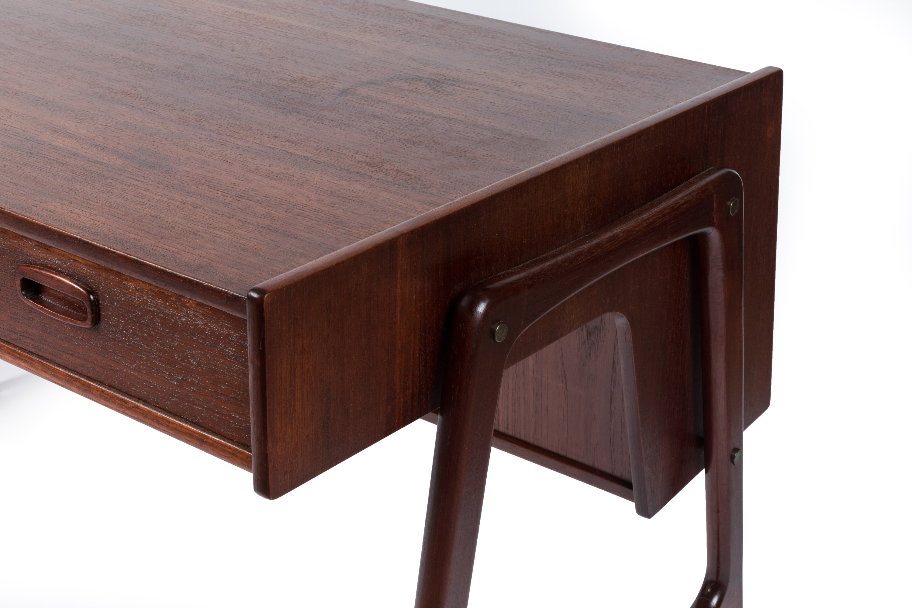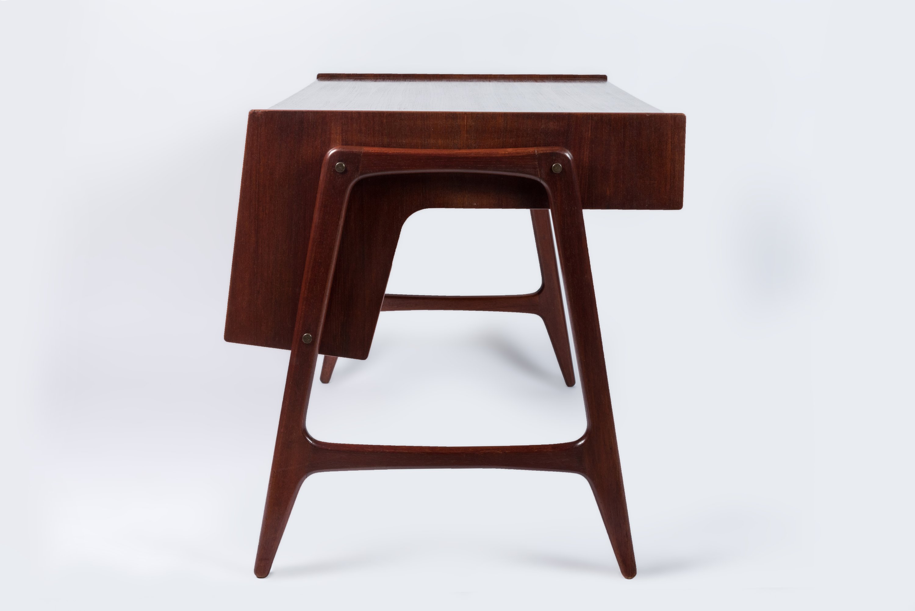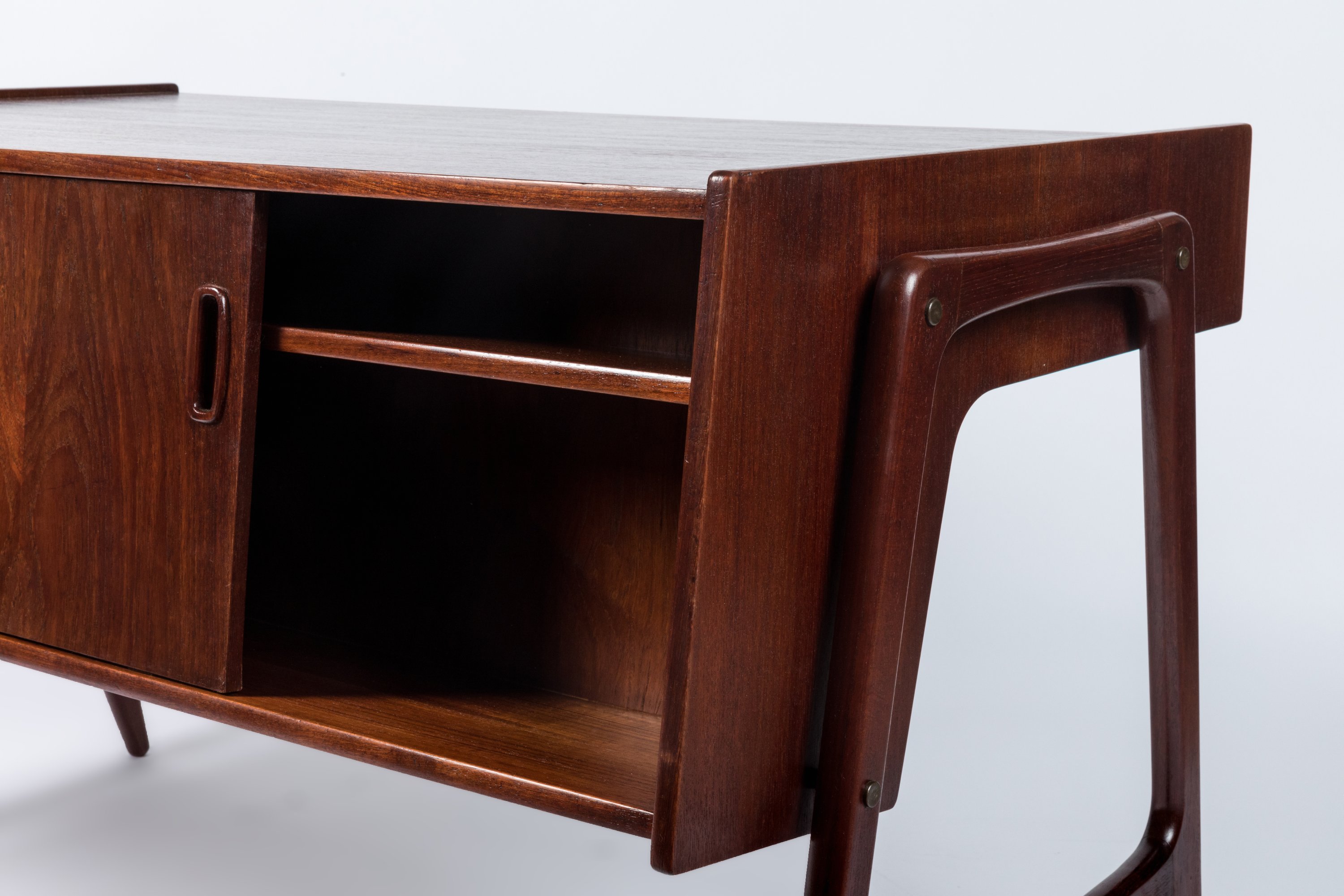 en teck. La ceinture ouvrant par trois tiroirs, la façade ouverte par une étagère fermant par une porte coulissante.