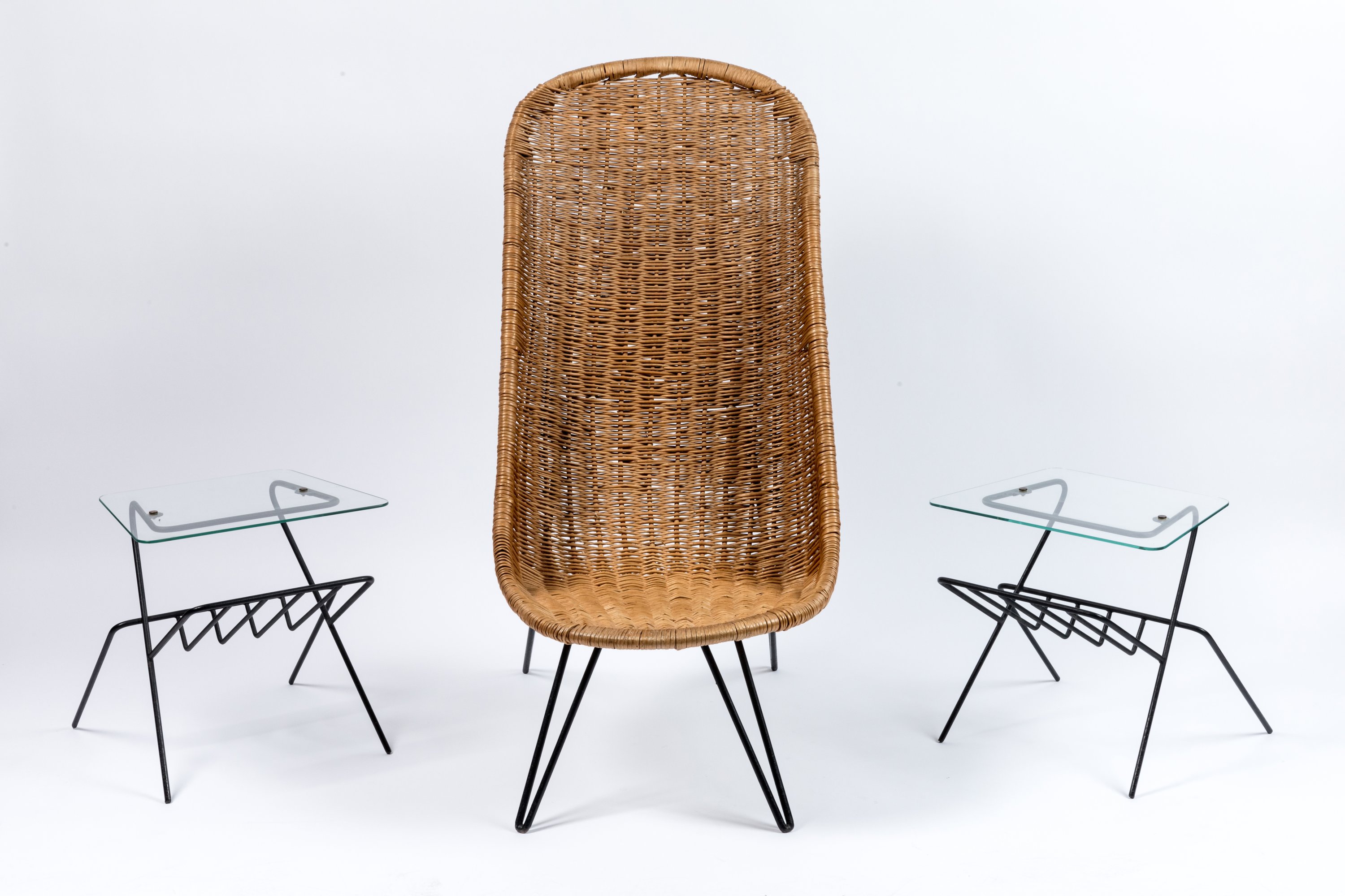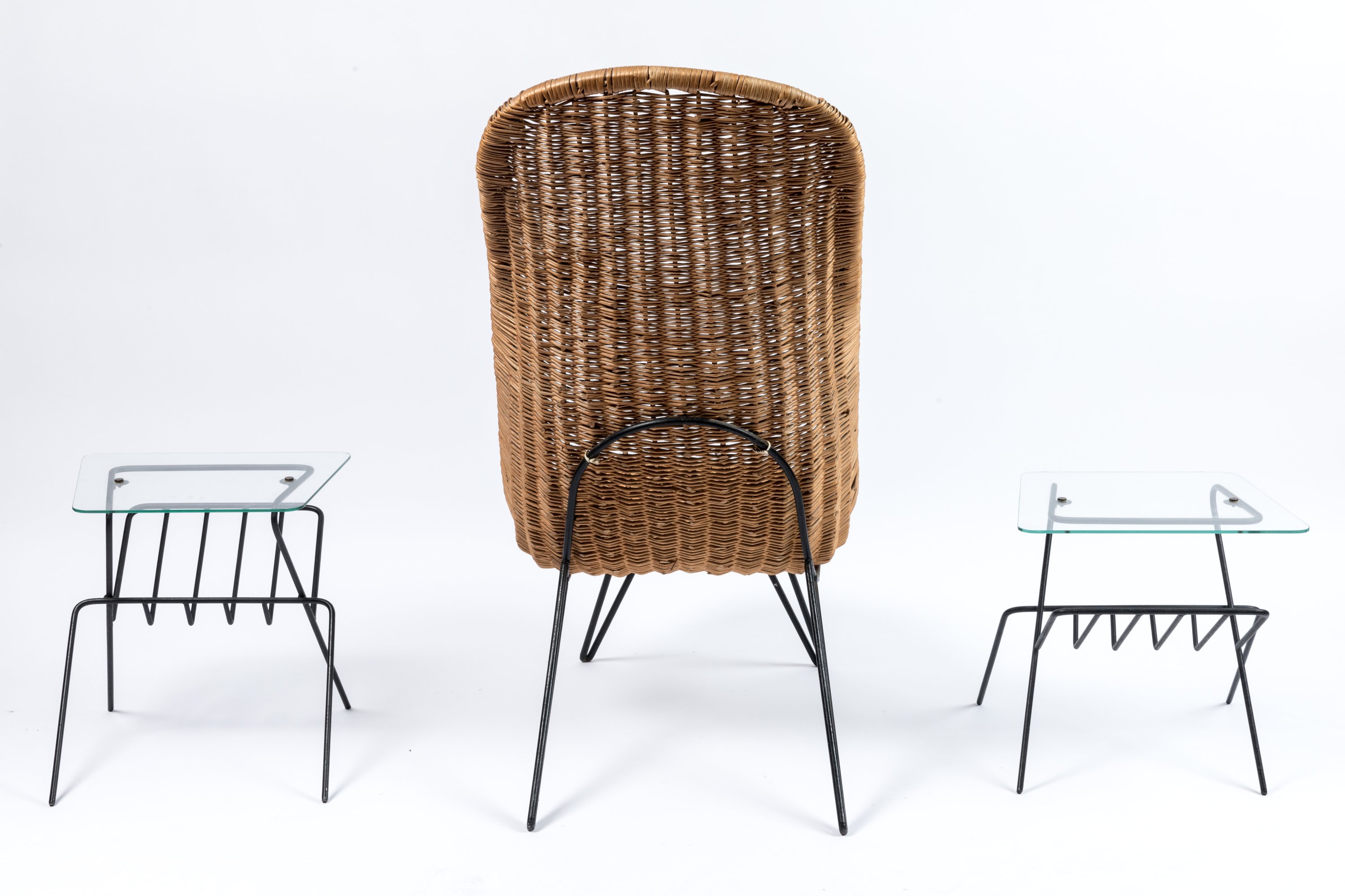 en rotin tressé et piétement tubulaire laqué noir.