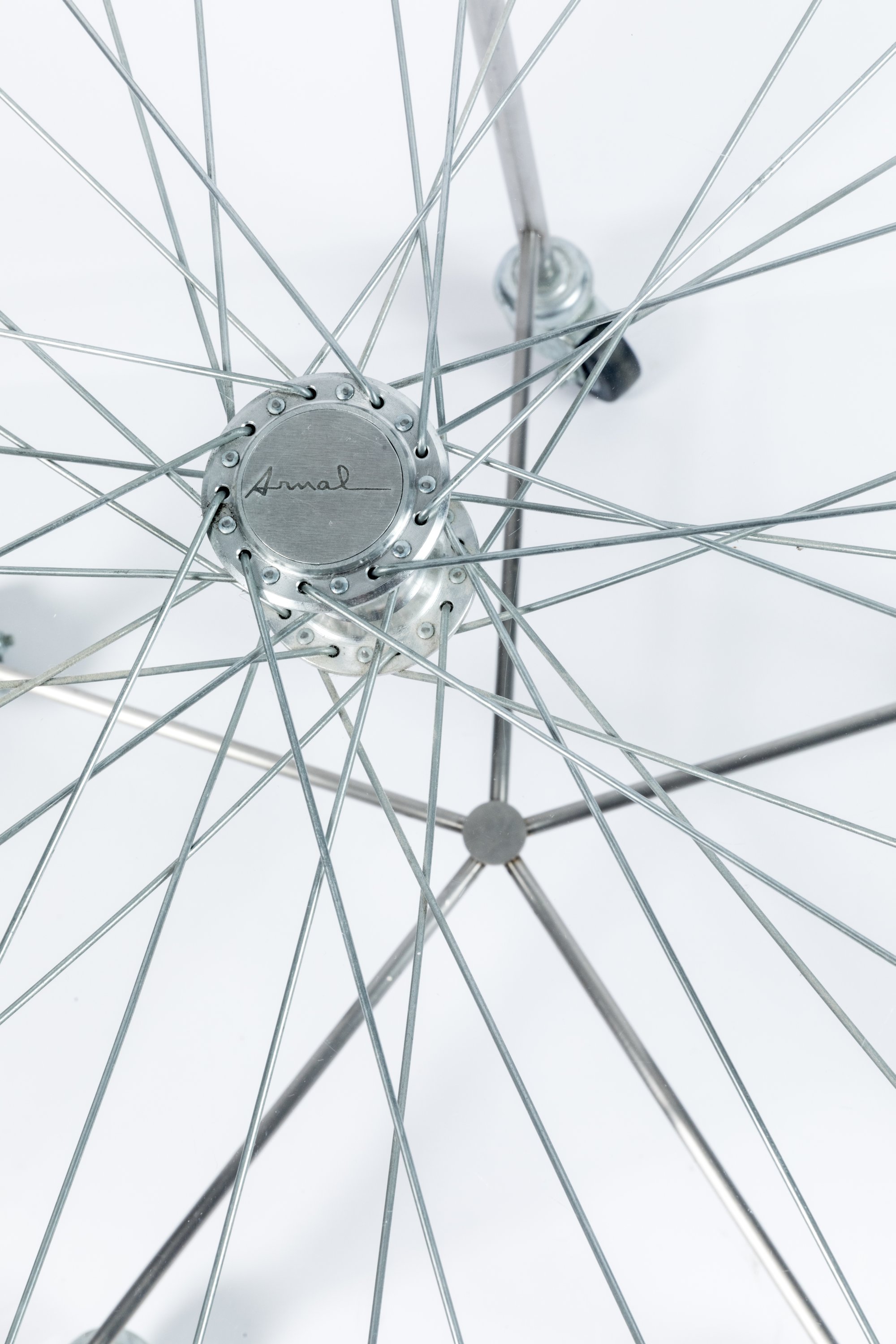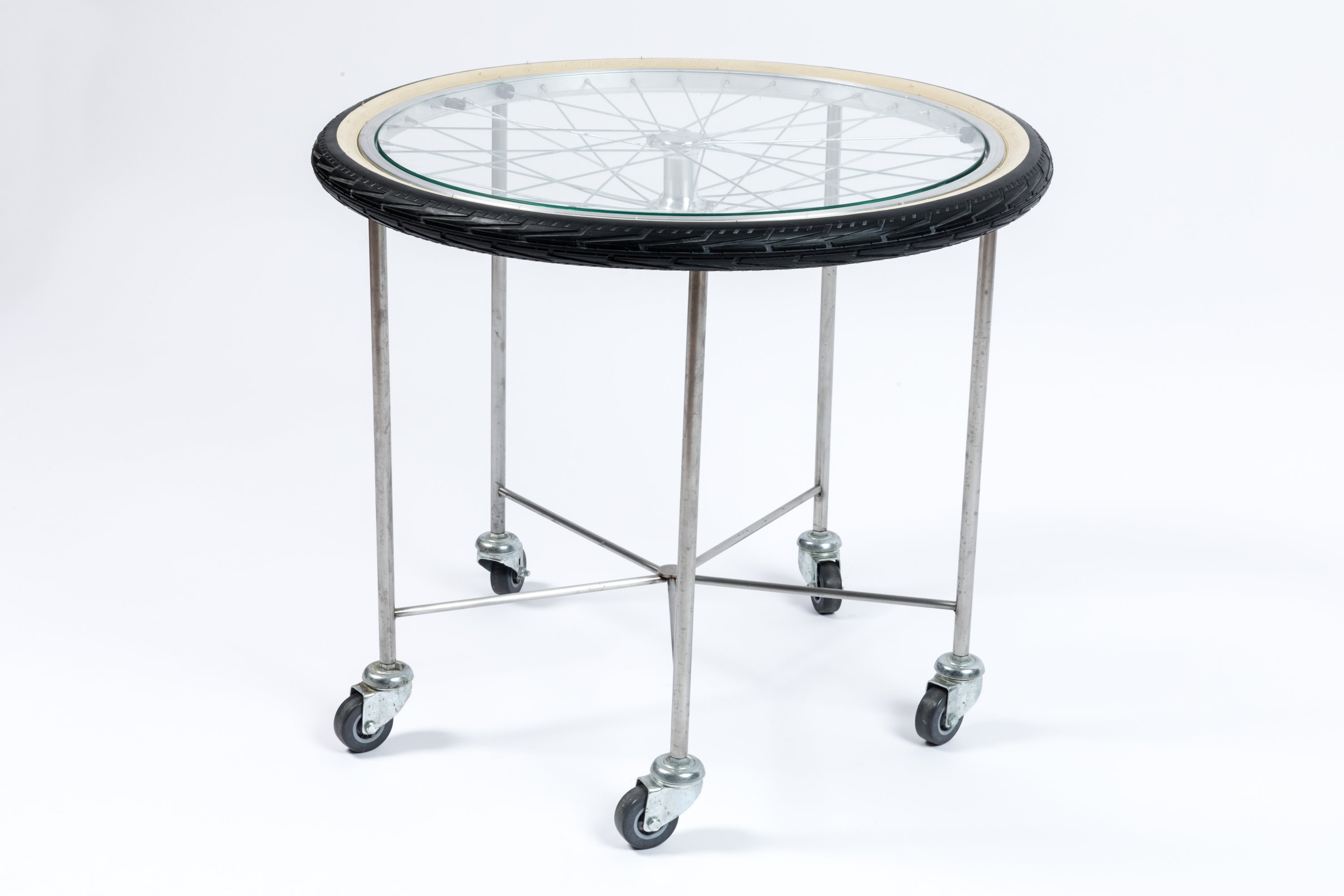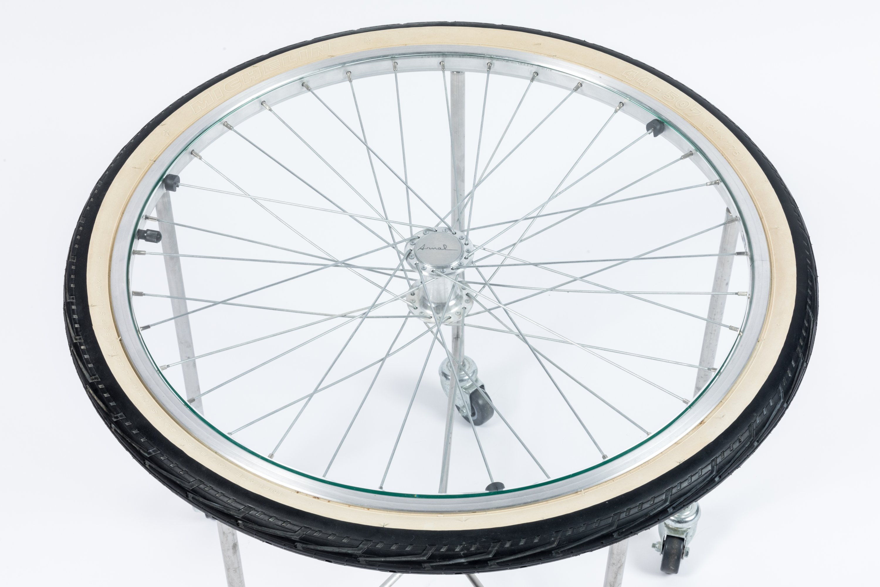 Roue de bicyclette reposant sur cinq pieds à roulette en acier inoxydable. Plateau de verre securit.
