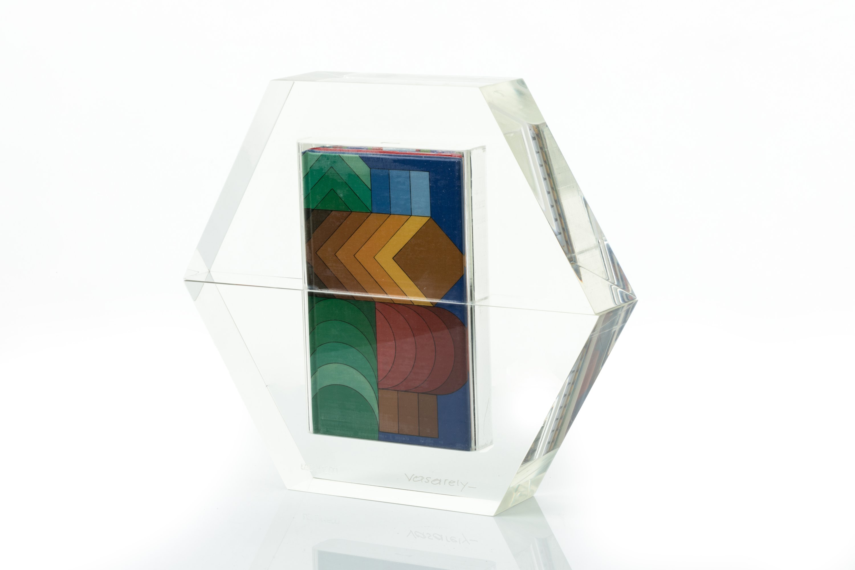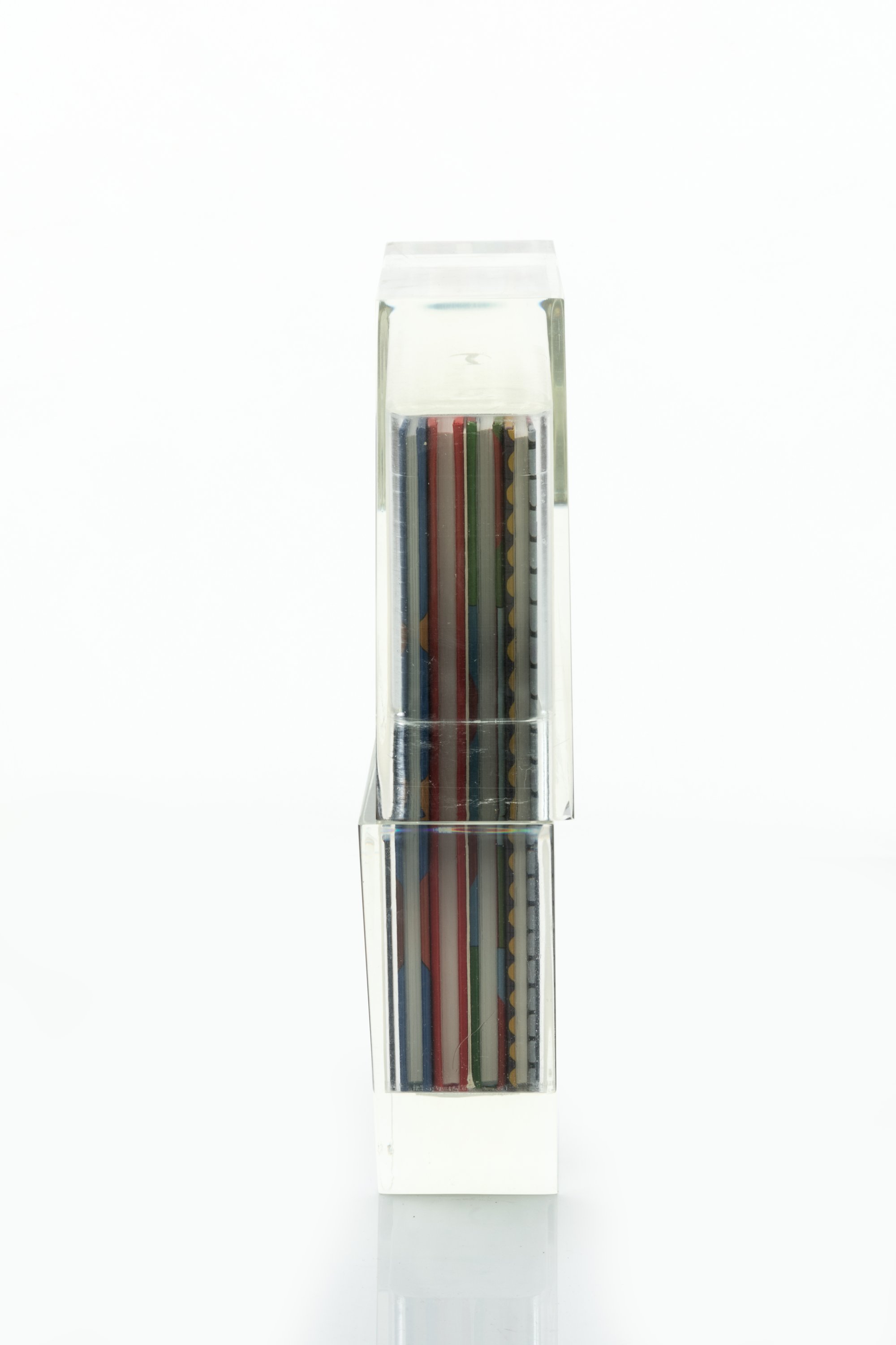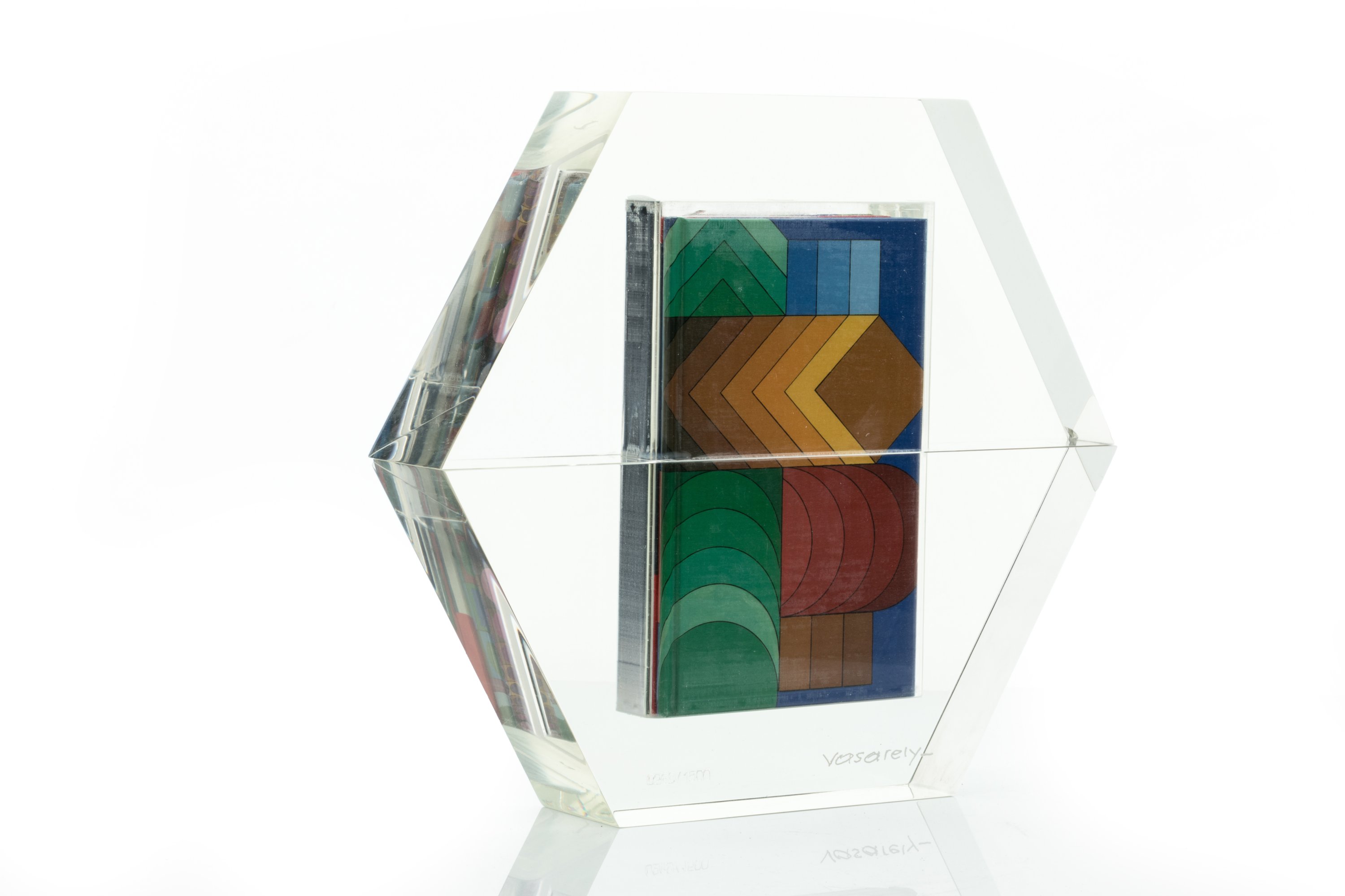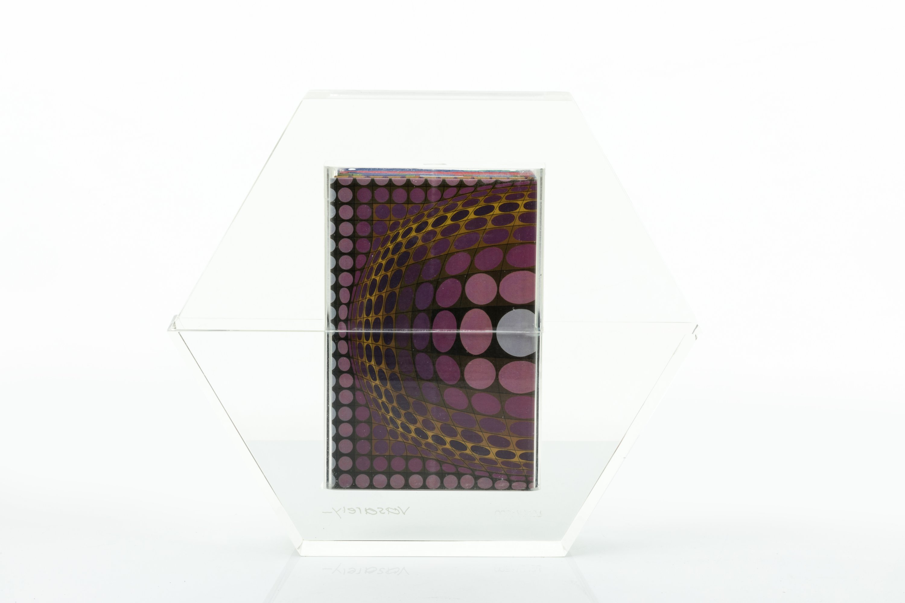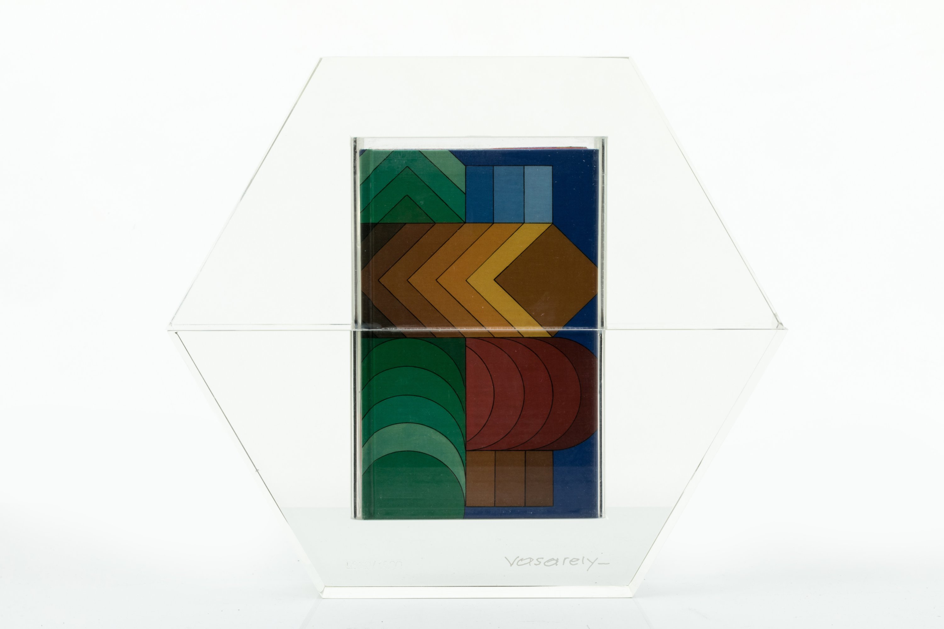 Livre-objet dans un étui en plexiglas contenant quatre livres, numéroté en bas à gauche 0269/1500 et signé en bas à droite "Vasarely".