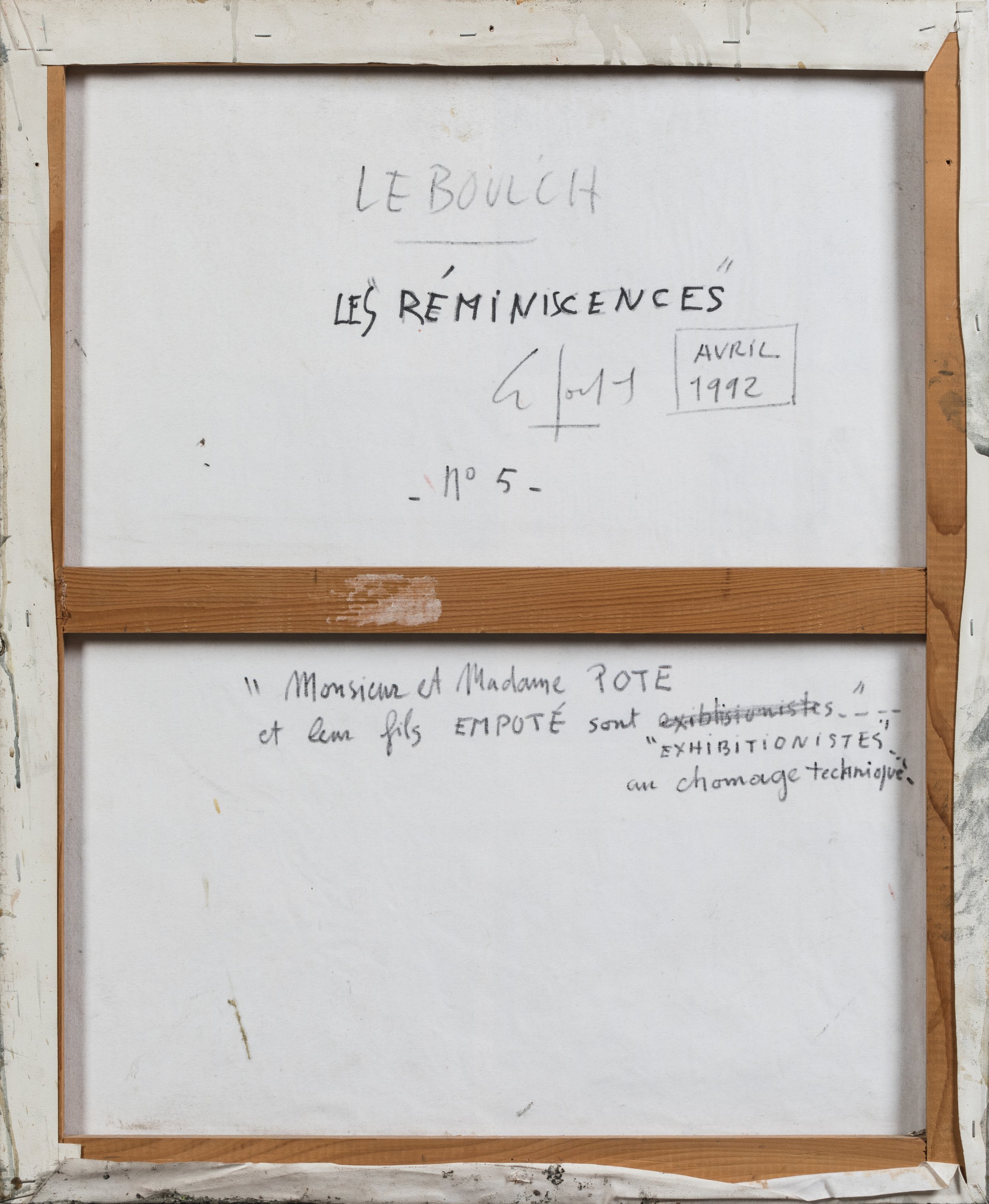 Technique mixte datée avril 1992 avec la suite du titre "Monsieur et Madame Pote et leur fils Empoté sont exhibitionnistes au chômage technique".
