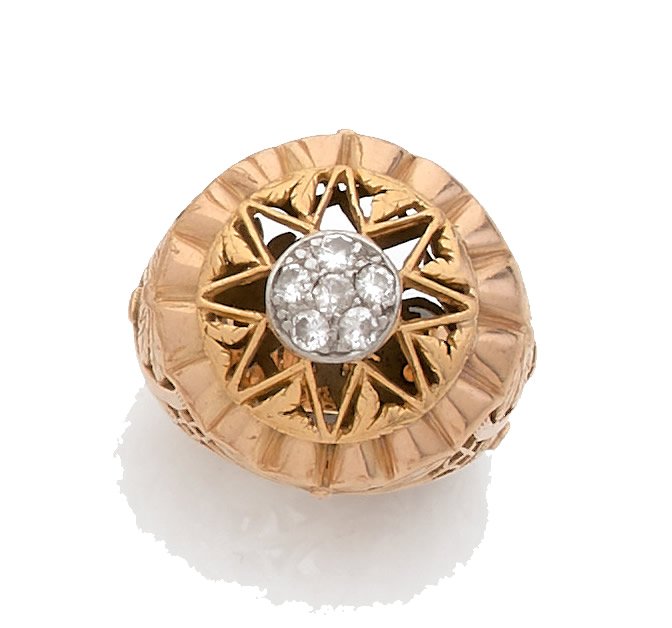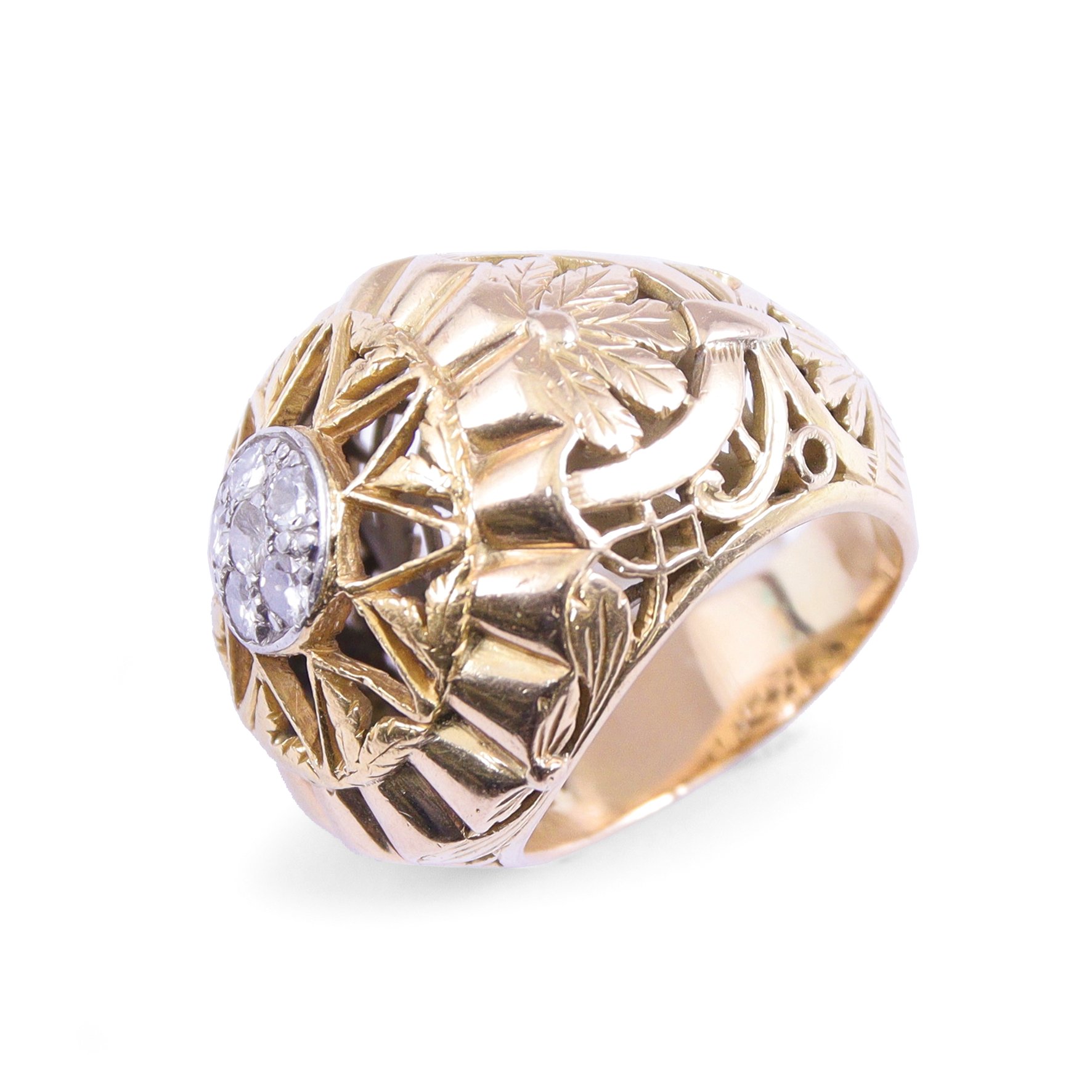 Bague boule en or jaune 750 millièmes gravé à décor de feuillage, le centre ajouré et orné d'un petit pavage de diamants ronds de taille brillant.
