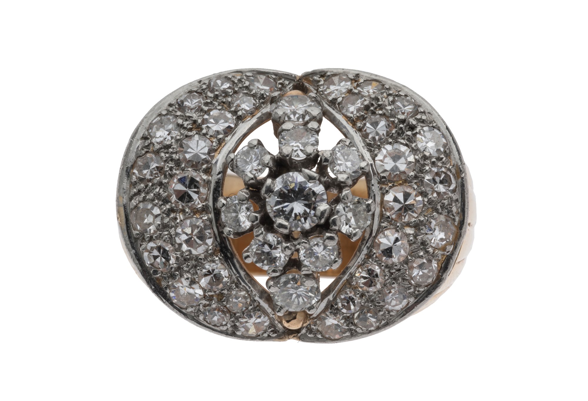 Bague en or jaune 750 millièmes et platine 850 millièmes gravés à décor de godrons, le centre ajouré entièrement serti de diamants ronds taillés en huit-huit et de taille brillant.