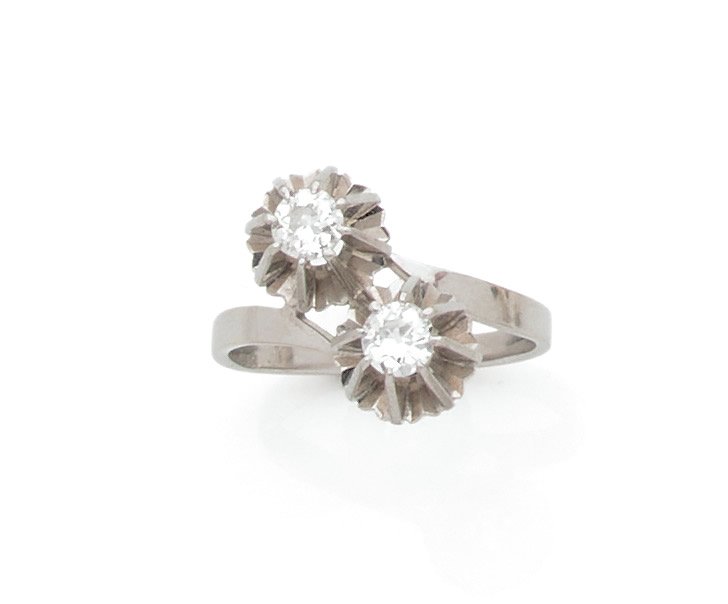 Bague "Toi & Moi" en or gris 750 millièmes et platine 850 millièmes, ornée au centre de deux diamants ronds de taille ancienne.