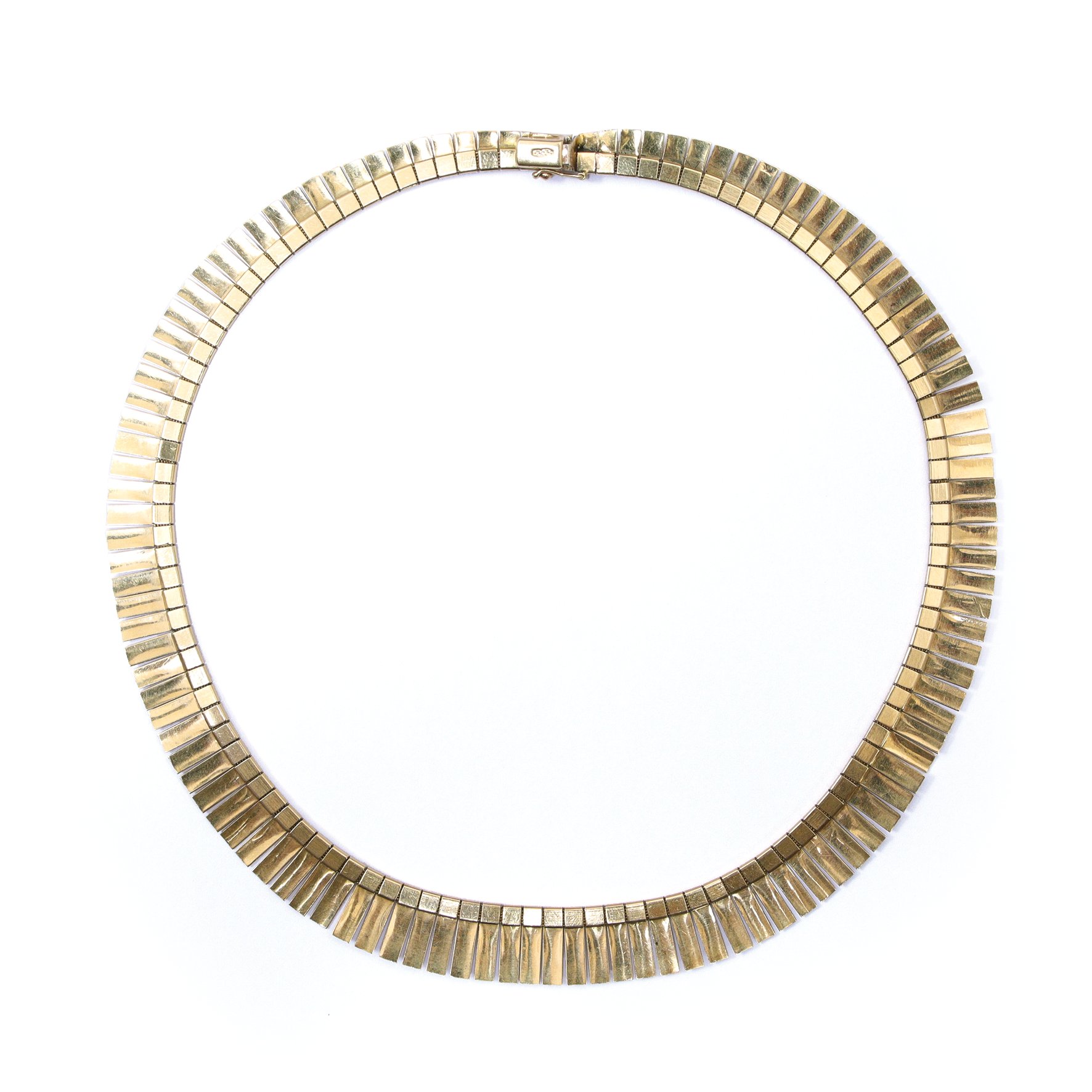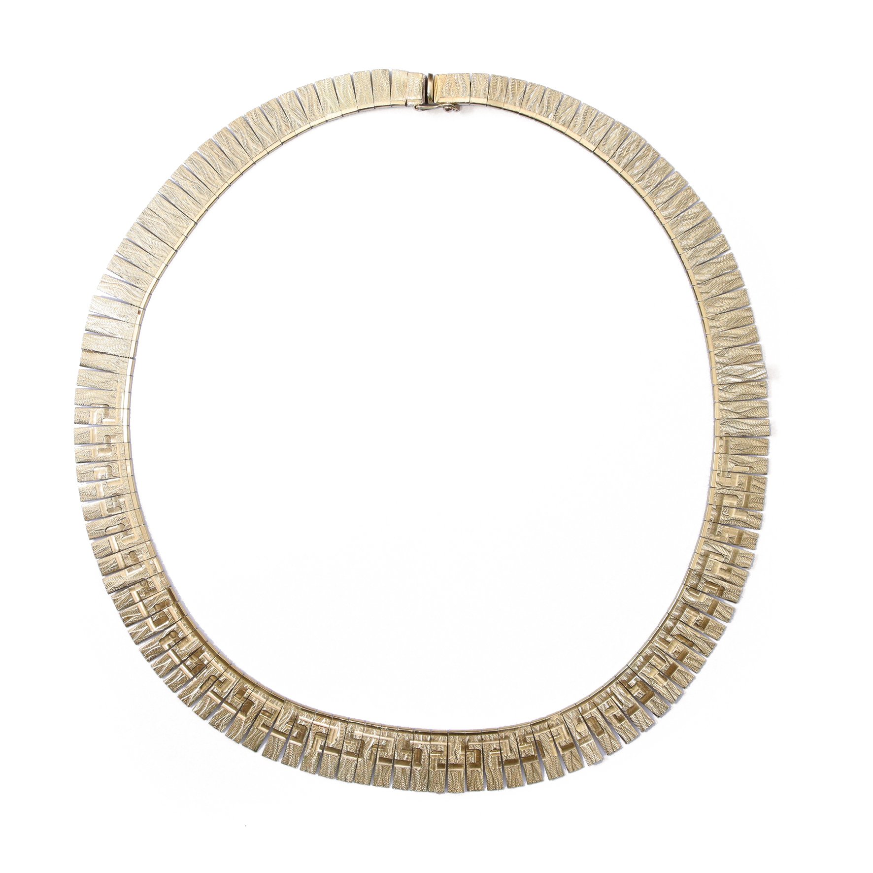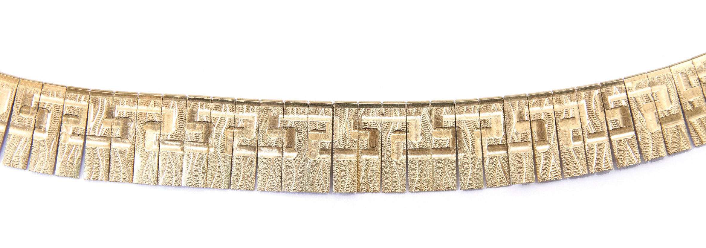 Collier articulé en or jaune 750 millièmes, les maillons de forme rectangulaire en chute entièrement gravés, ceux du centre décorés d'une frise grecque.