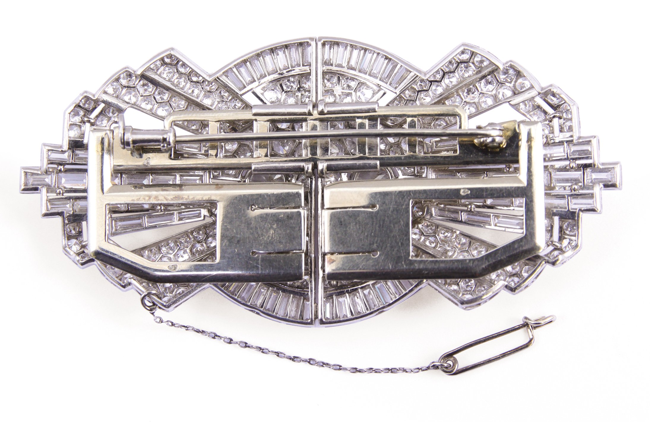 Broche formant double clip en platine 850 millièmes, les mécanismes en or gris 750 millièmes, de forme ovale à décor rayonnant entièrement sertie de diamants ronds, deux d'entre eux au centre plus importants serti-clos, et de diamants baguette.