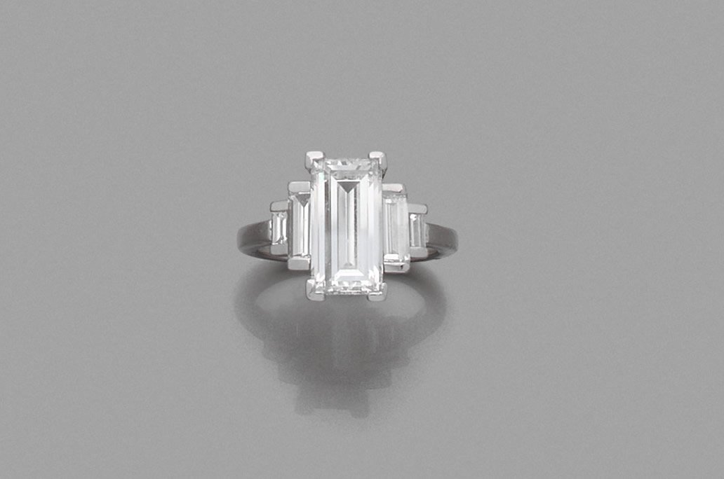 Bague en platine 850 millièmes ornée au centre d'un diamant rectangulaire entre quatre diamants baguettes.