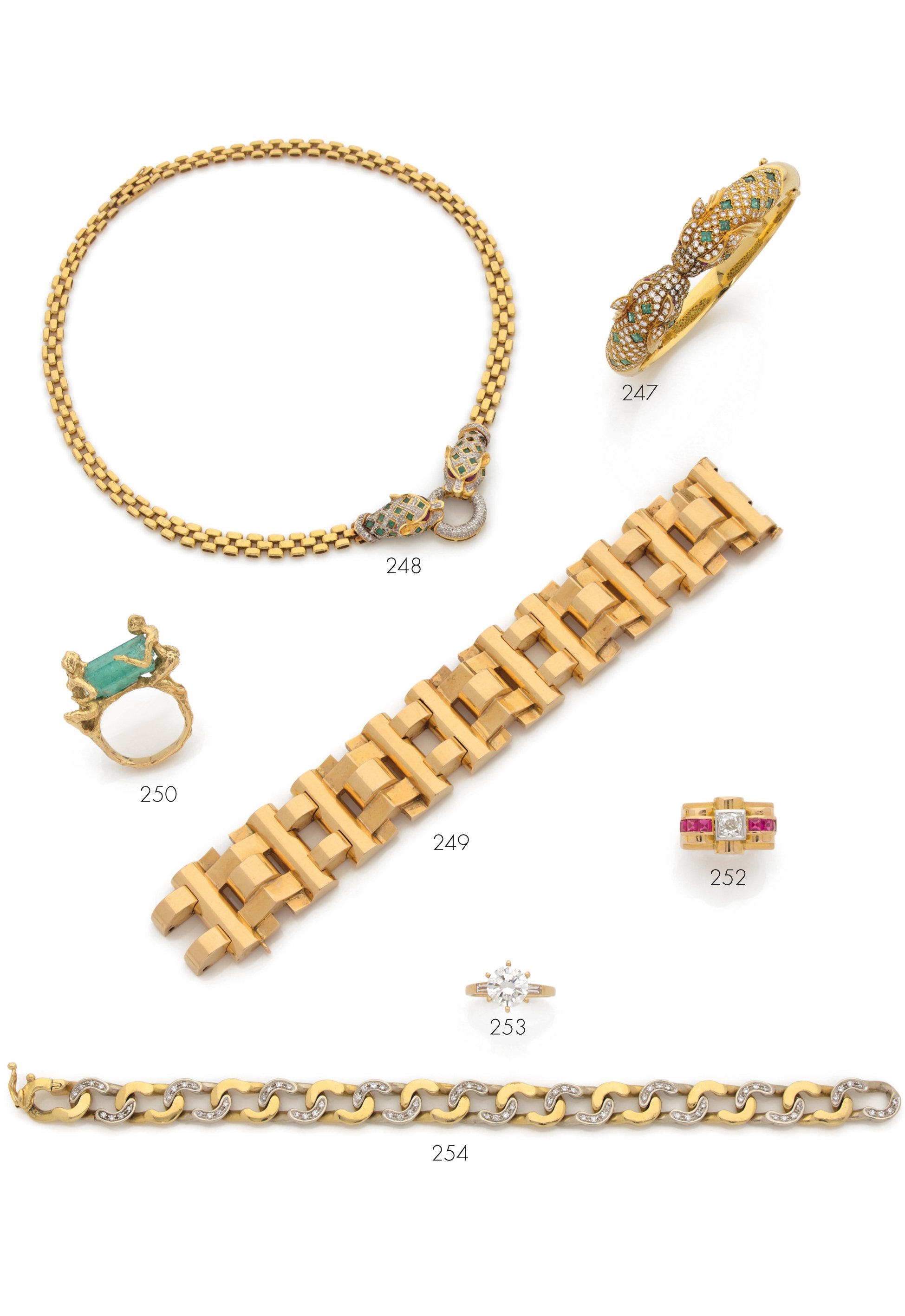 A diamond, ruby and red lab-created stone in 18k yellow gold.