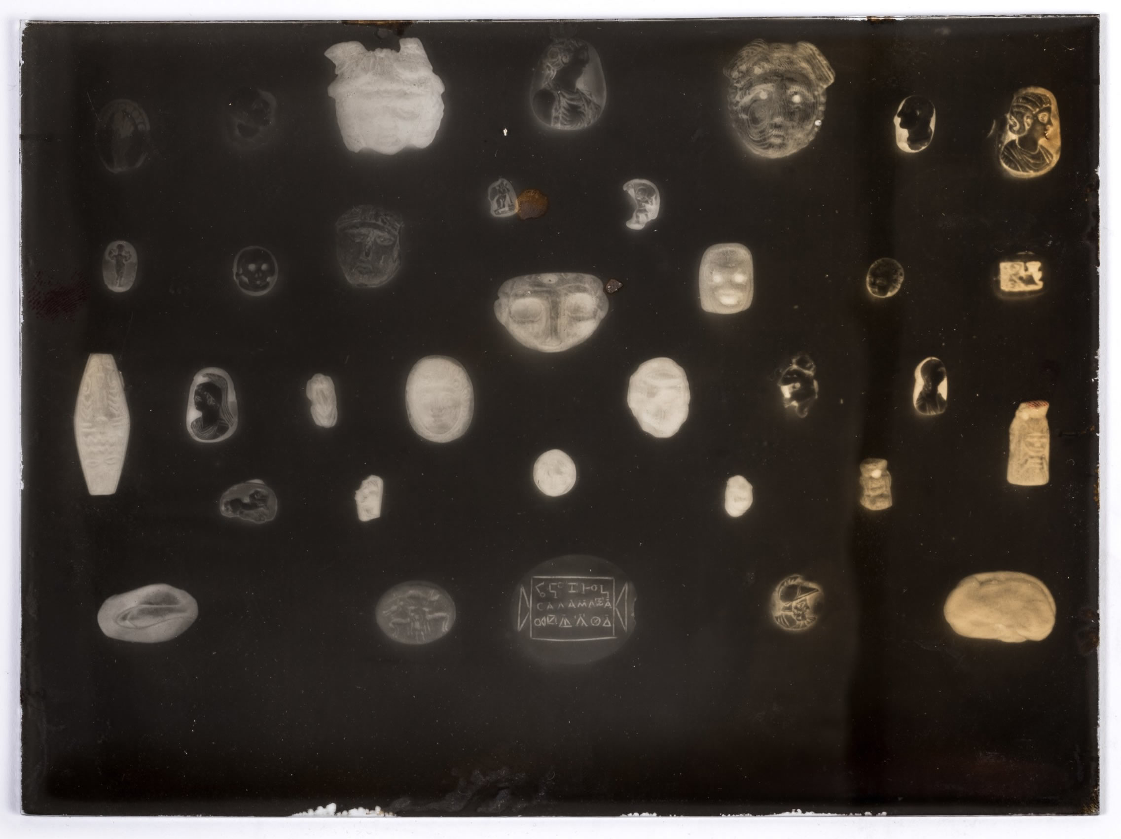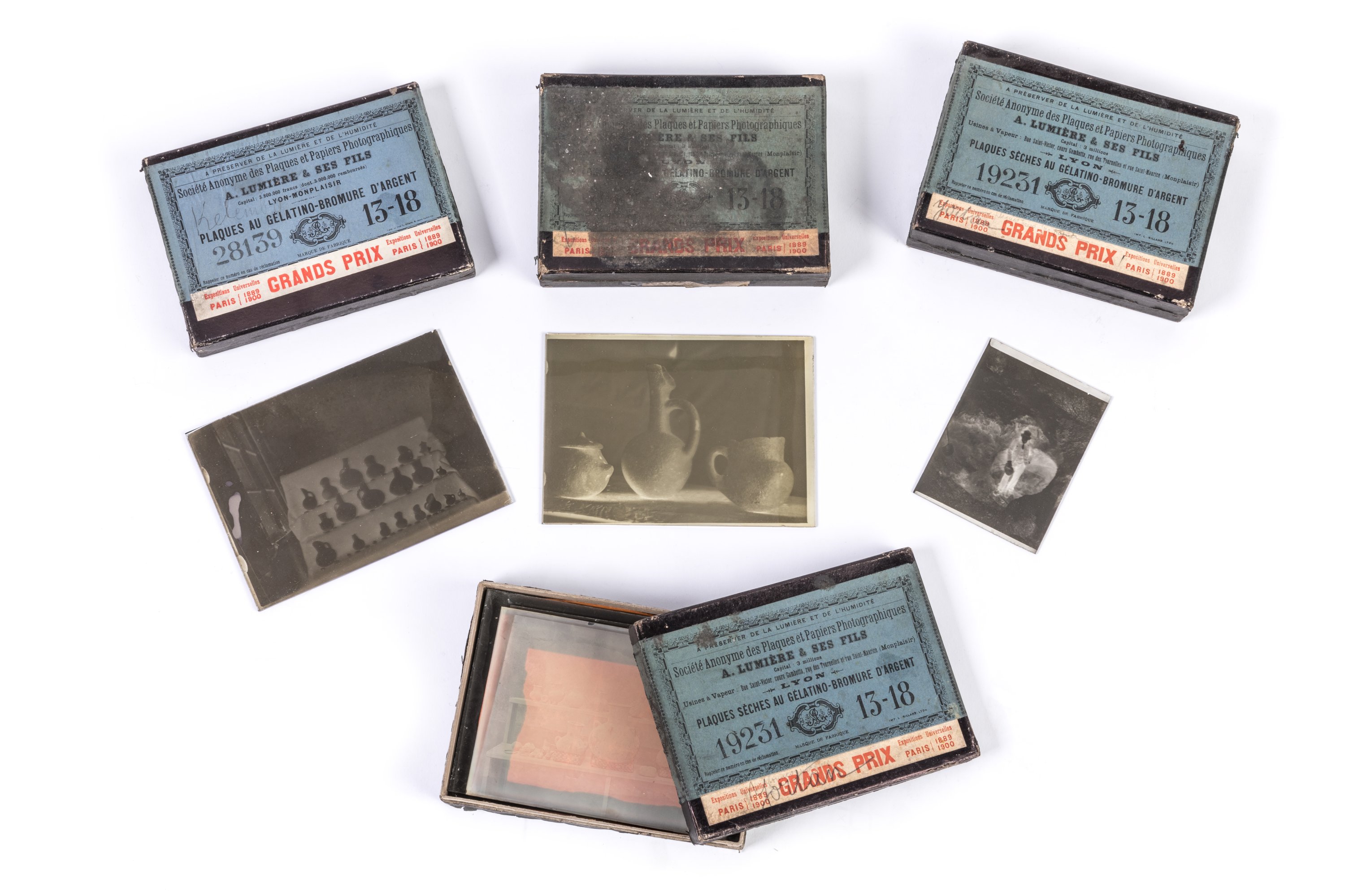 42 plaques de verre photographiques présentant quelques vues des fouilles et, surtout, des vases et des objets exhumés. Il sagit de négatifs au format 13x18 cm ou inférieur contenu dans quatre boites. Quelques plaques cassées ou abimées.
