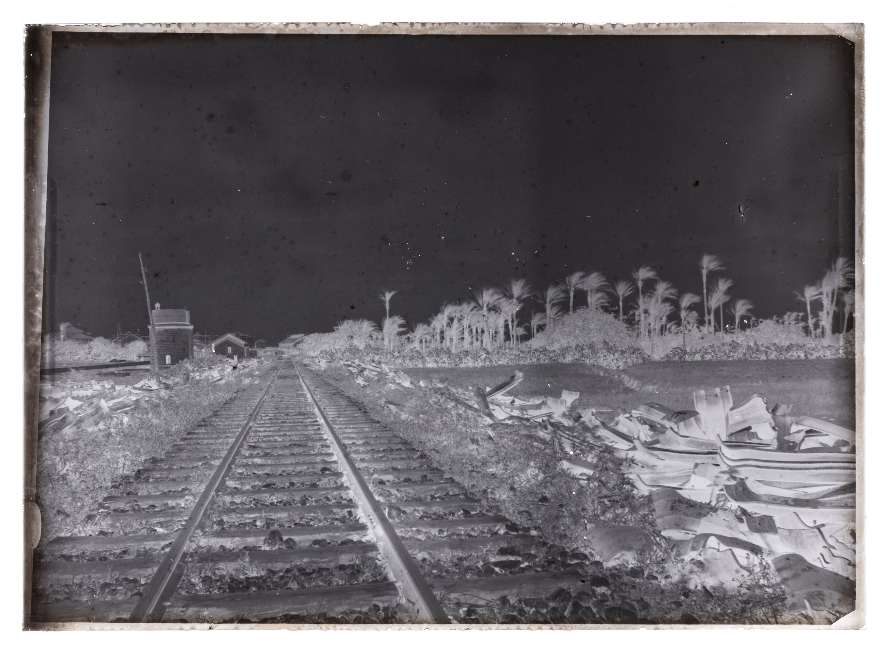 - une boîte au format 13x18 cm: quatre plaques: dont une vue de voie ferrée avec palmiers et quelques bâtiments à lhorizon,