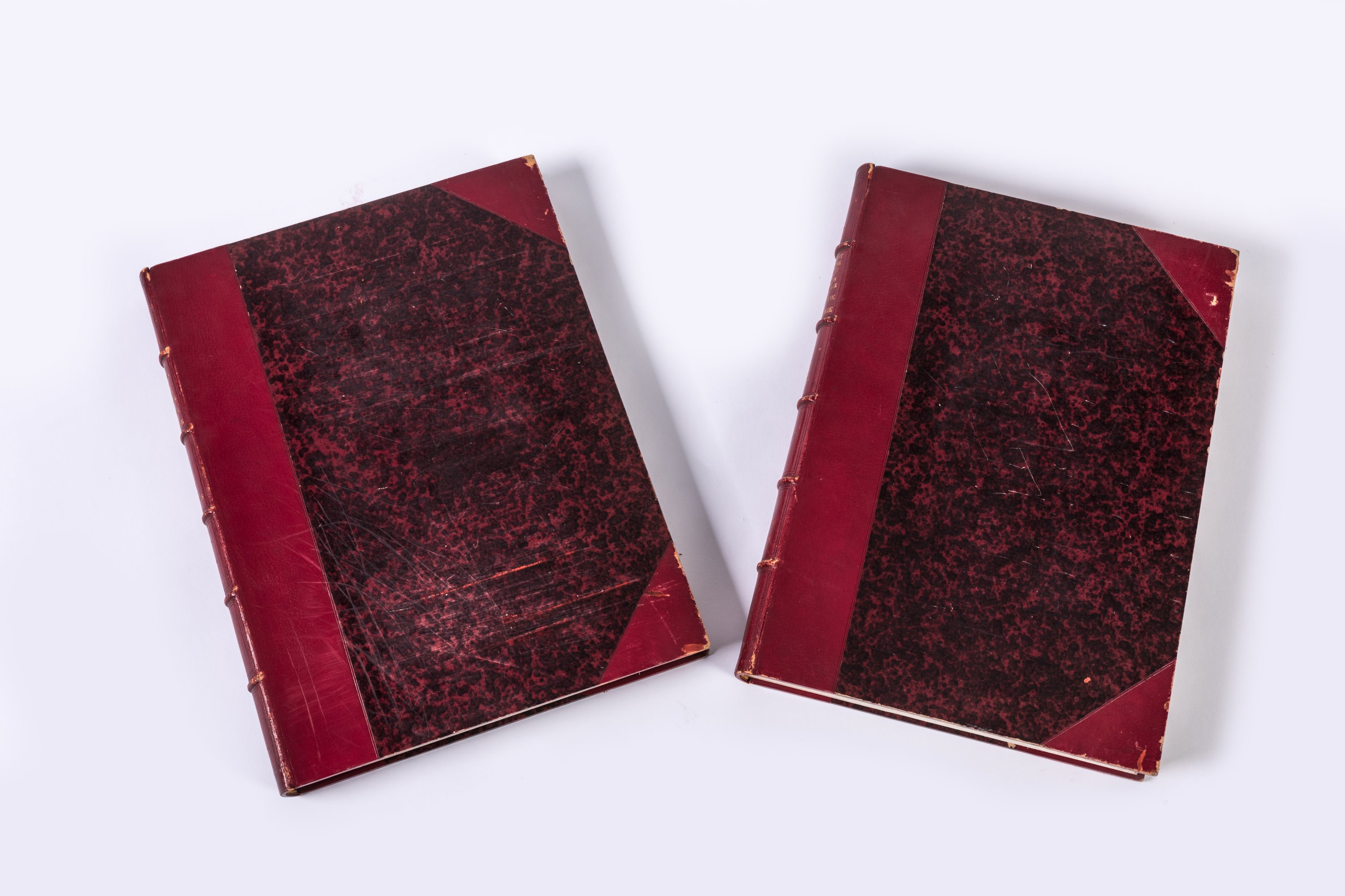 Très bel exemplaire de la première édition de cette œuvre magistrale, en deux volumes in-folio (vol. 1, texte, 392 p. et vol. 2, planches, 80 pl. dont superbes photolithographies selon le procédé Poitevin, 7 cartes en demi-chagrin rouge à coins, dos à 5 nerfs et caissons à froid avec titre et tête dorés.