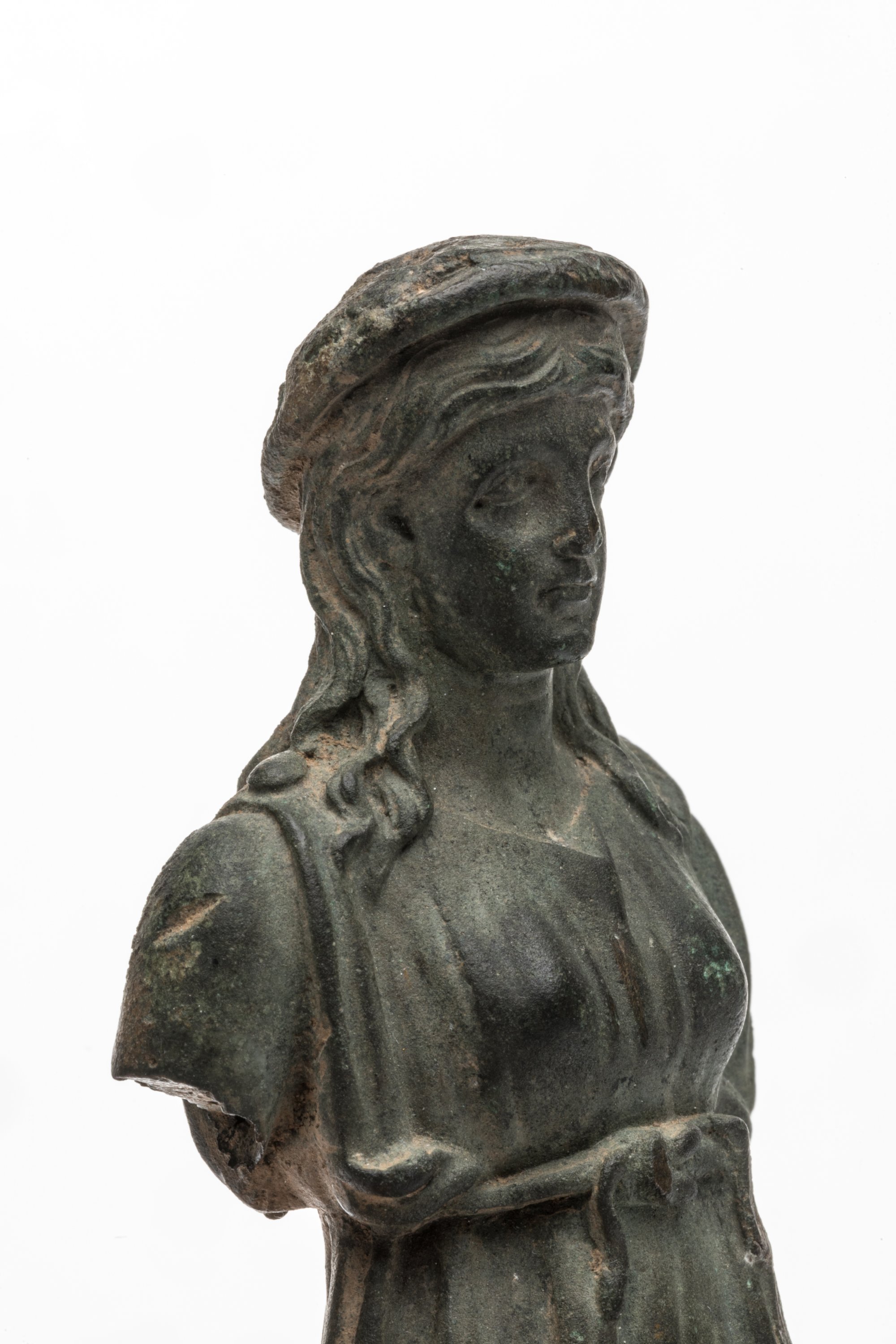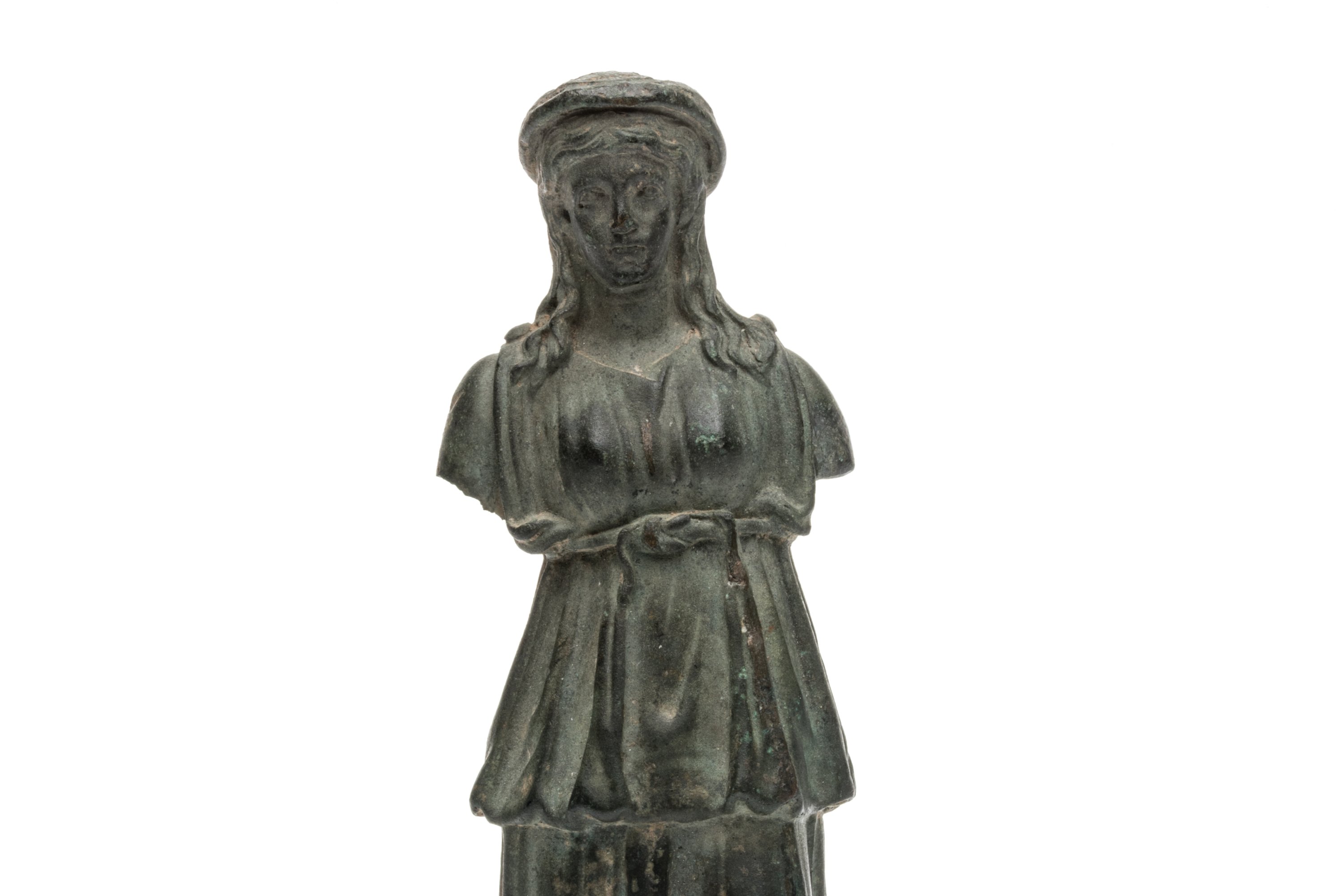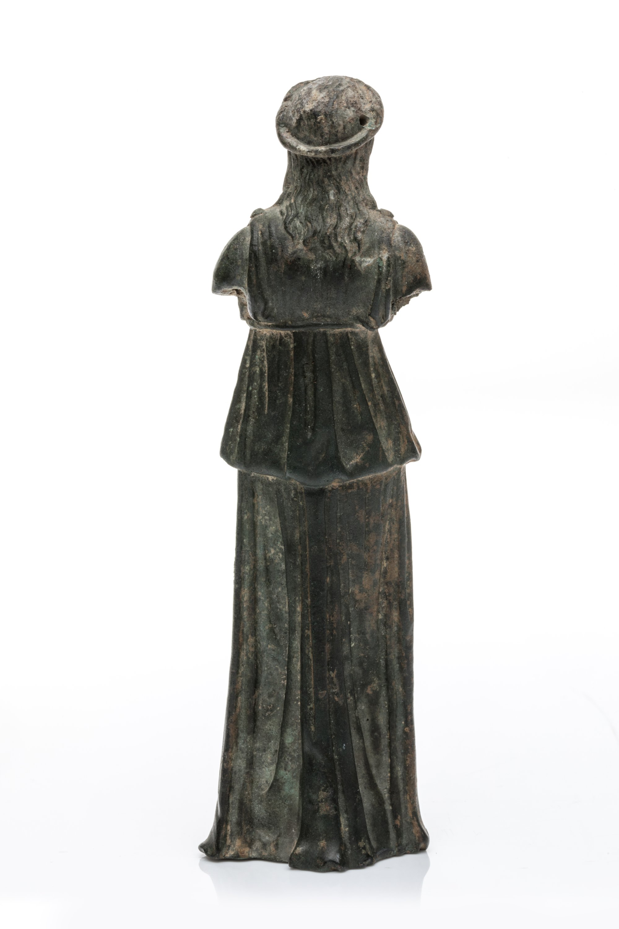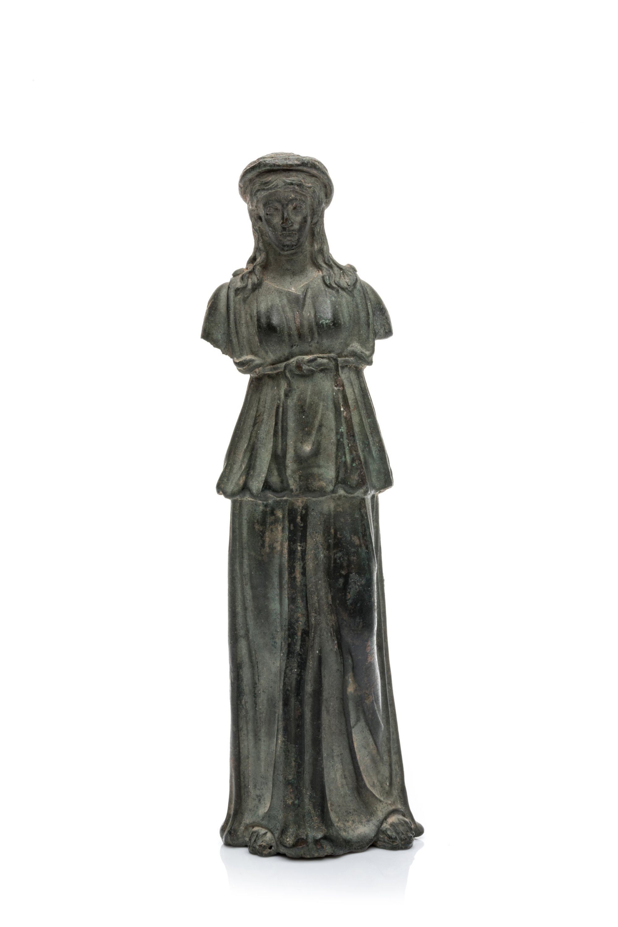 en bronze. Une femme vêtue d’un péplos, les cheveux retombant sur les épaules et la tête ceinte d’une couronne. Fonte creuse à la cire perdue.
