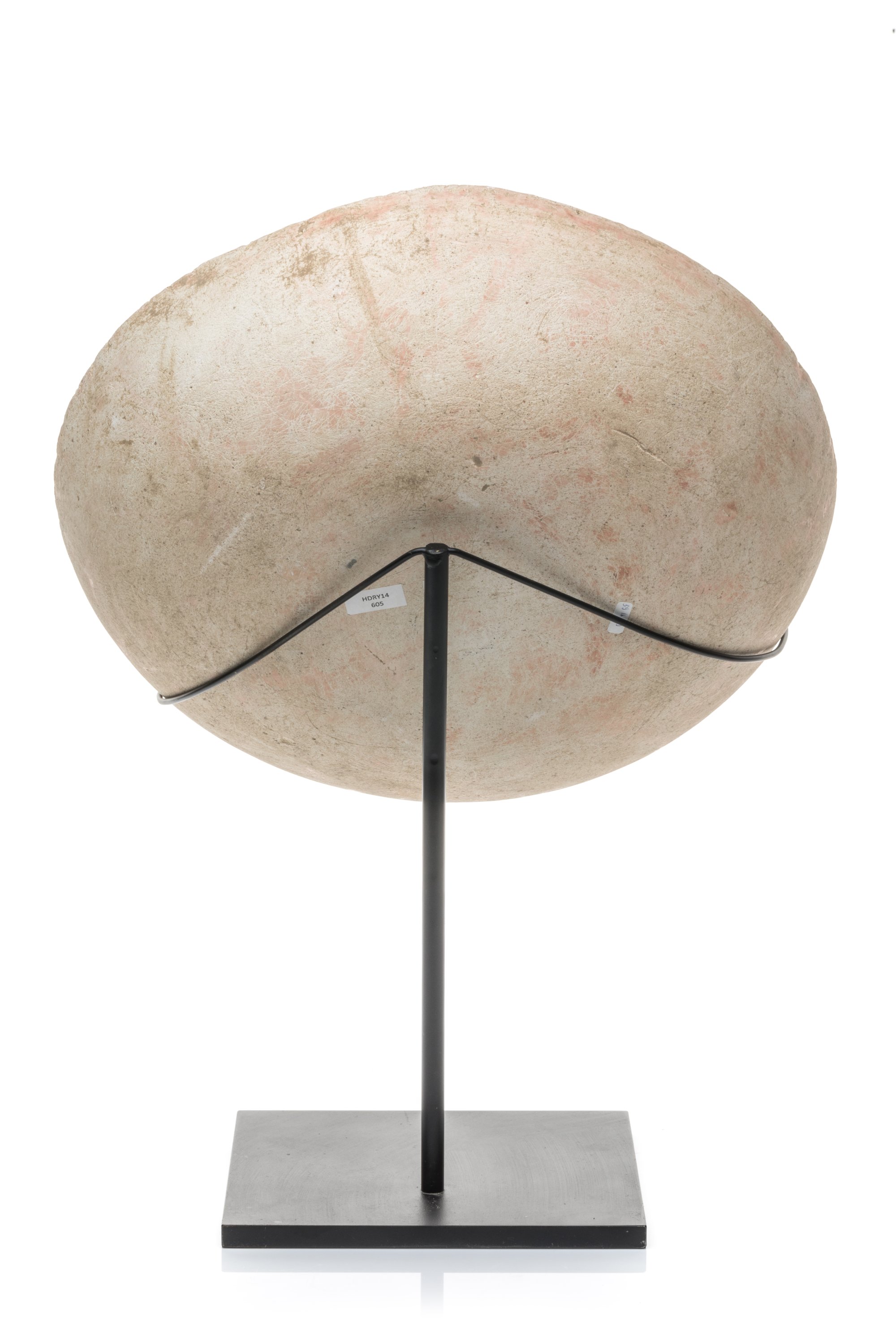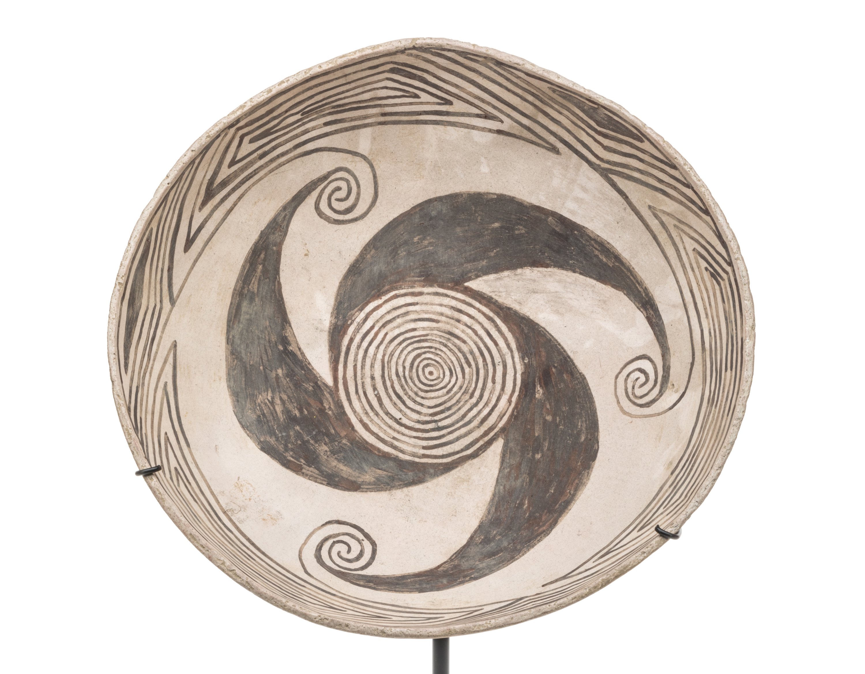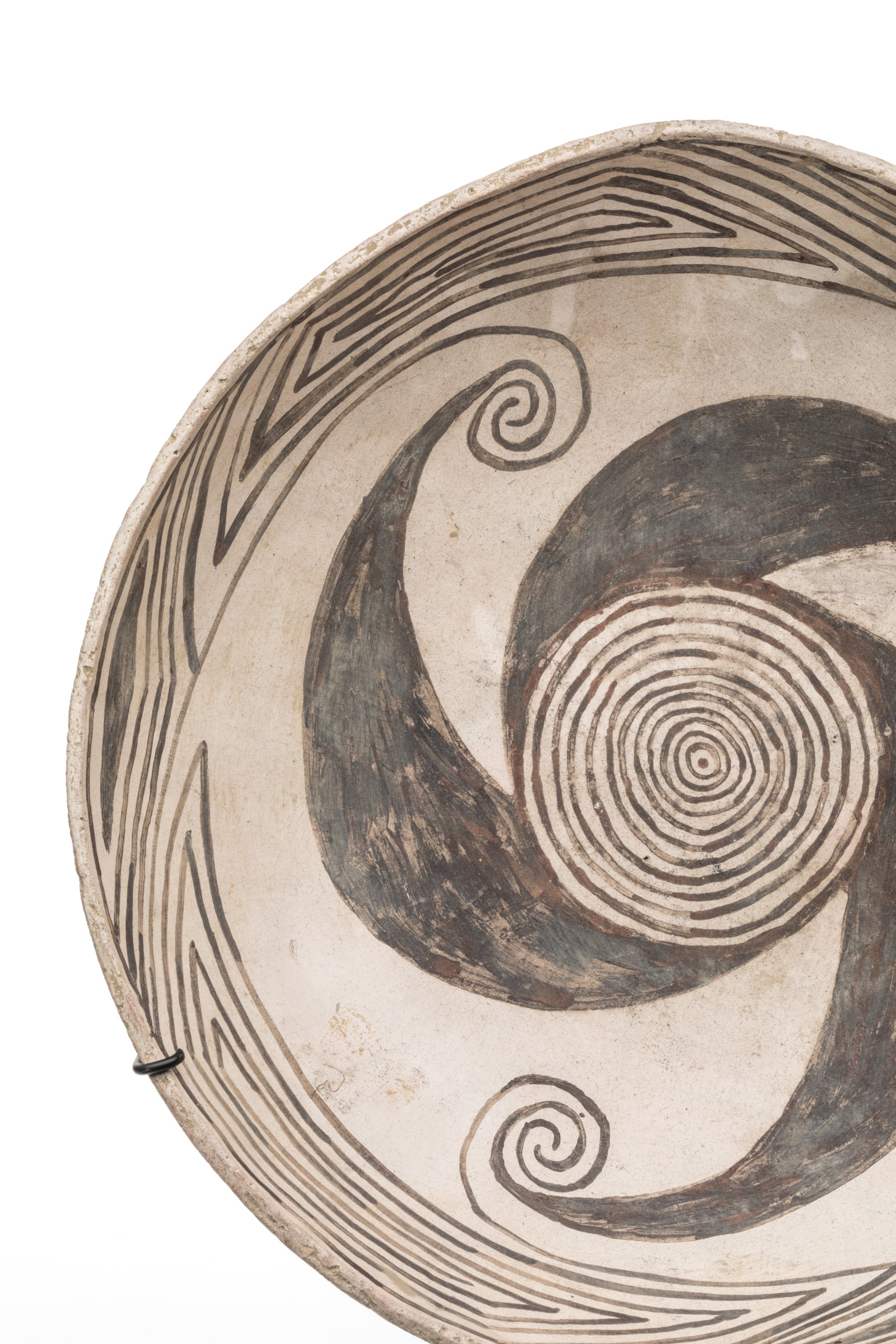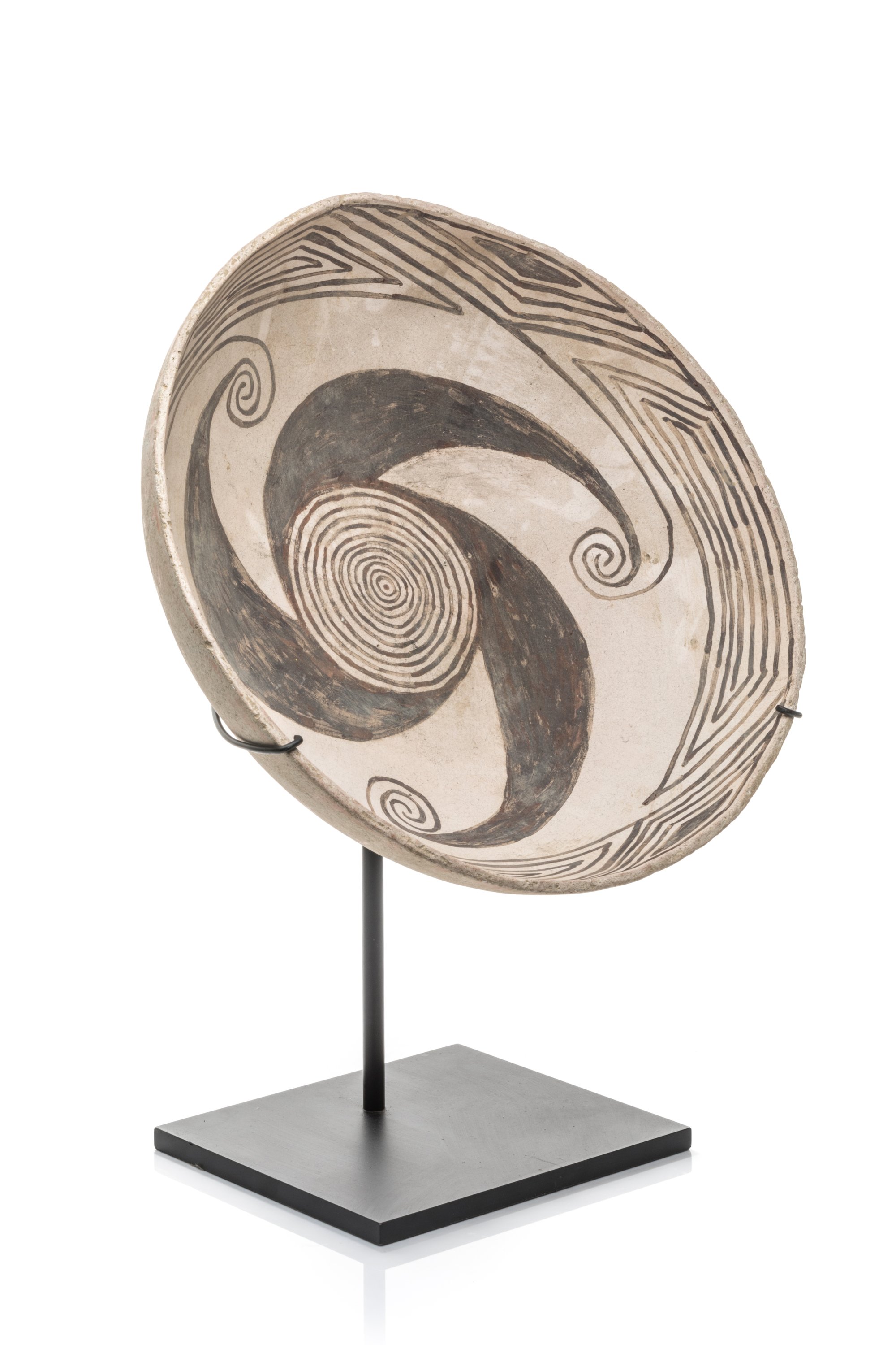 en terre cuite blanche à décor géométrique de spirales peint en noir.