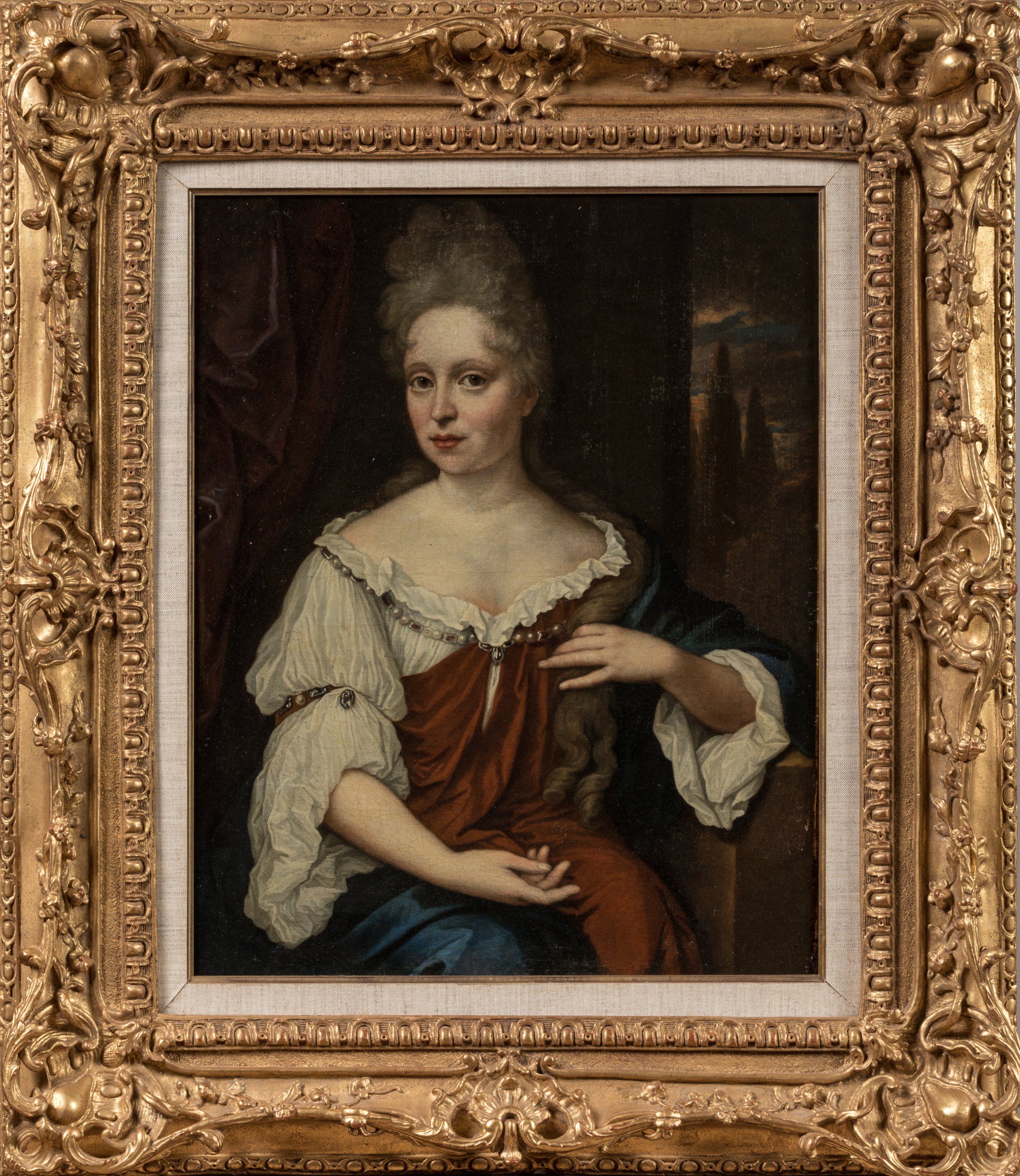 Portrait of a lady leaning on a balustrade attributed to Daniël Haringh. Oil on canvas.