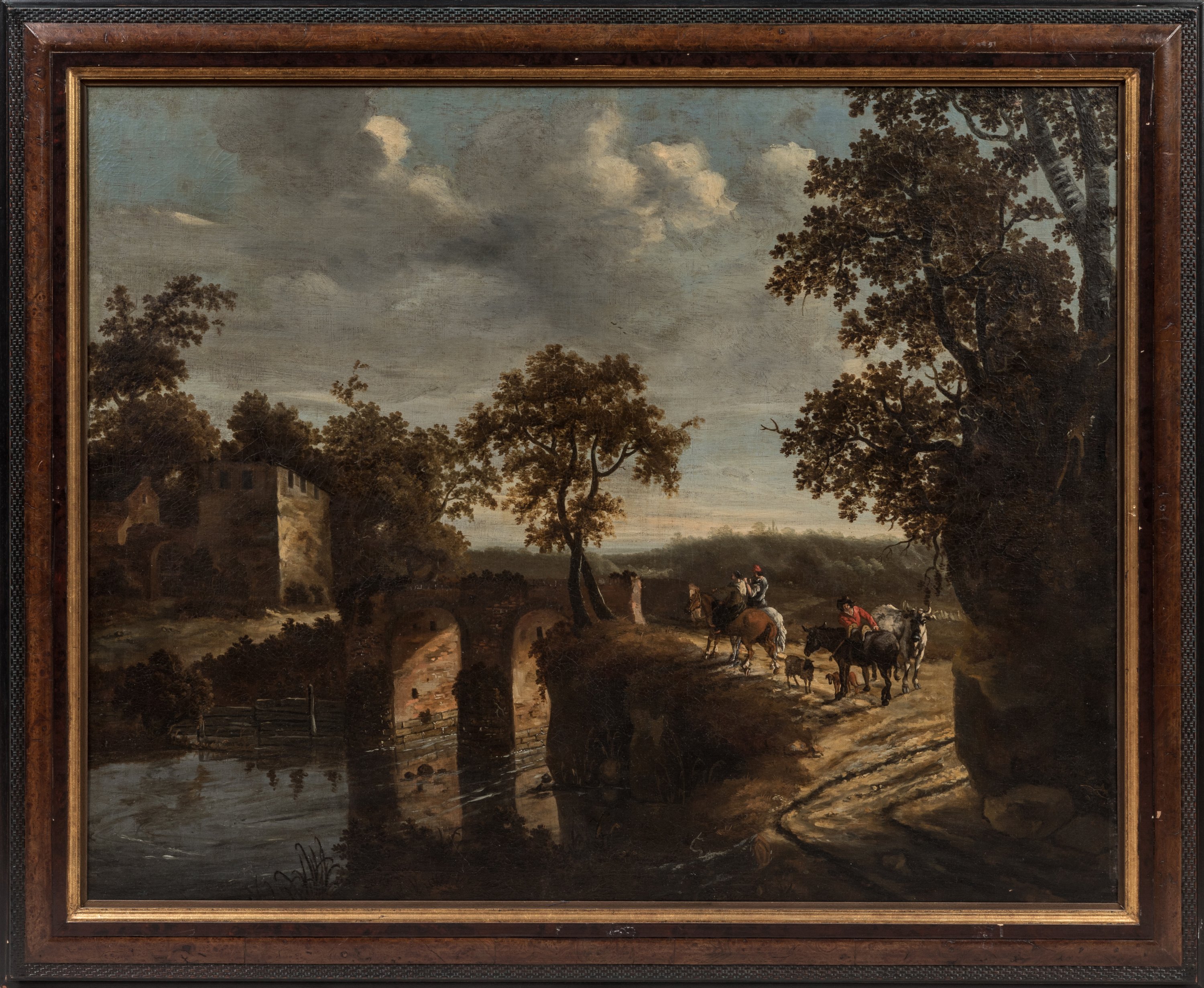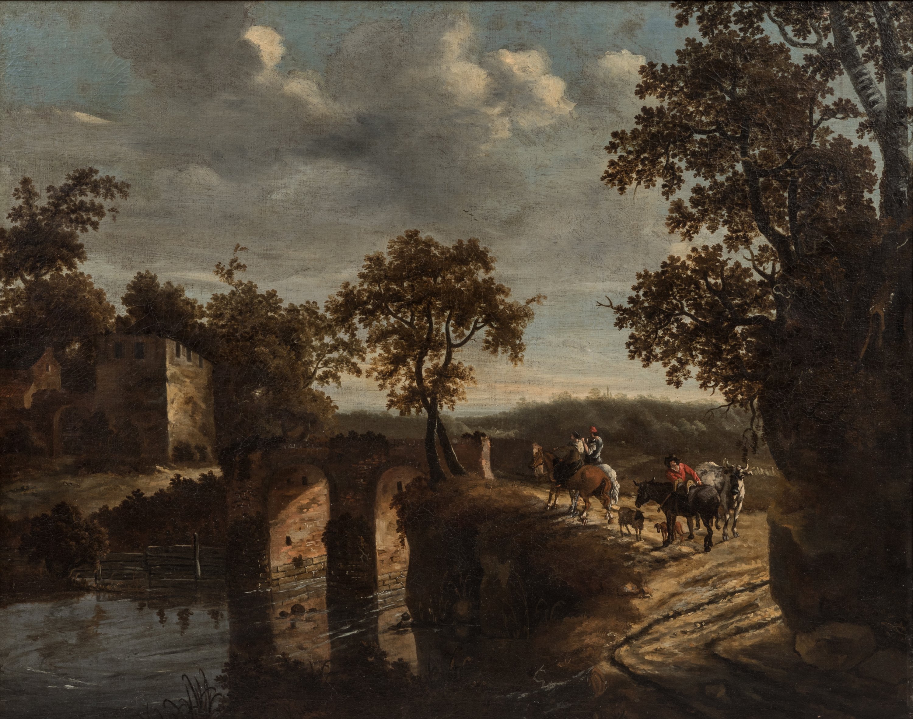 A 17th century painting attributed to Cornelis Gerritz Decker and depicting a bridge crossing.