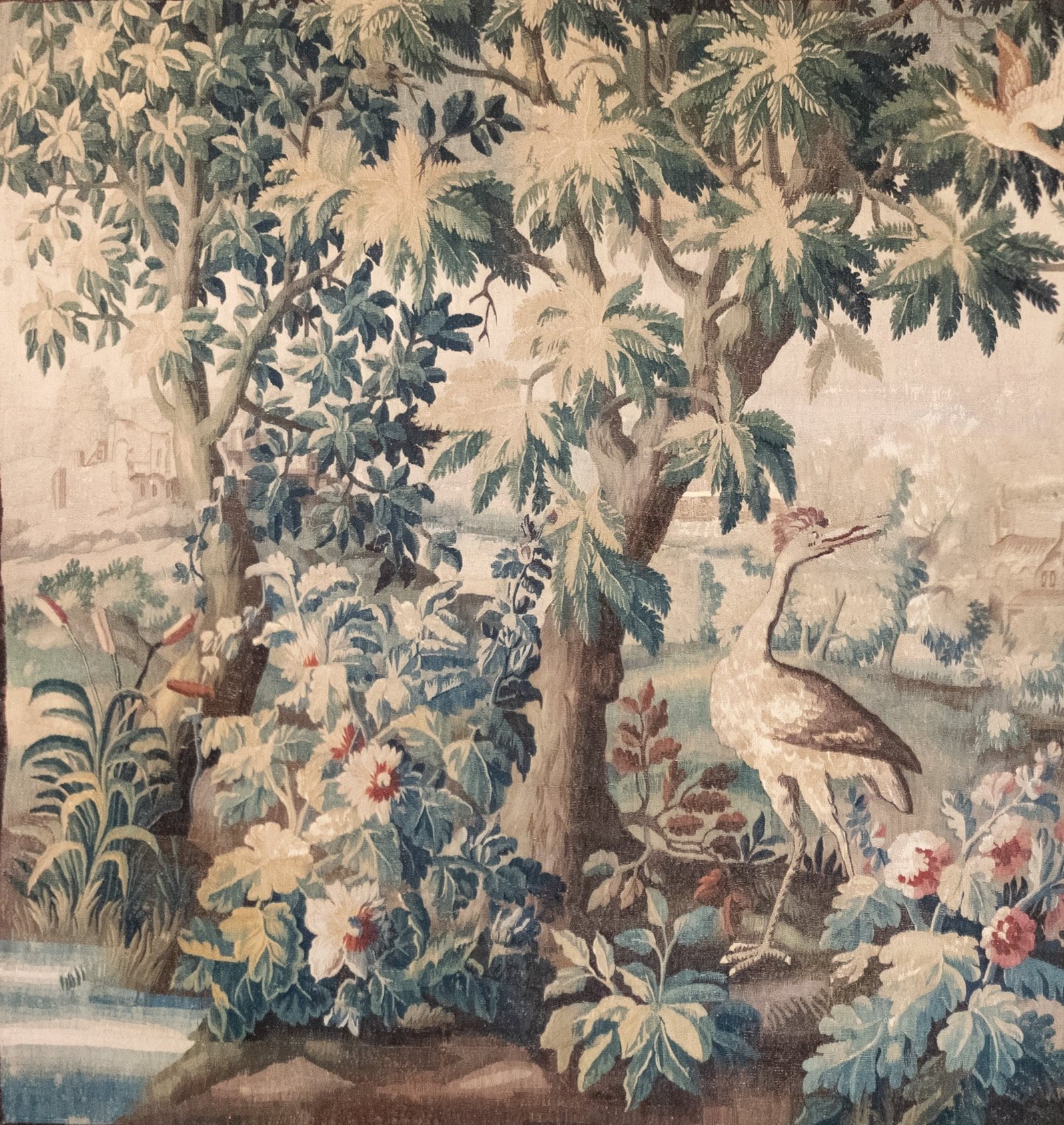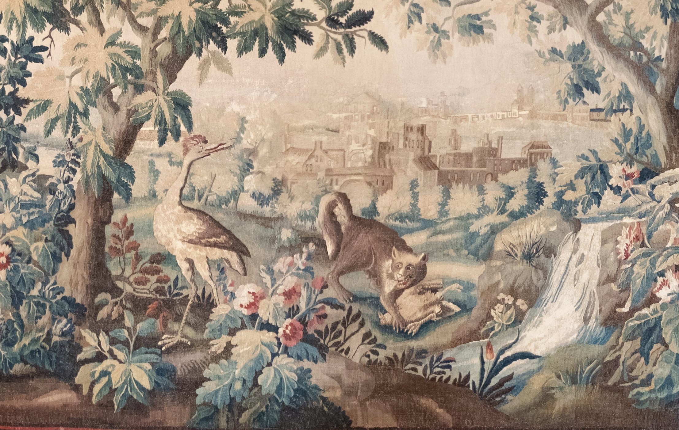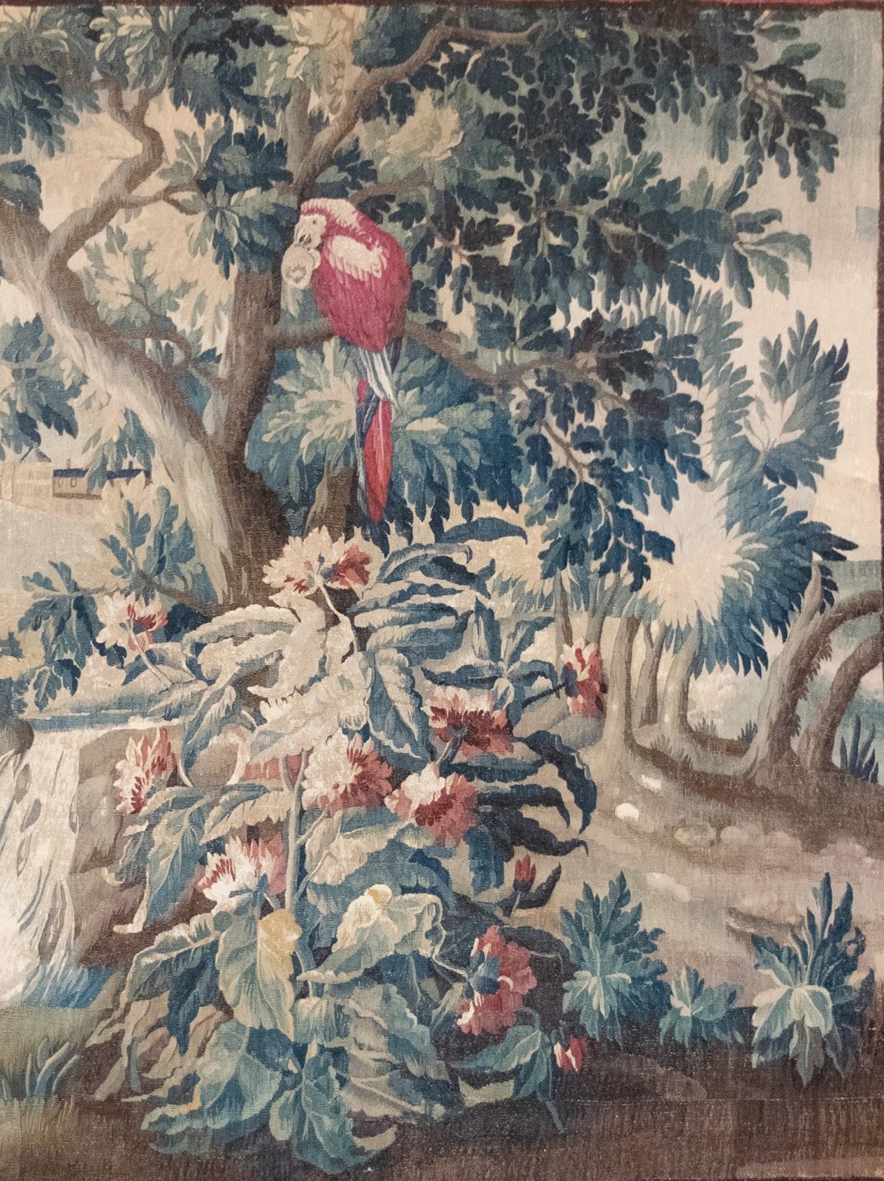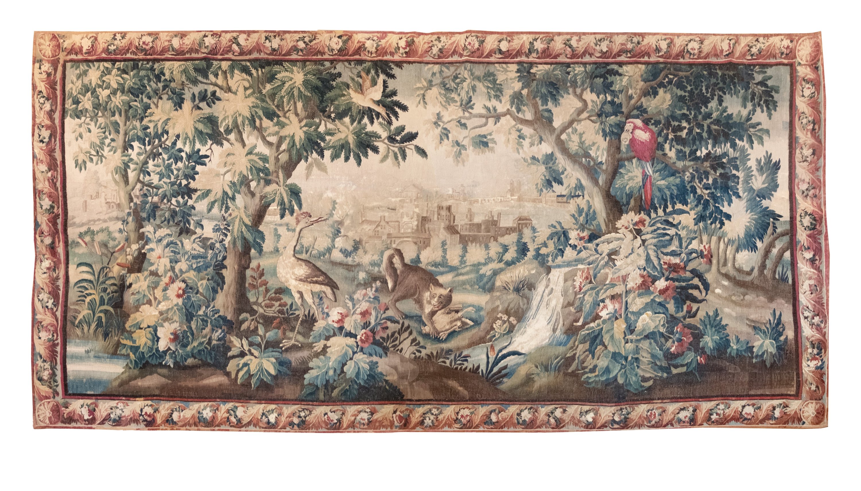 en laine et soie à décor de perroquet, échassier et renard-loup dévorant un oiseau dans un paysage de sous-bois, rivière, arbres, pavots, et d'une ville dans le lointain. Avec sa bordure de rinceaux de palmes et fleurs, rosace aux écoinçons.