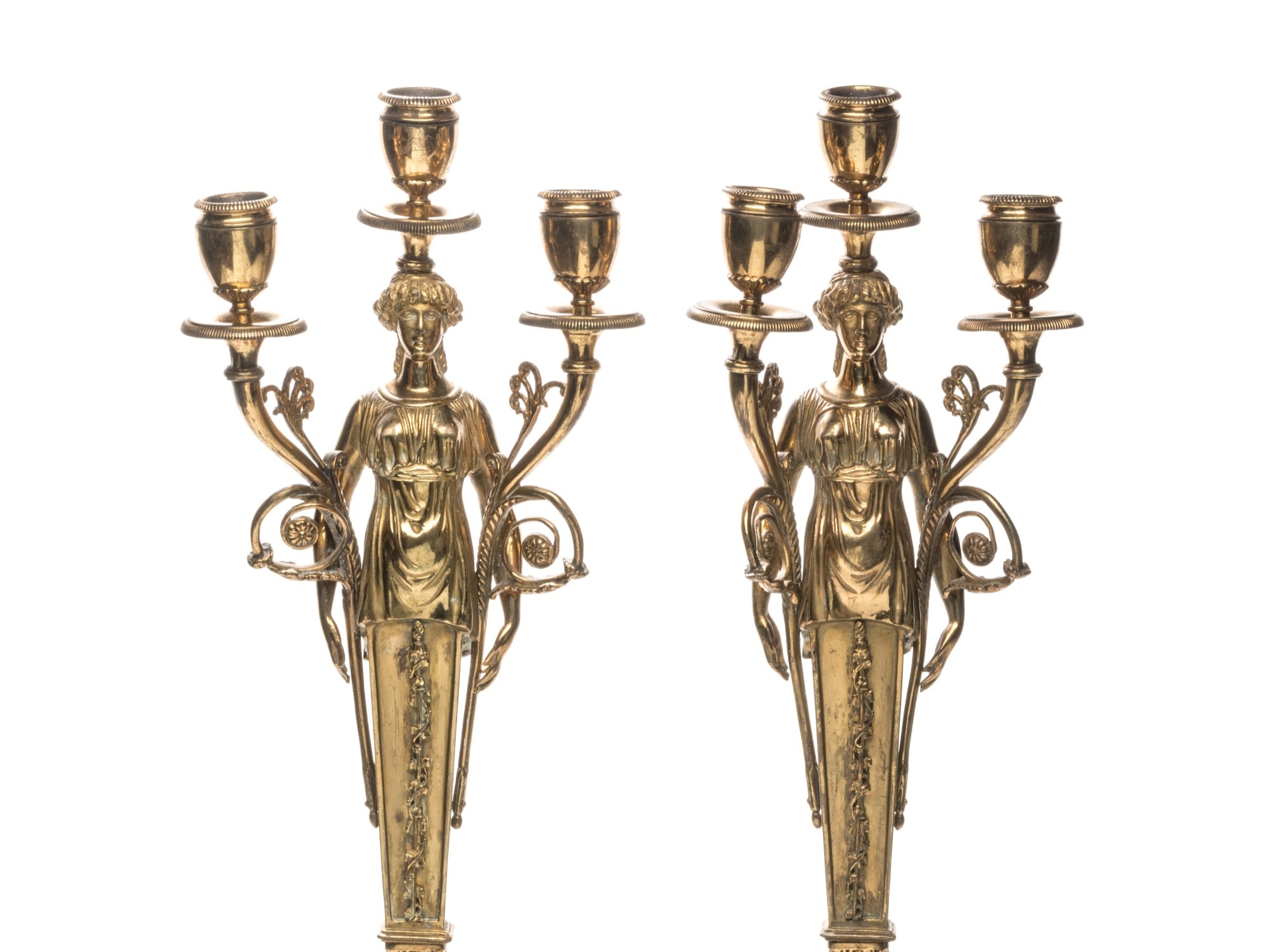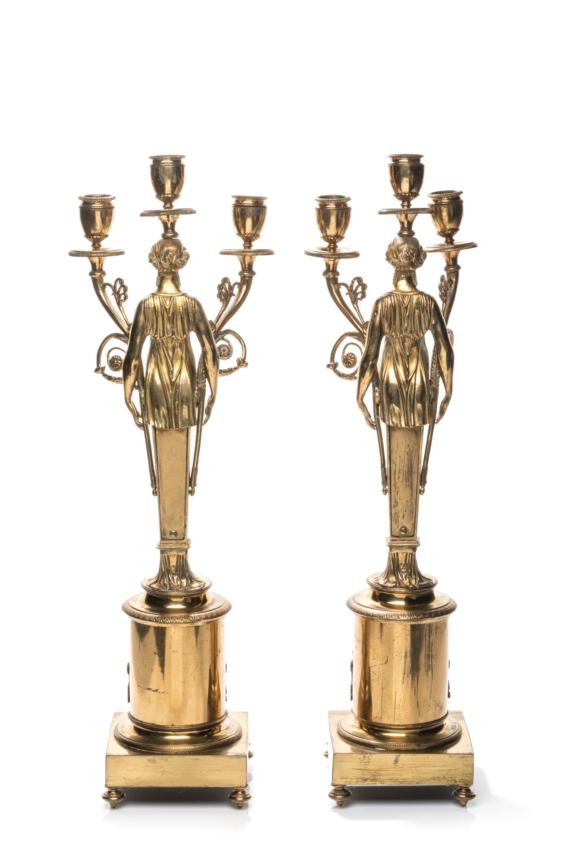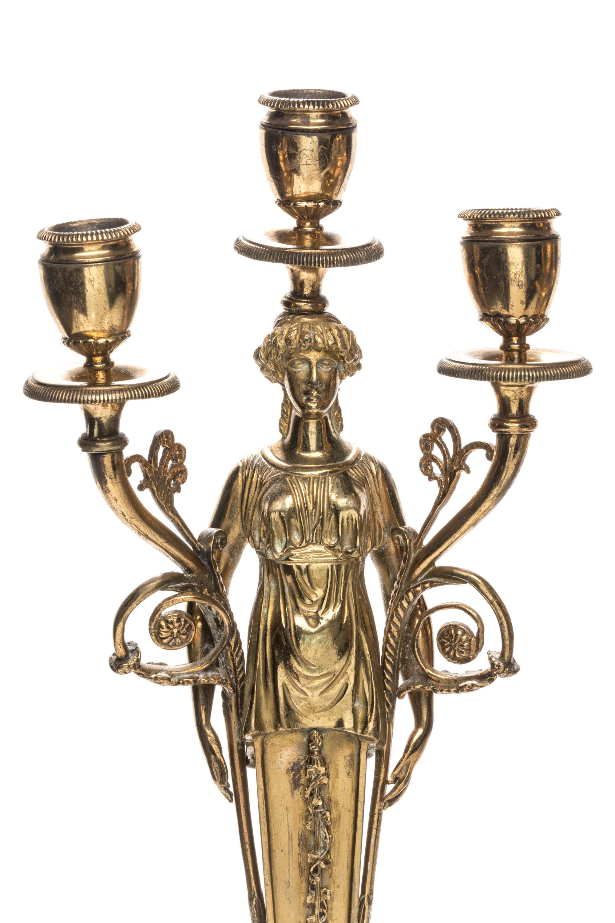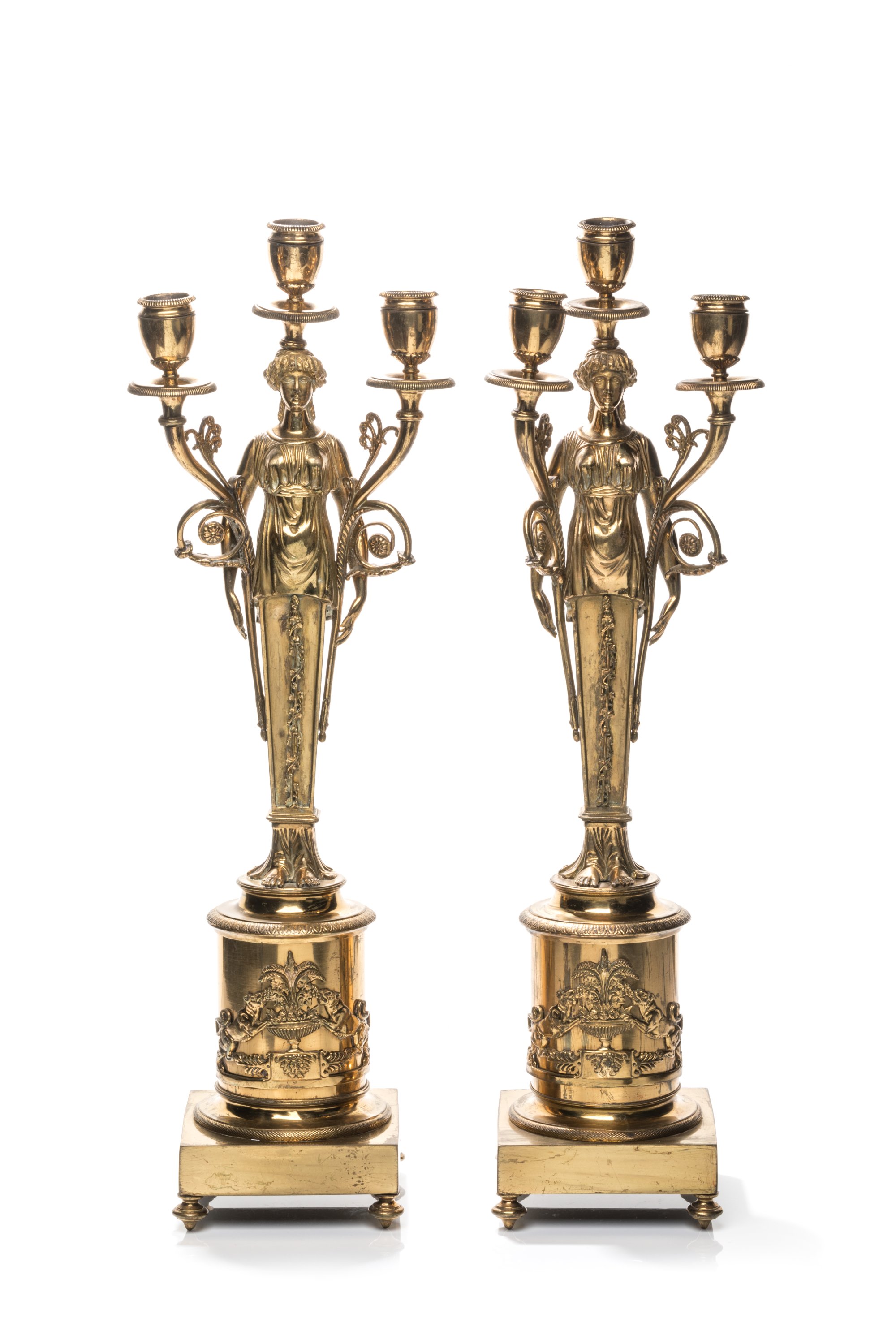 A pair of 19th century gilded bronze 3-arms candle holders. Neoclassical style.