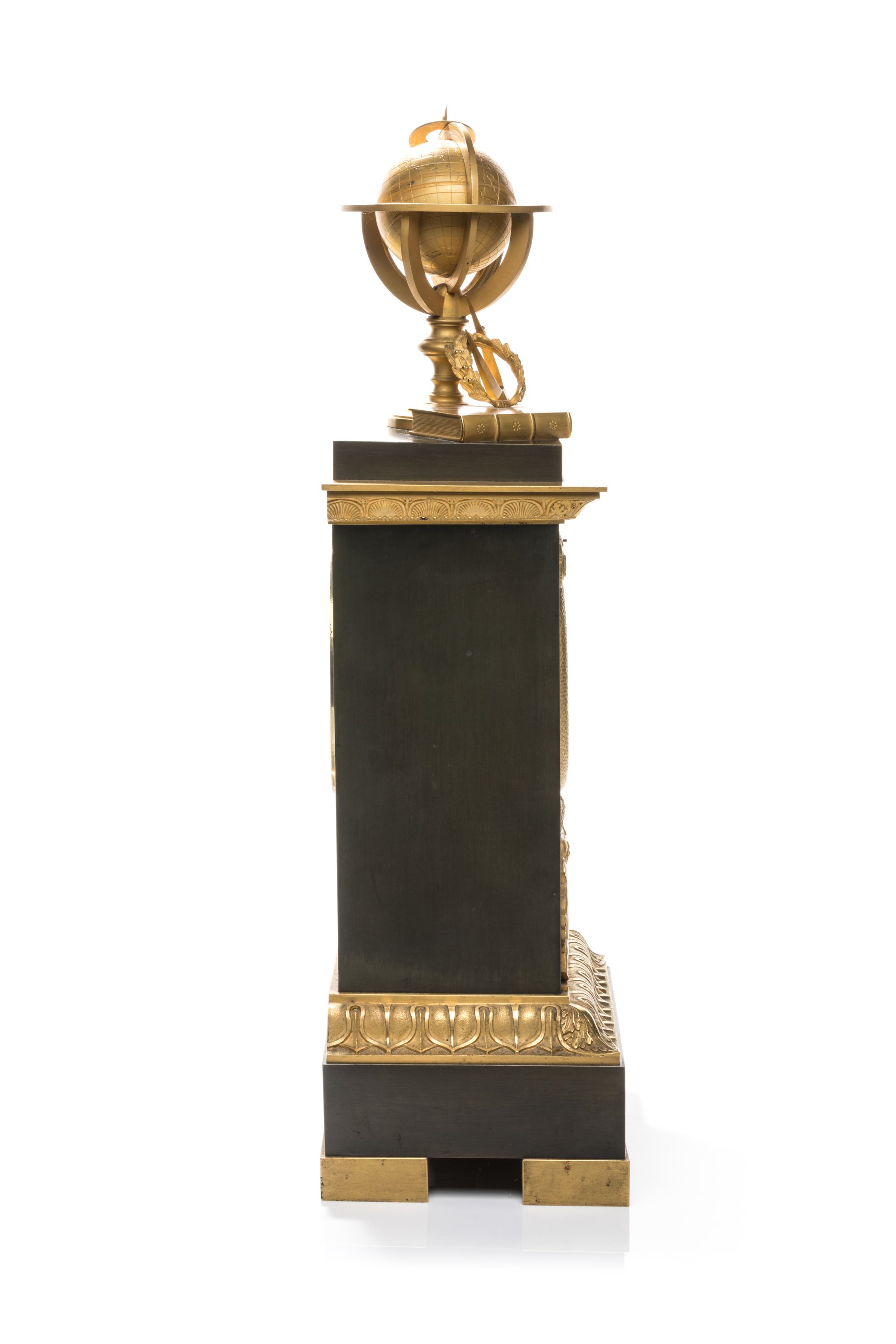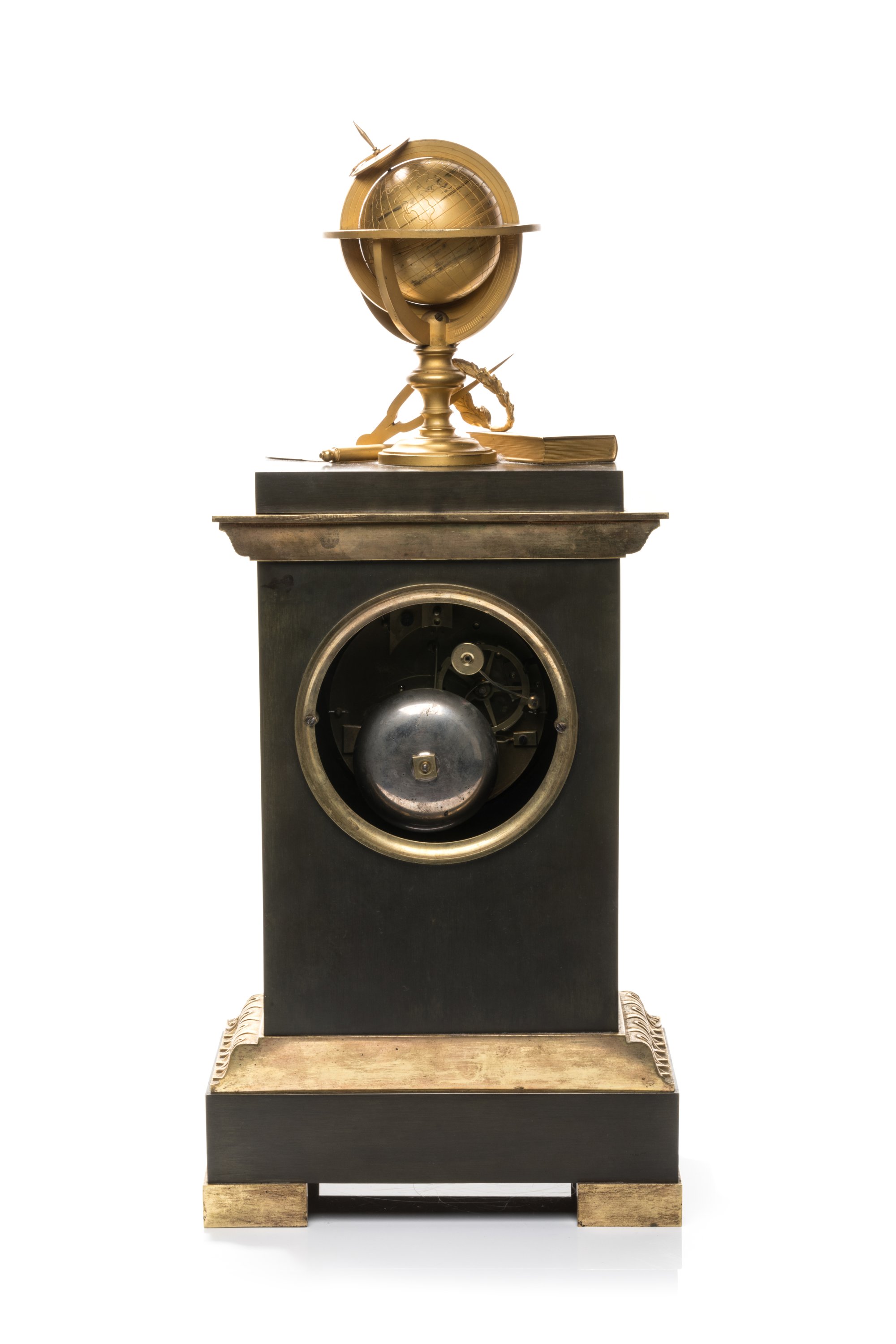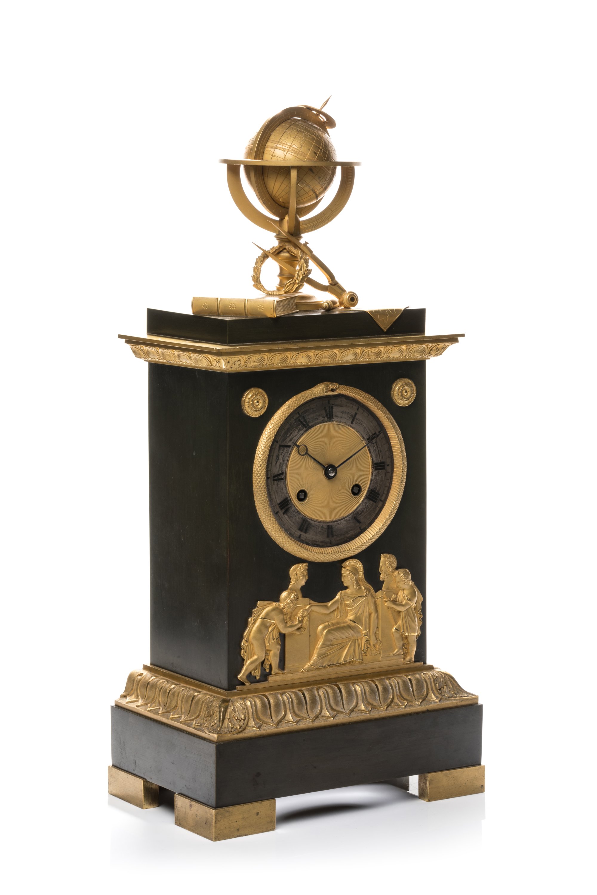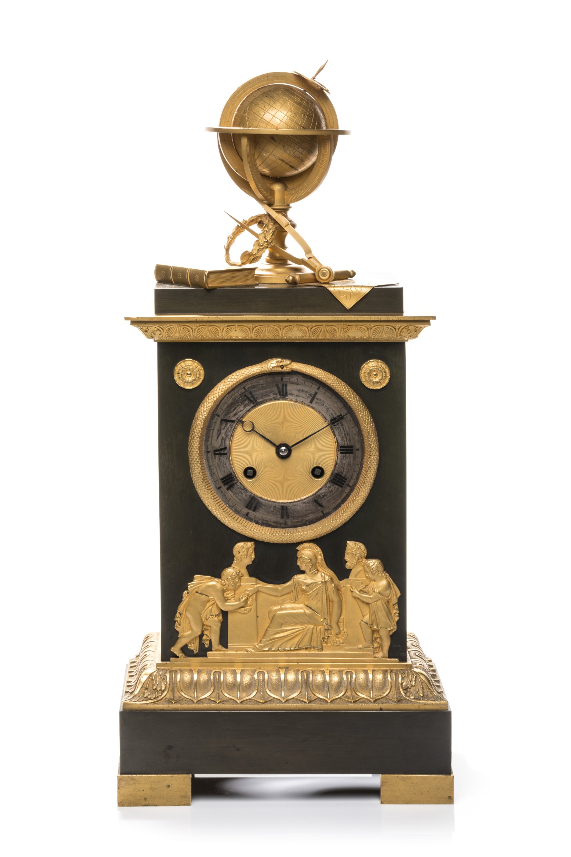en bronze patiné et doré, surmontée d'un globe, d'une couronne de lauriers et d'instruments scientifiques. Le cadran doré rayonnant à chiffres romains et chemin de fer est ceint d'une figure d'Ouroboros en bronze doré. Les trois faces sont ornées de rosaces et corniches en bronze doré et finement ciselé de guirlandes de palmettes, oves stylisés et alternés de feuillage. Elle repose sur une base rectangulaire en bronze patiné ornée et d'un bas-relief à trois personnages à l'antique, aux quatre patins dorés.