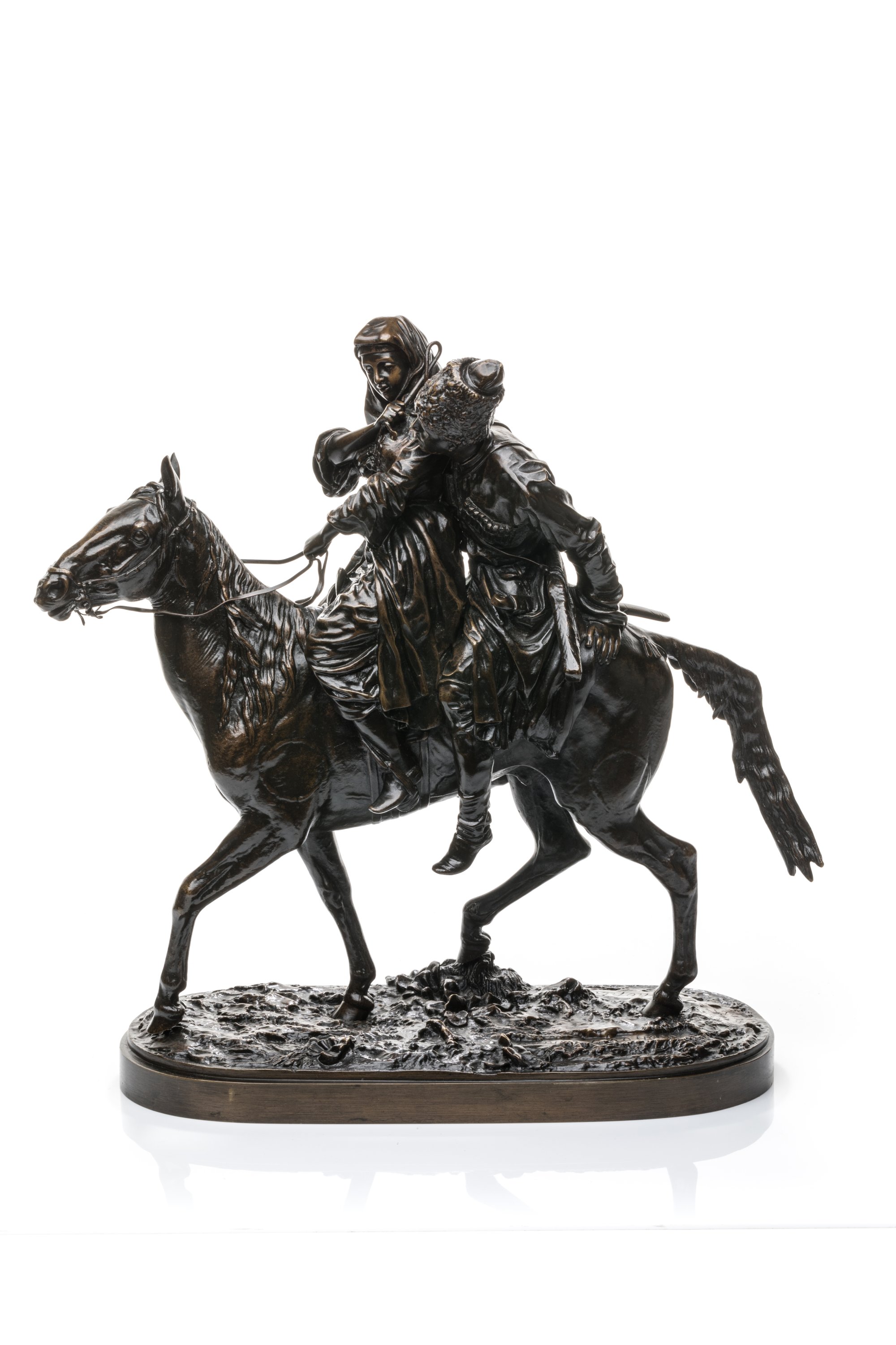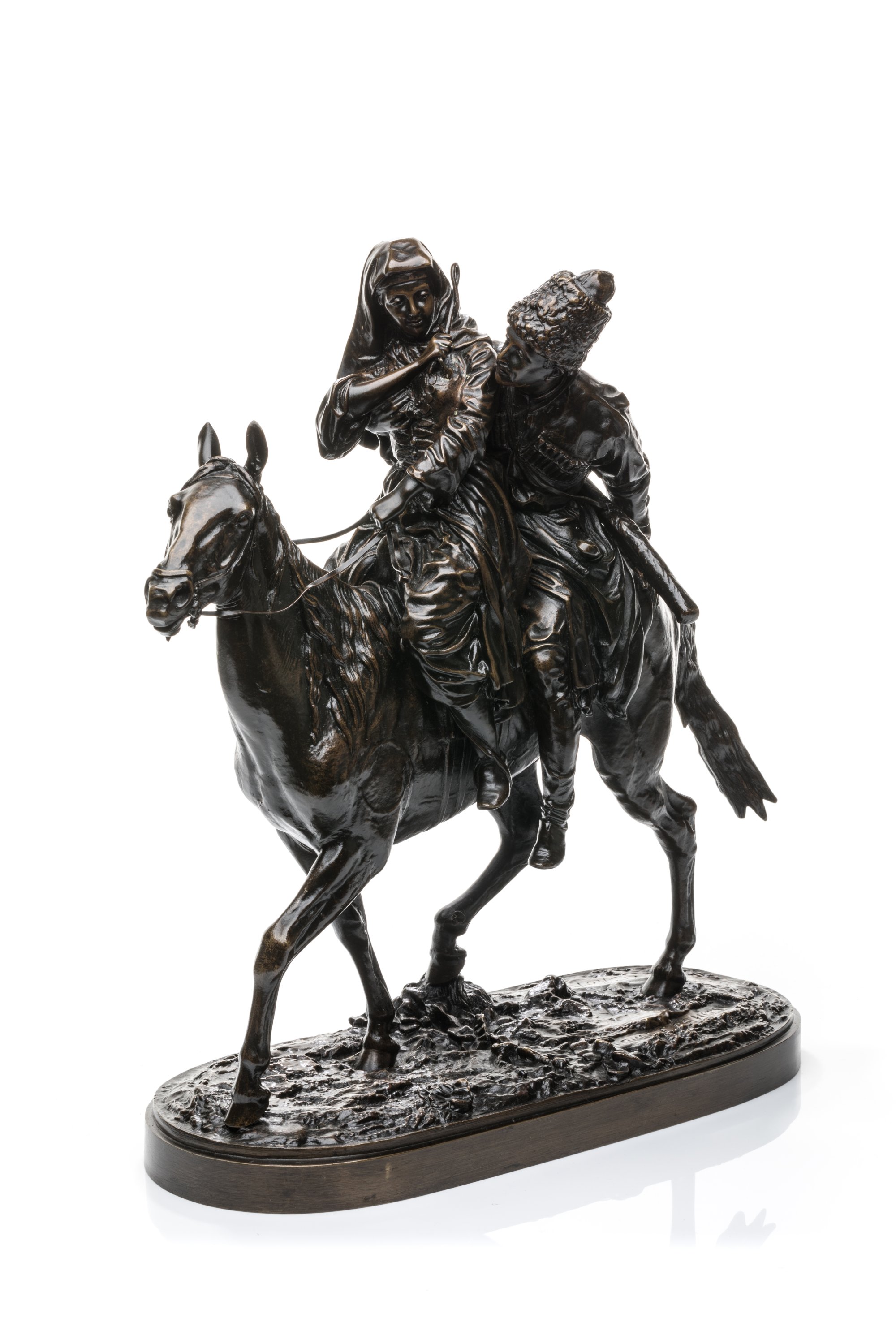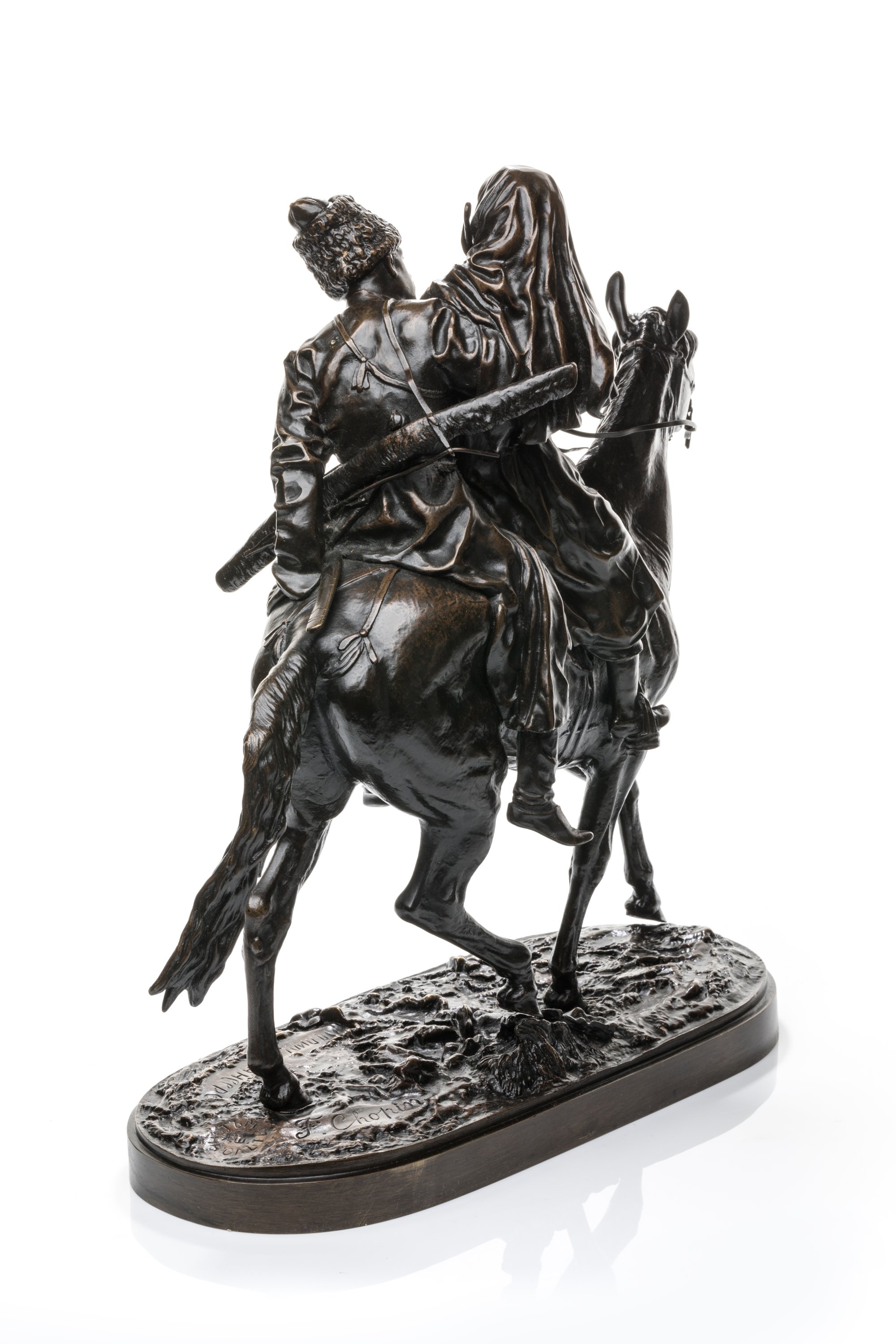 A bronze sculpture by Evgeni Alexandrovich Lanceray depicting a Circassian high ranking man and young woman on horseback. Designed in 1873. Signed. Chopin foundry mark.