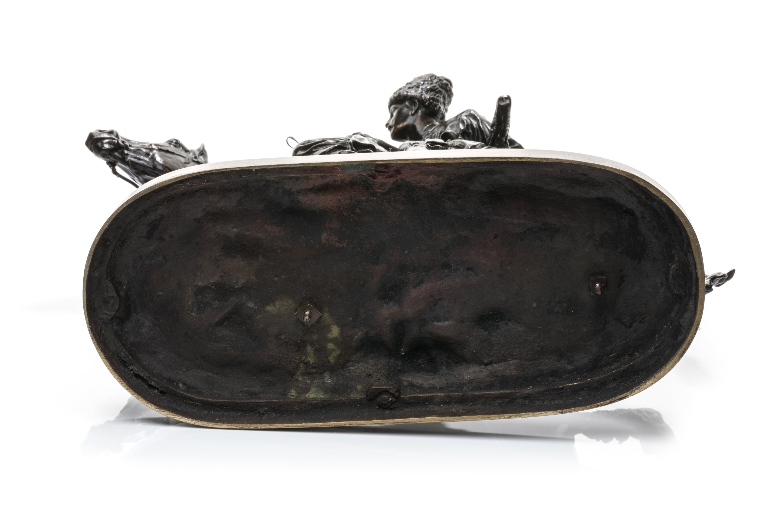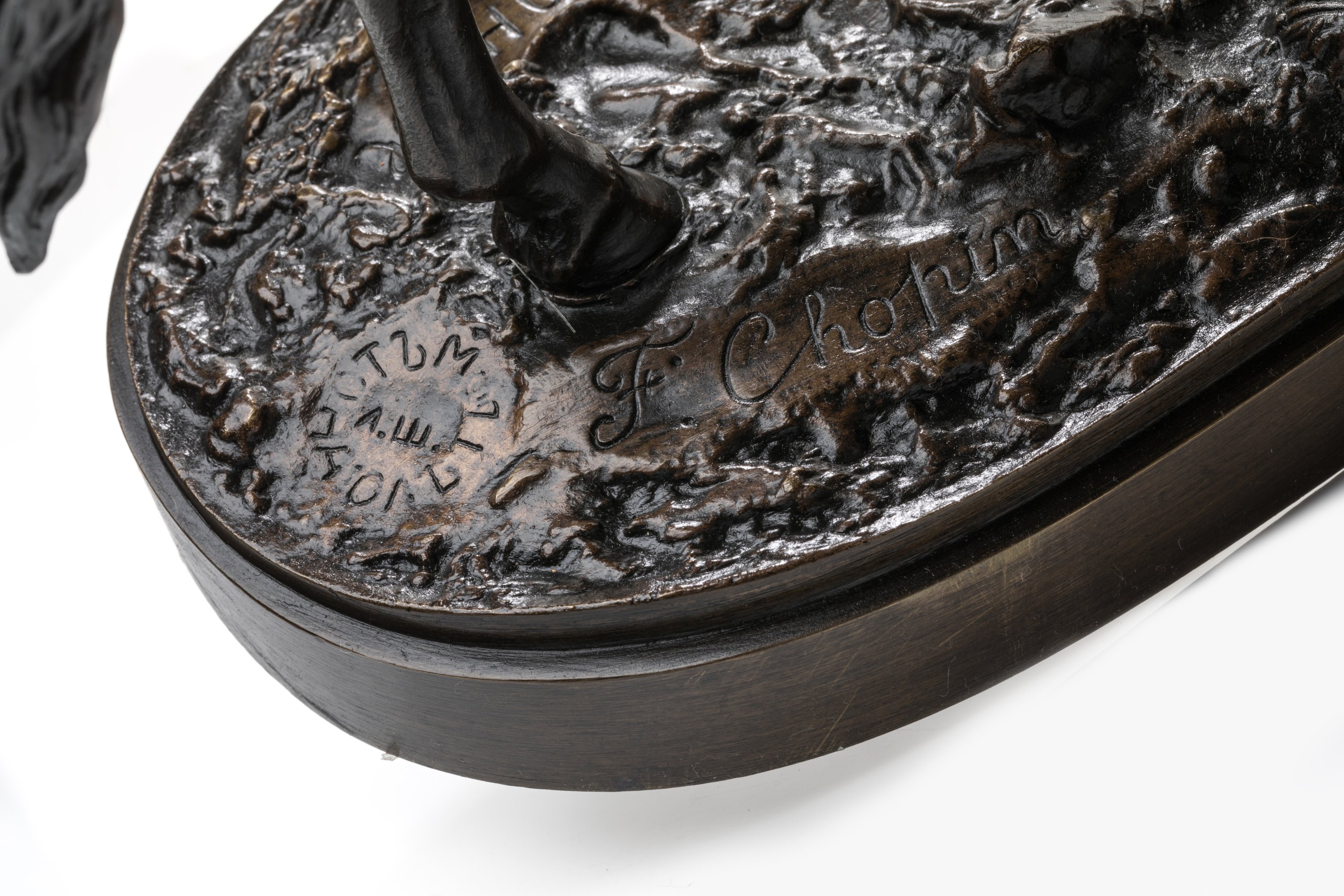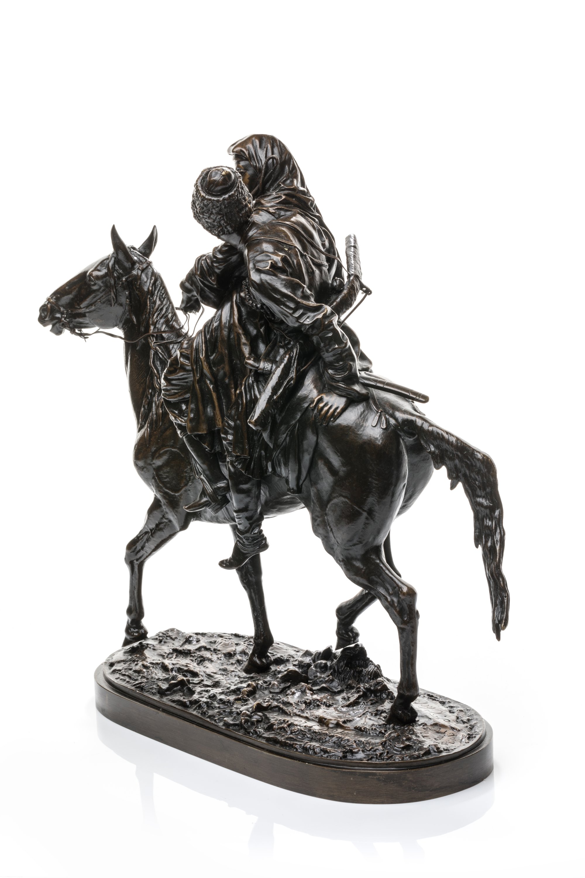 A bronze sculpture by Evgeni Alexandrovich Lanceray depicting a Circassian high ranking man and young woman on horseback. Designed in 1873. Signed. Chopin foundry mark.