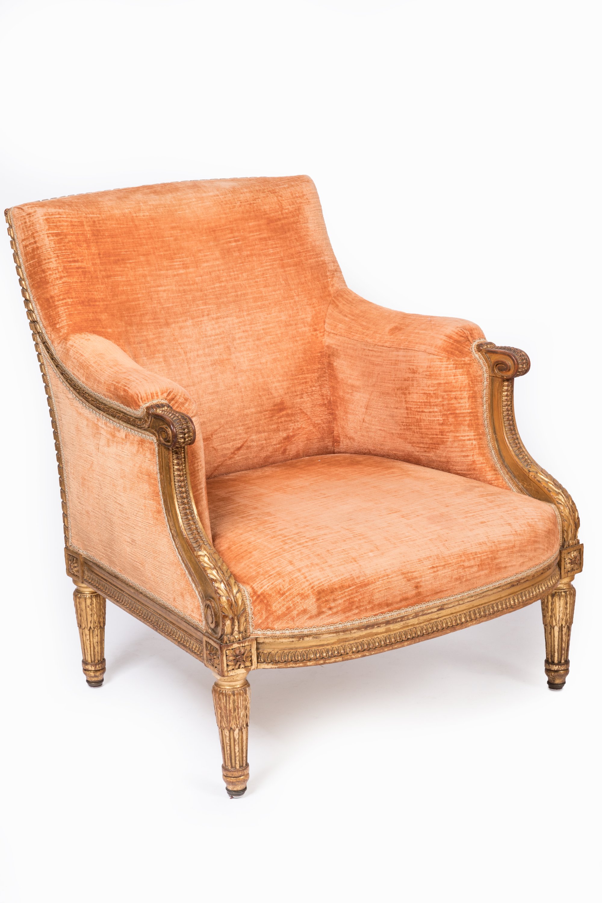 en bois doré. Riche modèle au piétement en pointes d'asperges et feuilles d'eau, montants rubans enroulés, oves en denticules.