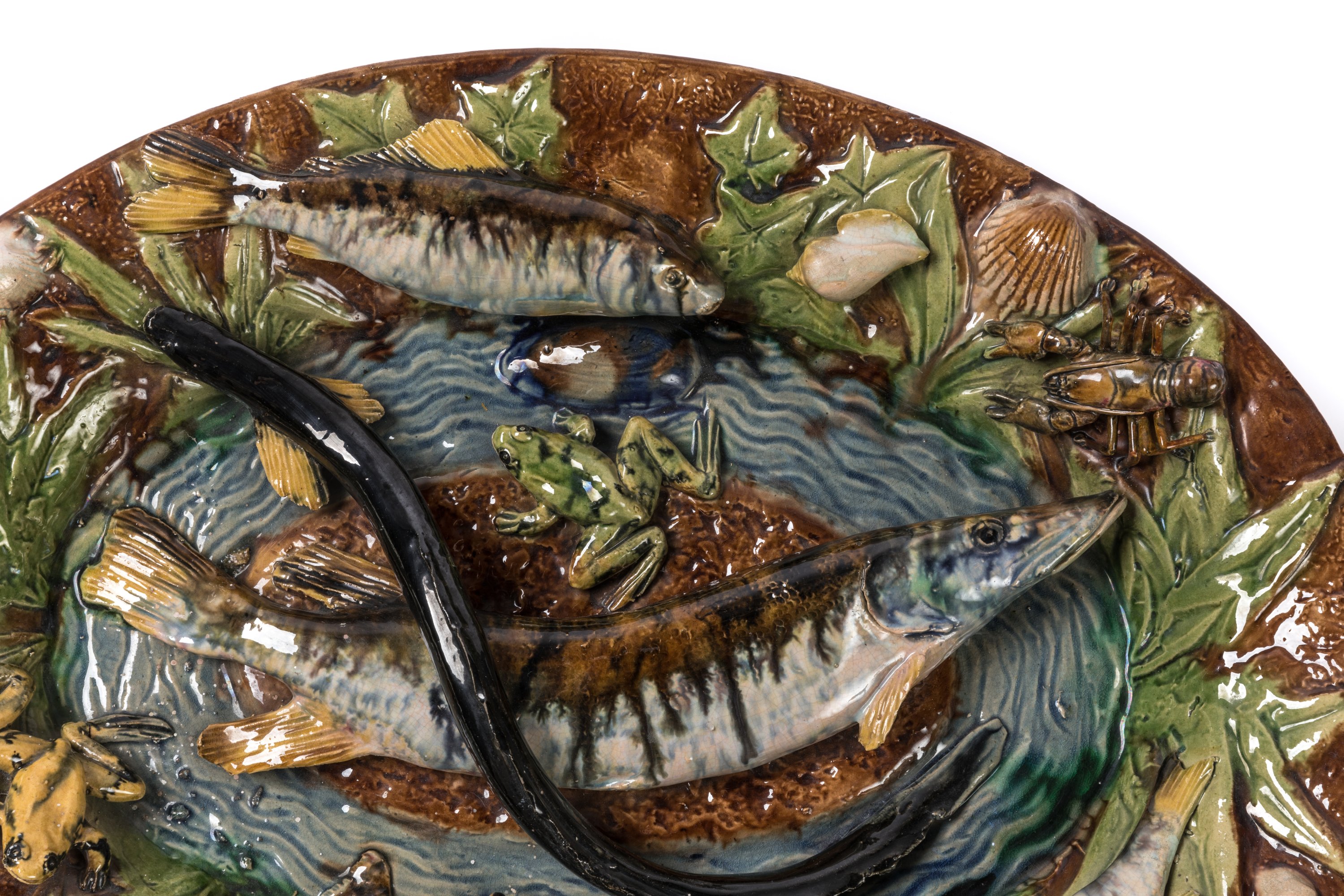 A glazed faience platter adorned with rustic seafood figurines by François Goras. Angoulême stamp.