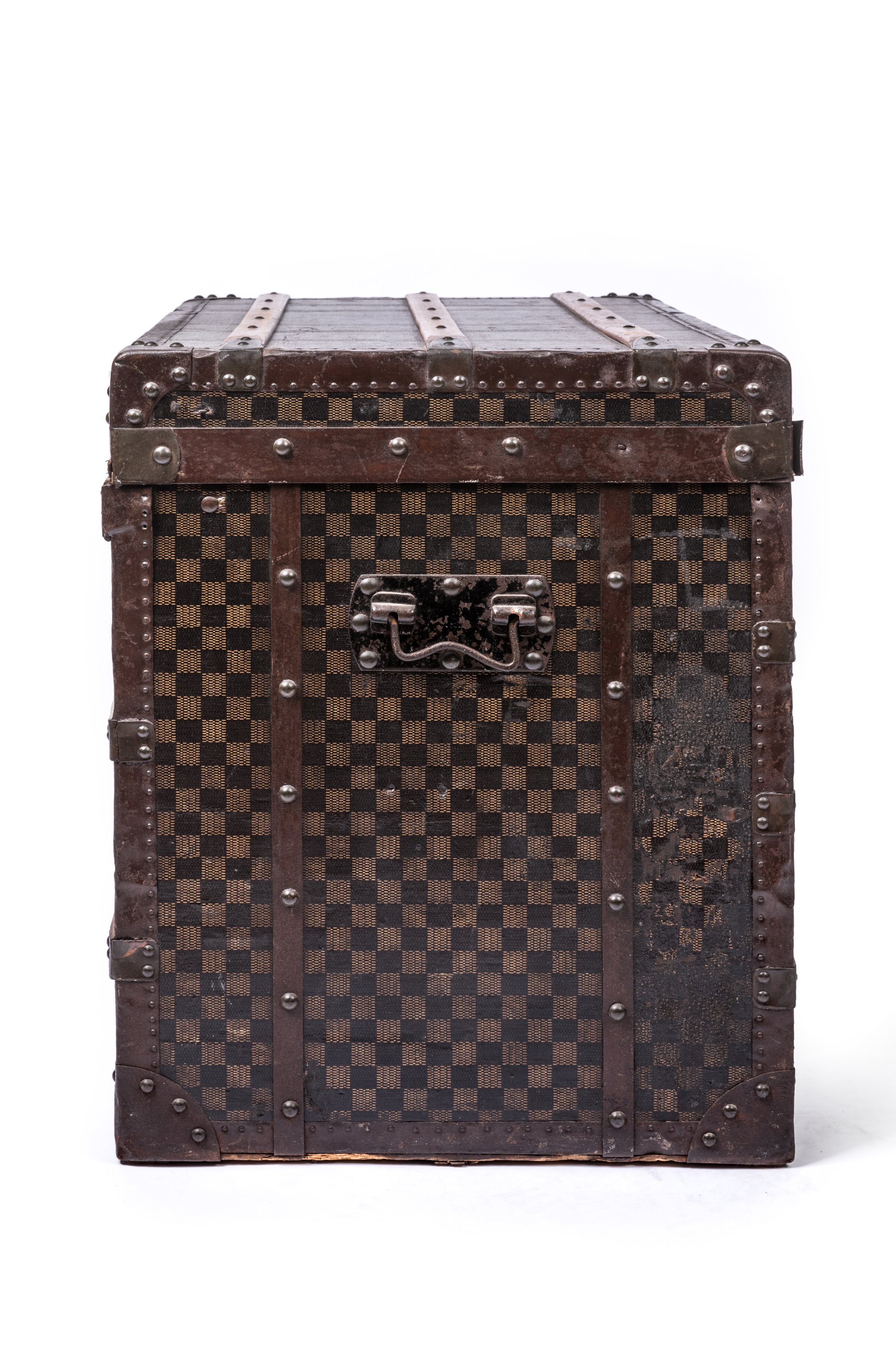 - Malle haute de dame habillée d'une toile Damier grise et noire. Bordures lozinées, écoinçons, fermetures et poignées en laiton peintes en noir. Ouverture par le dessus. Couvercle plat. Fond recouvert de zinc. XXe.