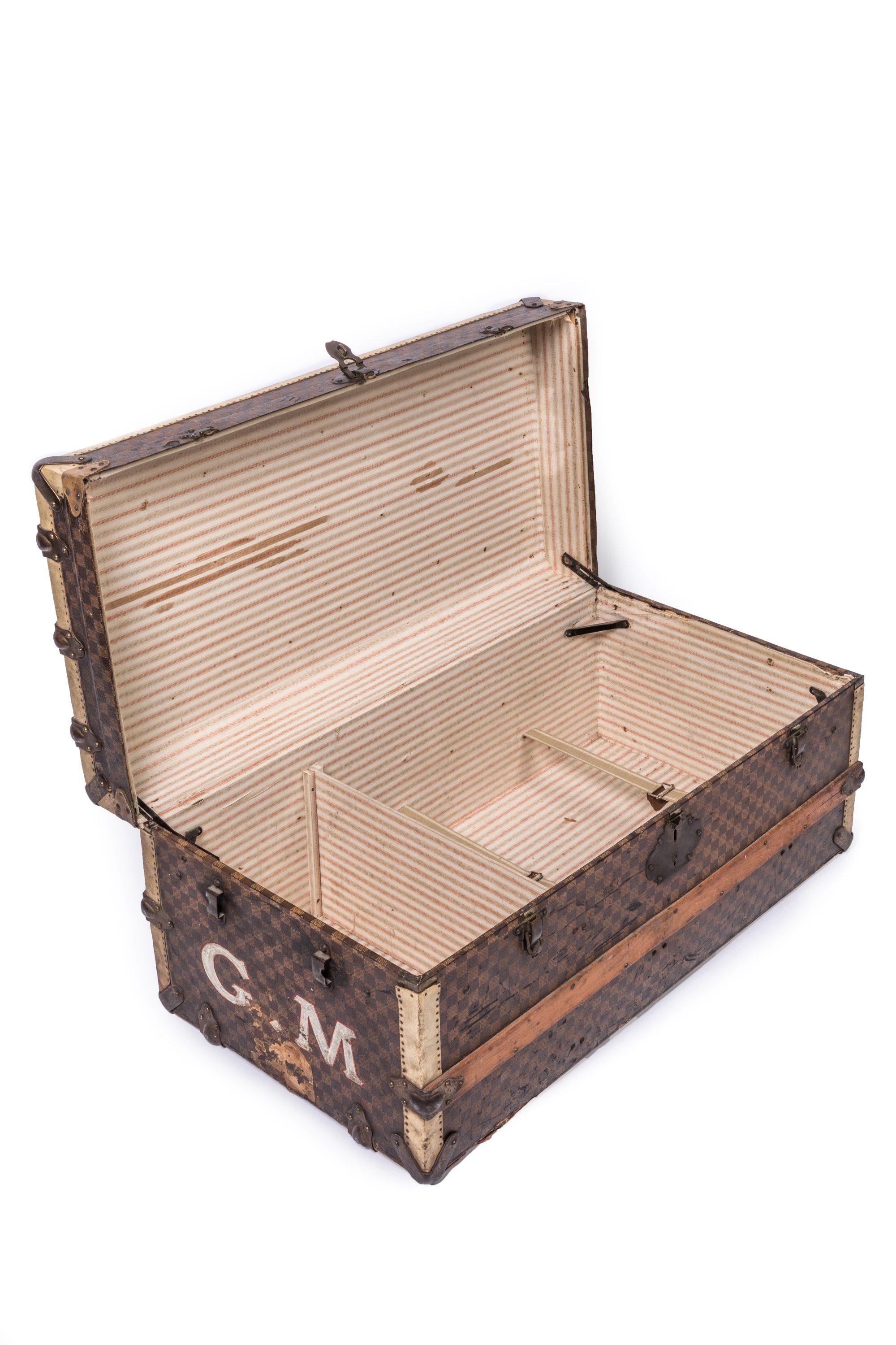 - Malle cabine habillée d'une toile Damier grise et noire. Bordures lozinées crème. Écoinçons, fermetures en laiton. Poignées en cuir. Ouverture par le dessus. Couvercle plat. Façade à deux temps. Intérieur toile écrue à lignes rouges et vertes. Côtés latéraux extérieurs monogrammés "G M" en crème. Fond recouvert de zinc. XXe.