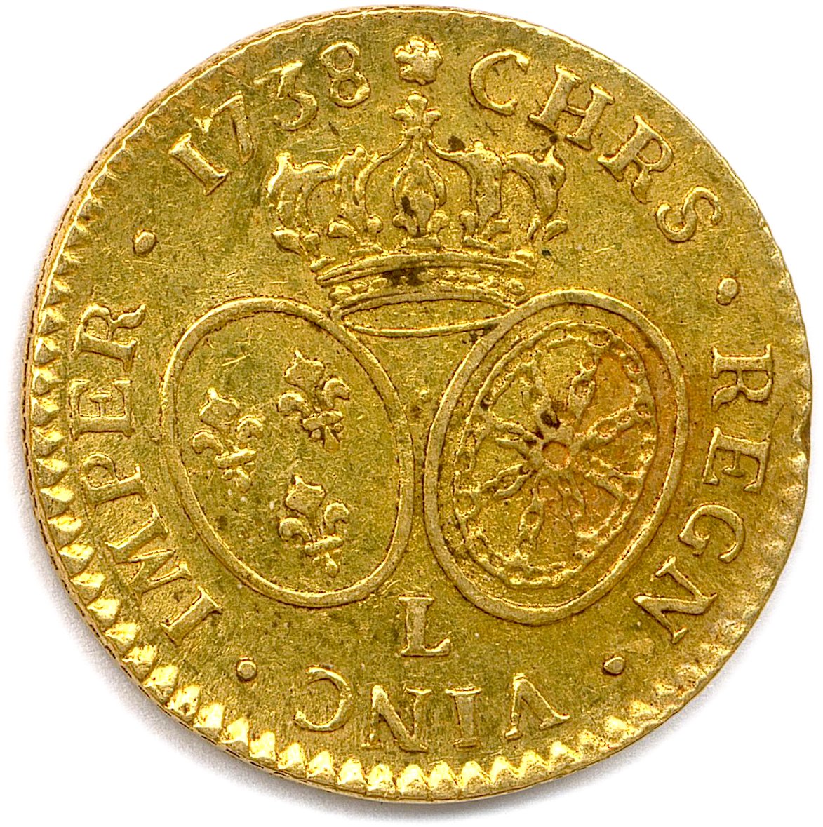 A 1738 "Louis d'or aux lunettes" gold coin.