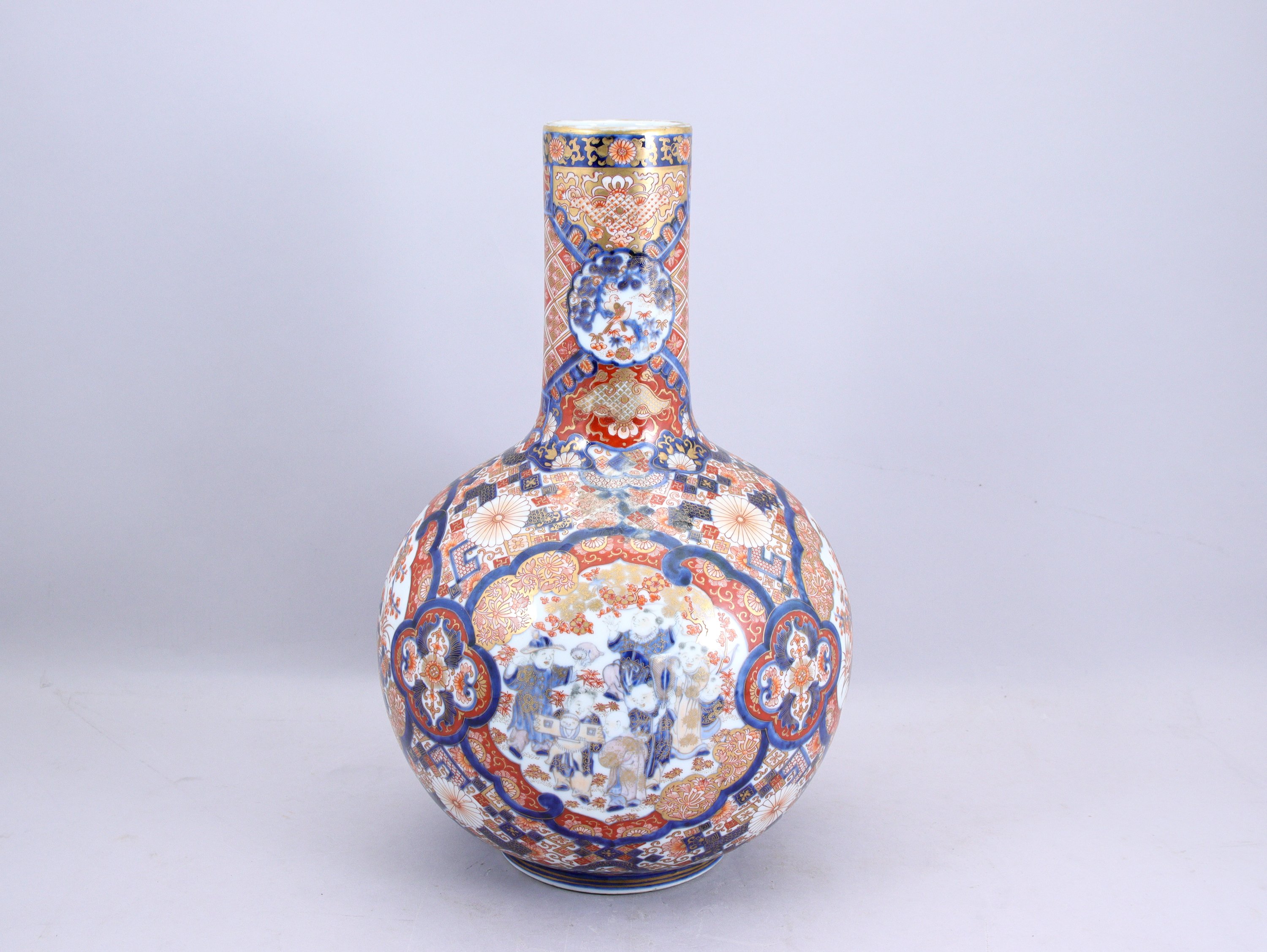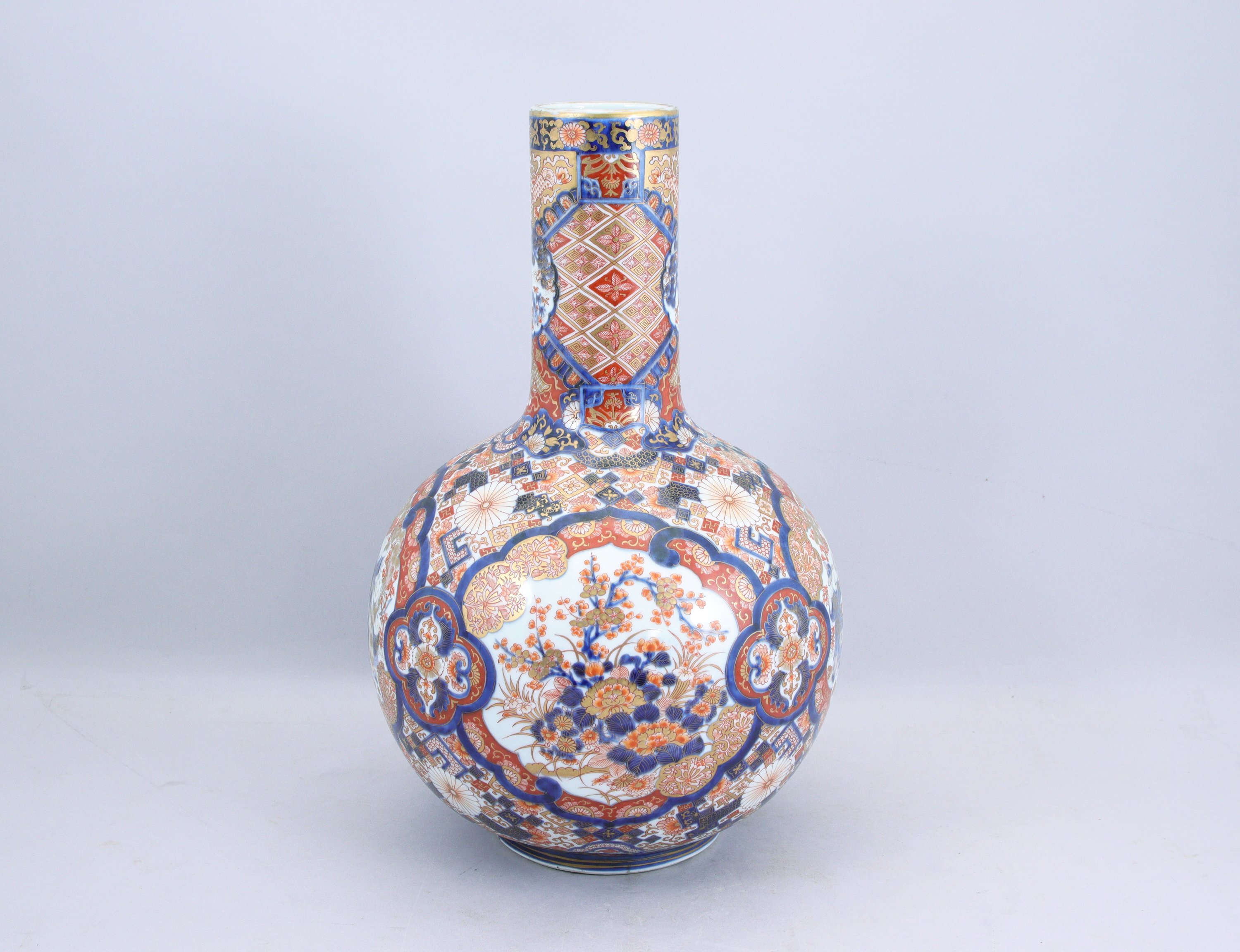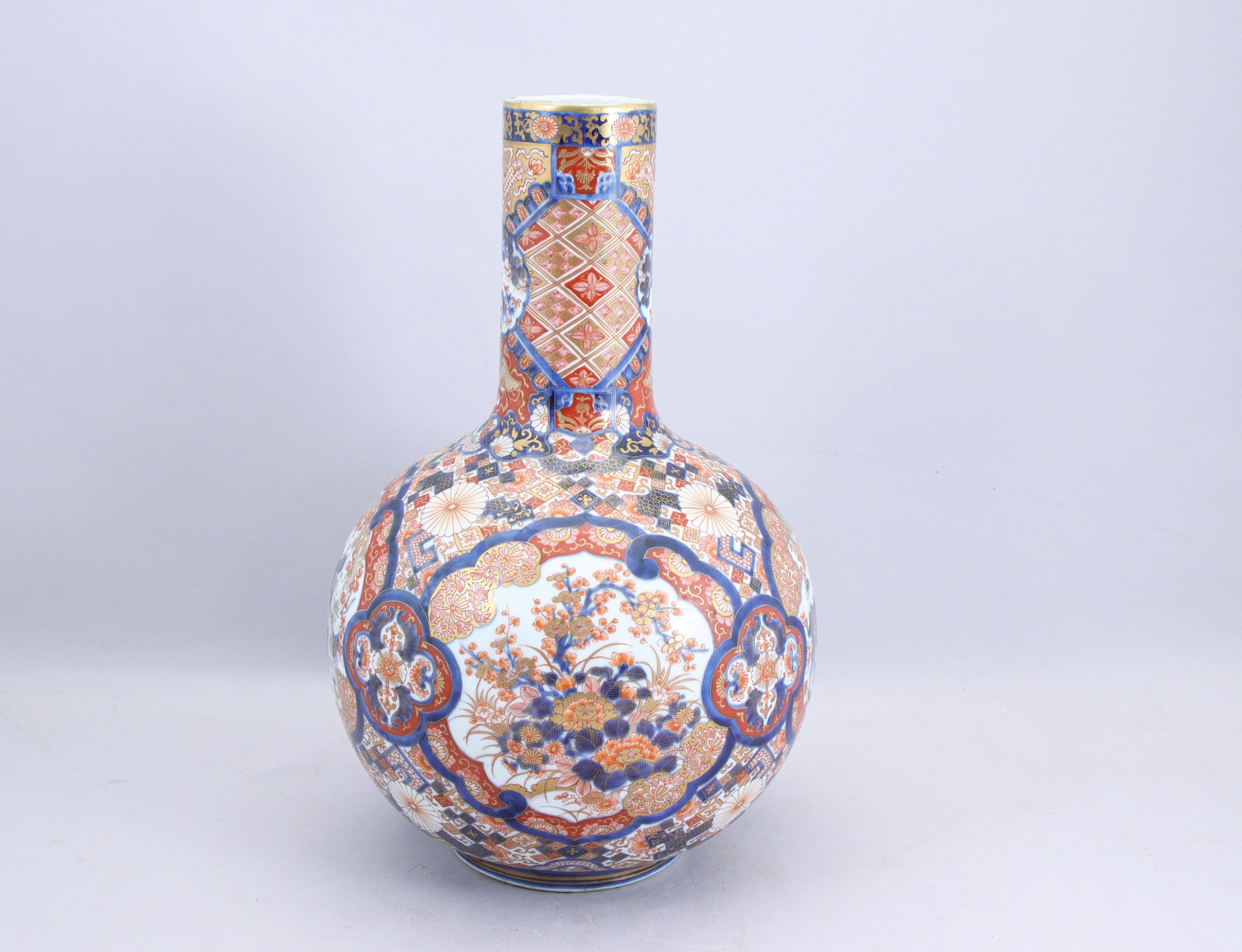 en porcelaine décorée en bleu sous couverte, rouge de fer et émail or dit "Imari" de réserves ornées d'enfants et pruniers et bambous sur fond de motifs géométriques et de fleurs. Au revers, la marque Fukagawa.