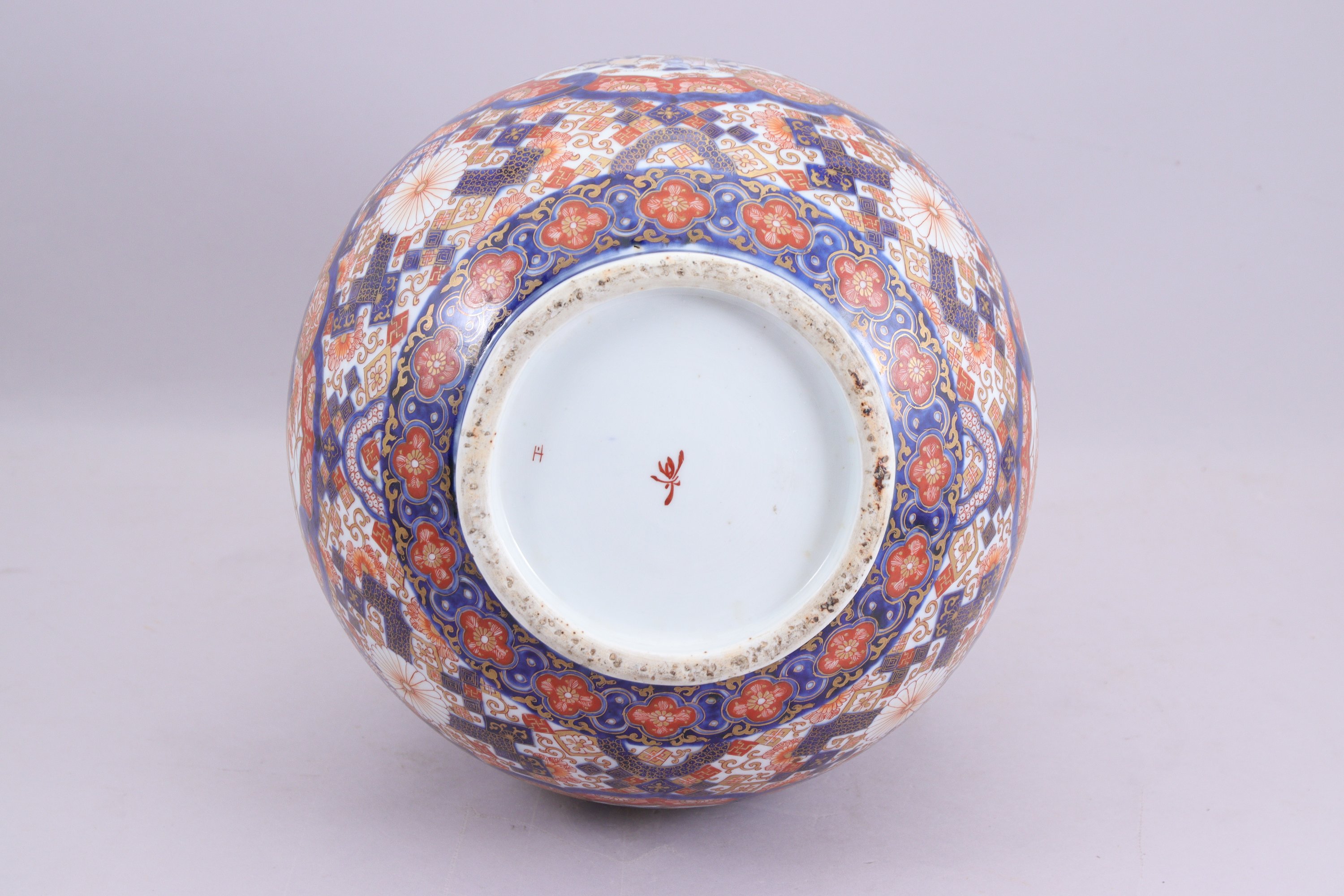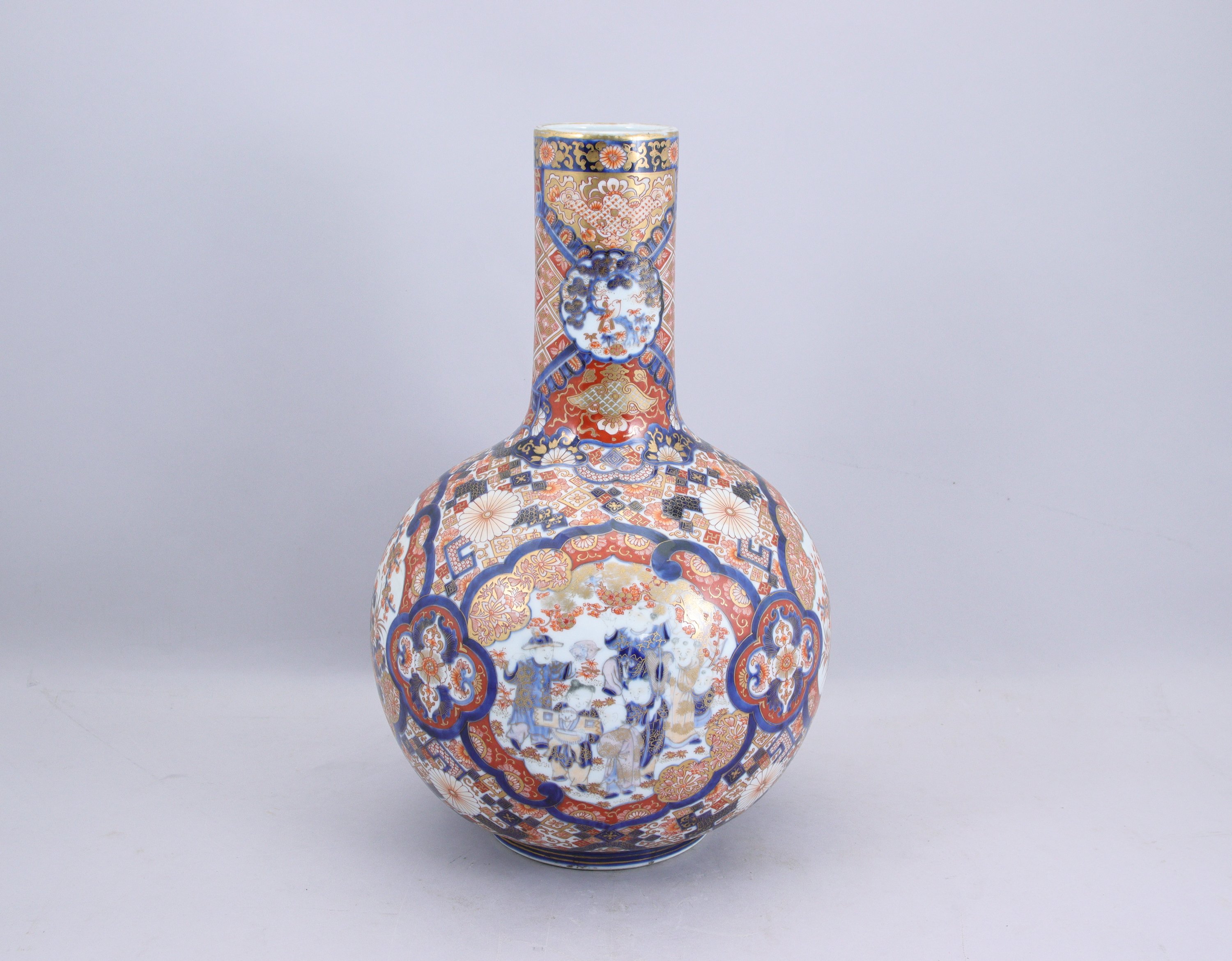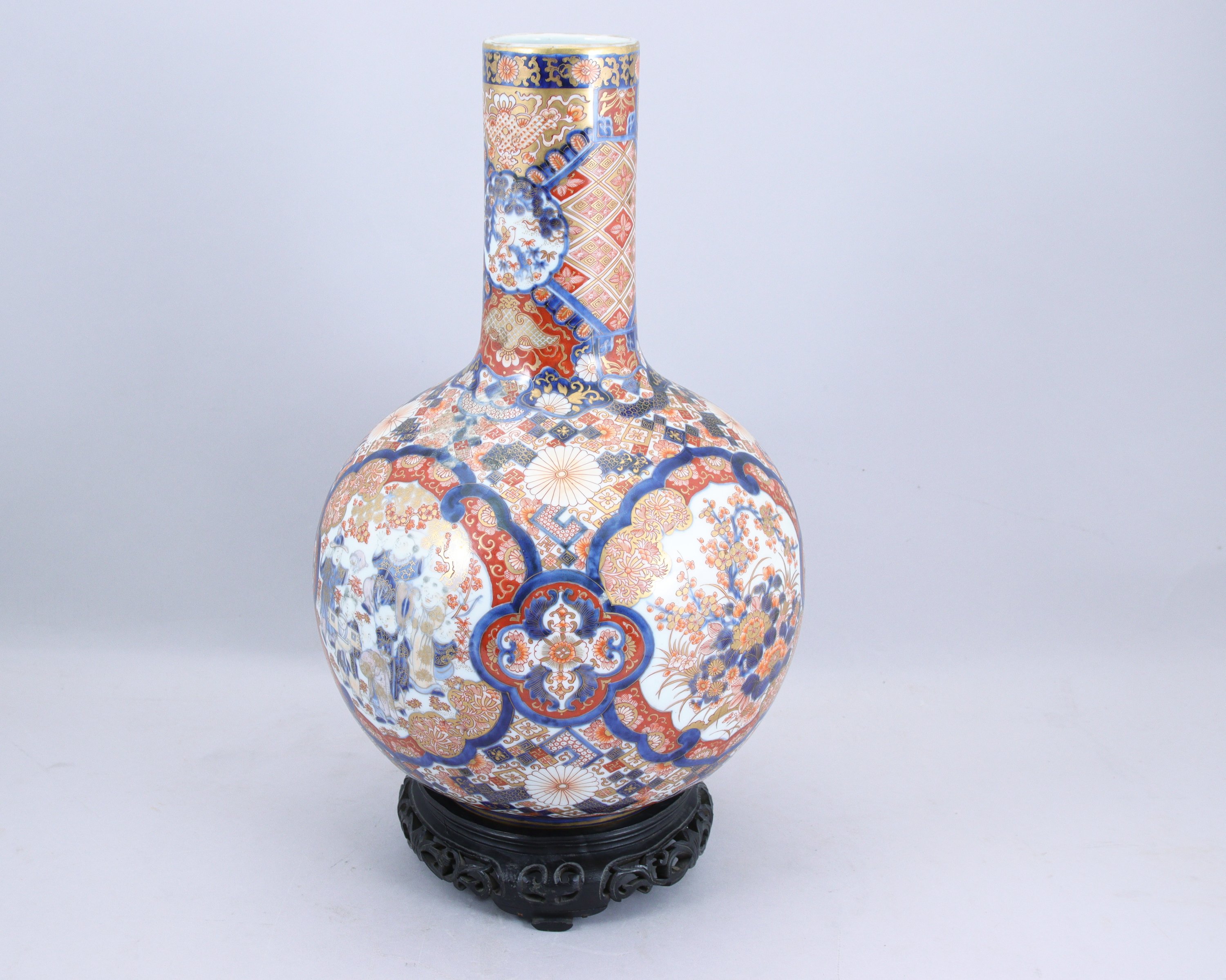 en porcelaine décorée en bleu sous couverte, rouge de fer et émail or dit "Imari" de réserves ornées d'enfants et pruniers et bambous sur fond de motifs géométriques et de fleurs. Au revers, la marque Fukagawa.