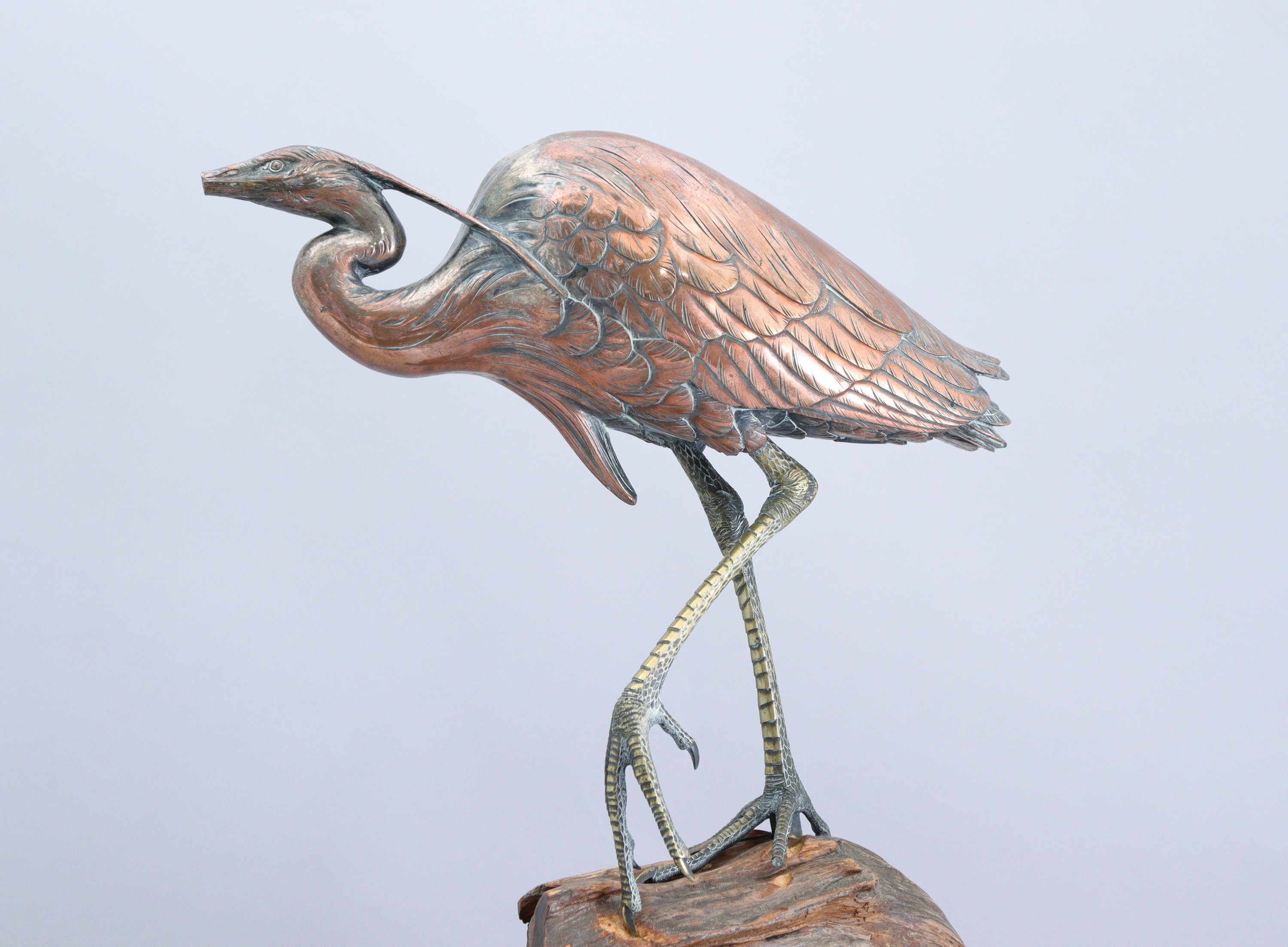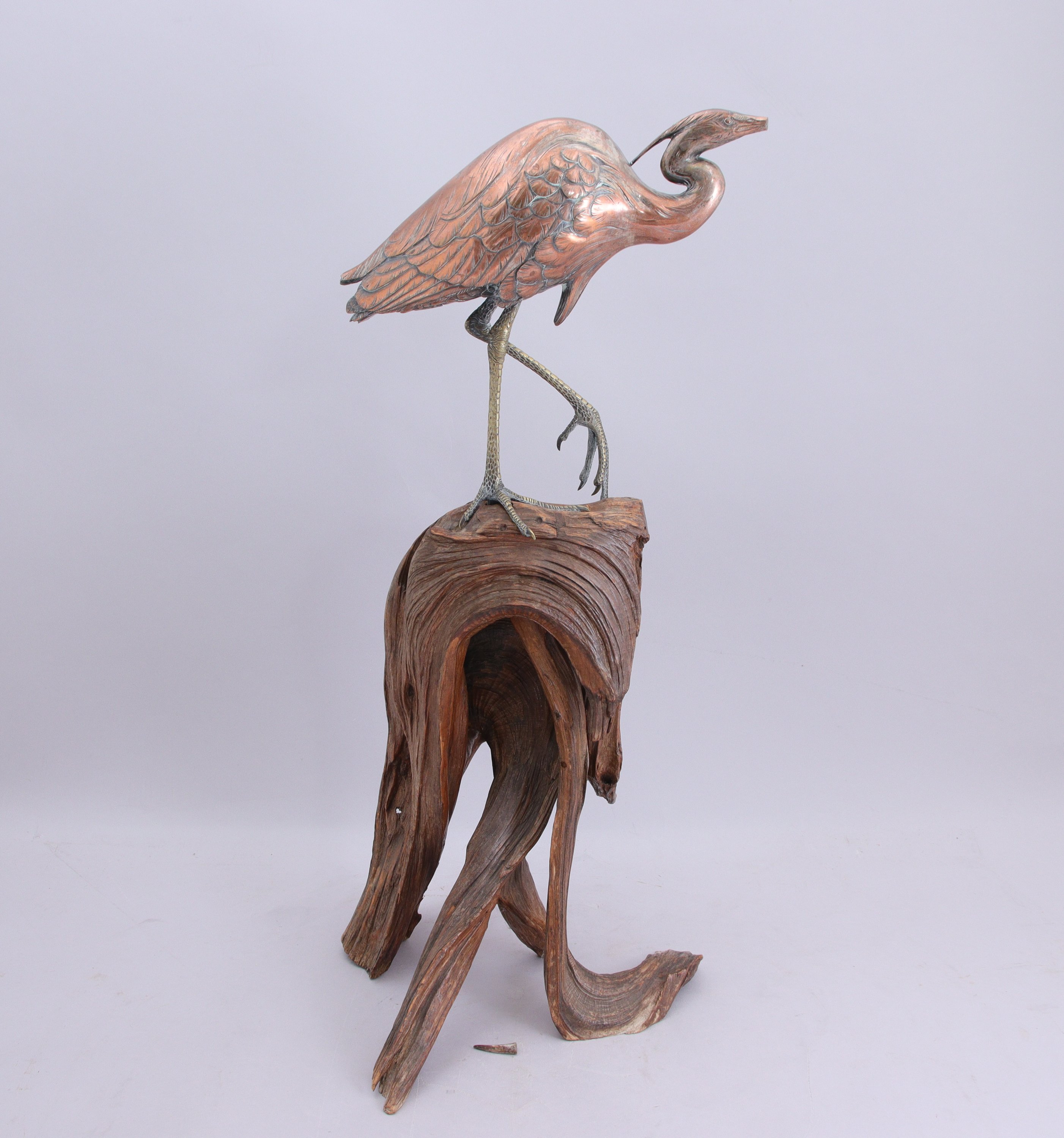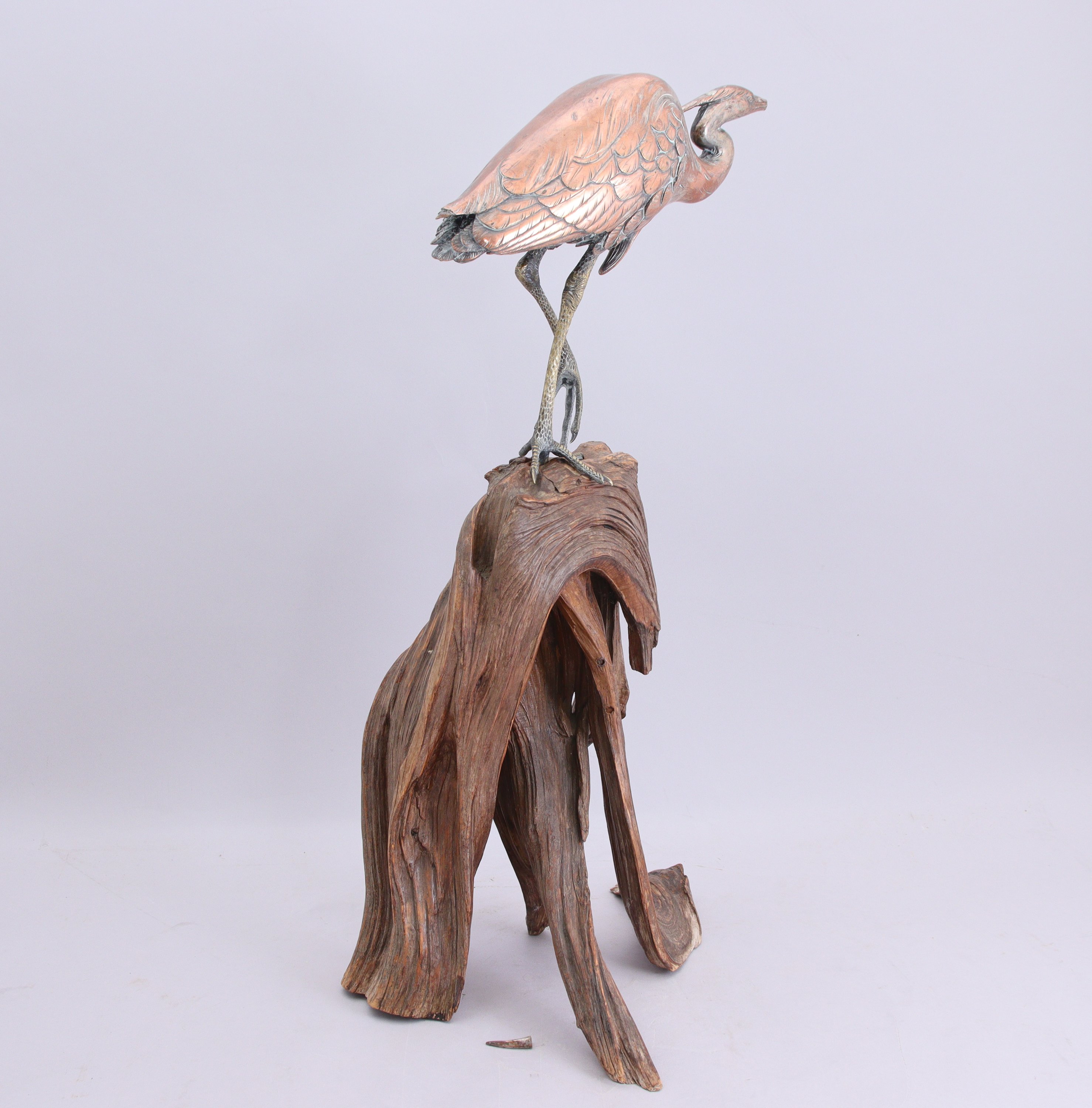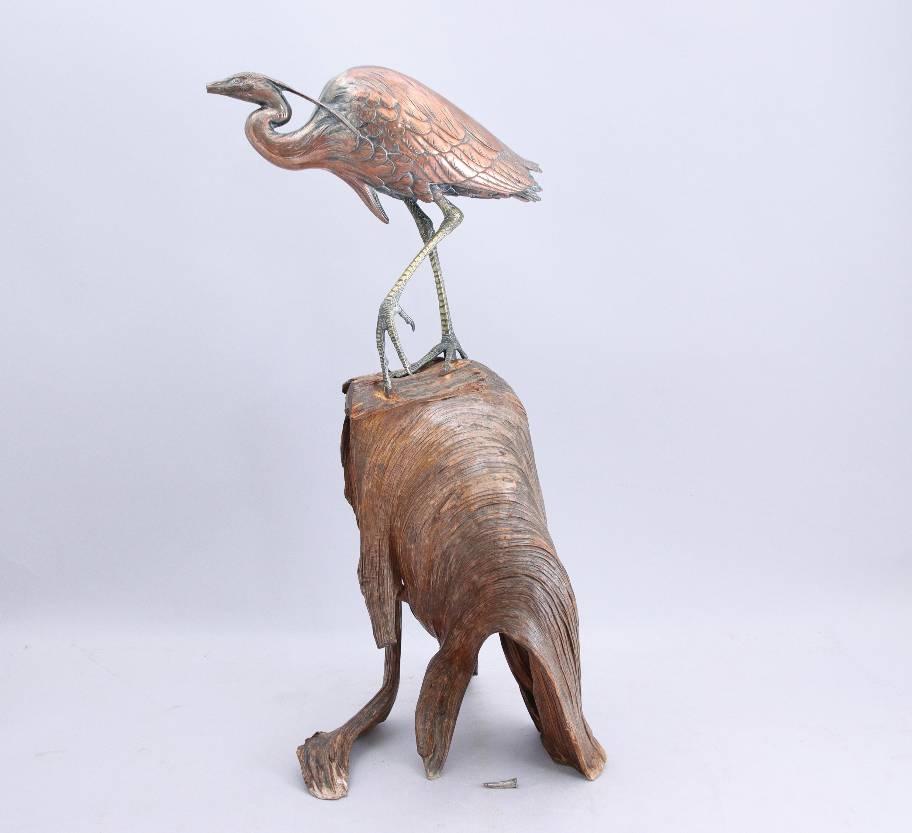 en alliage cuivreux argenté, aigrette posée sur son socle en racine.