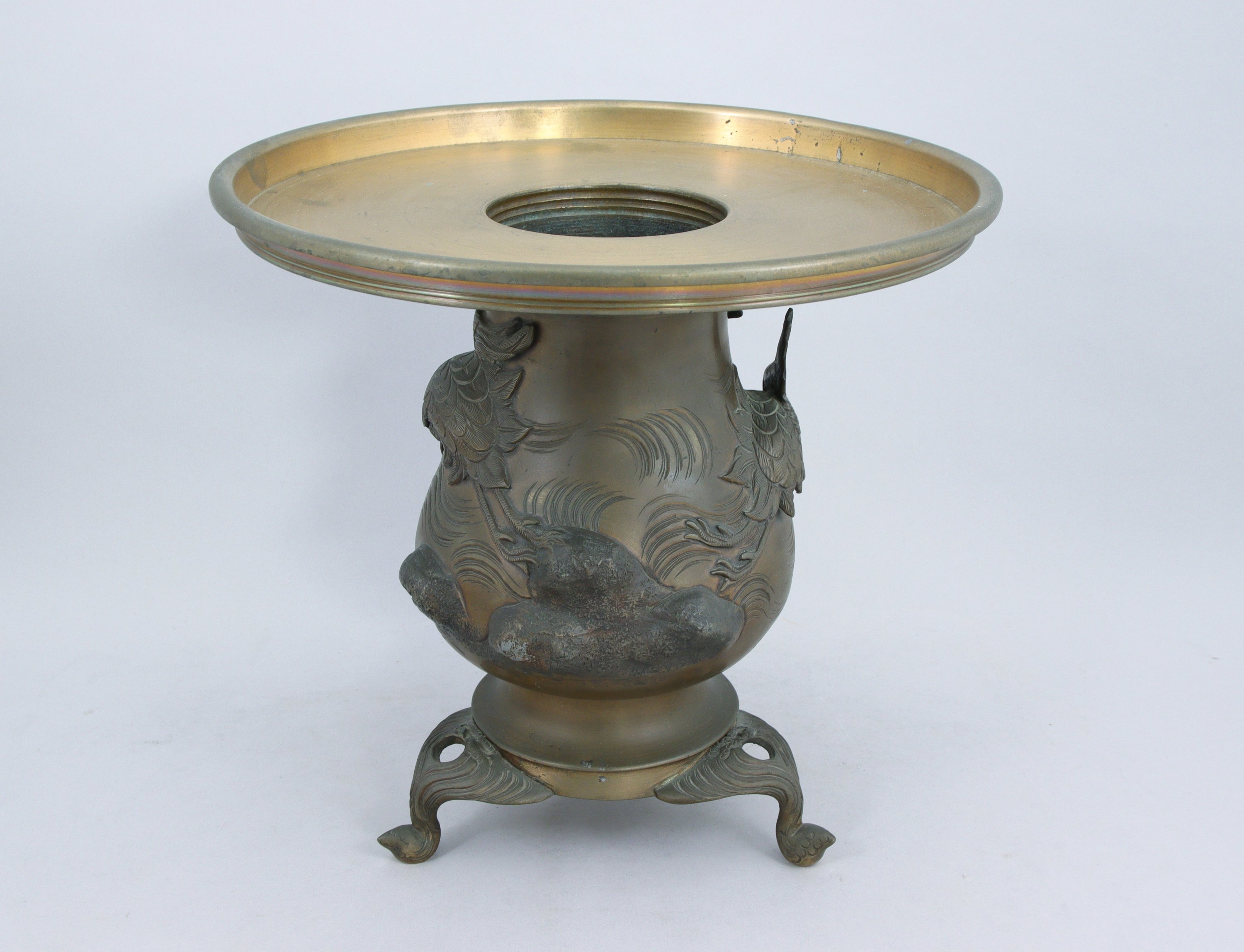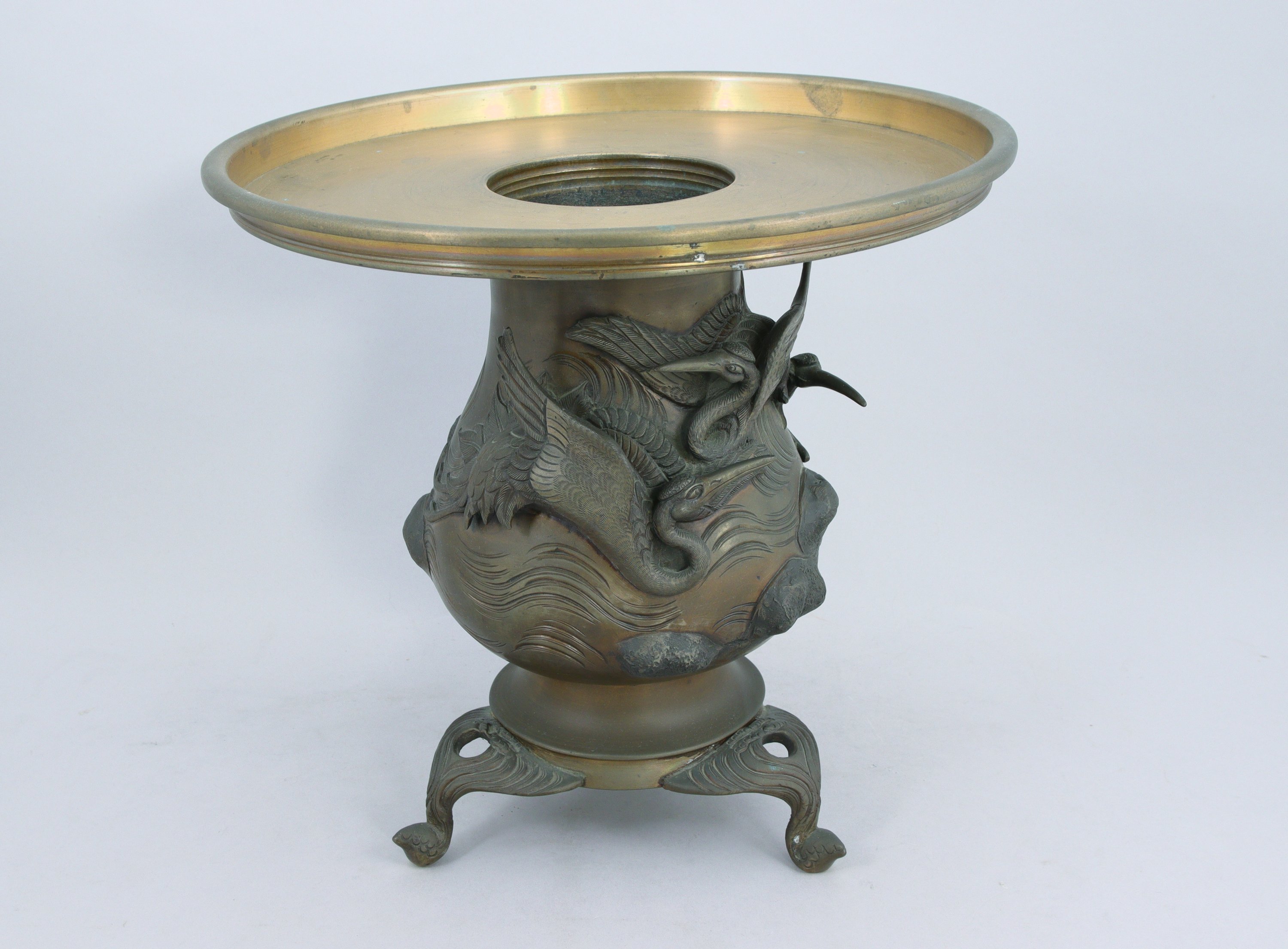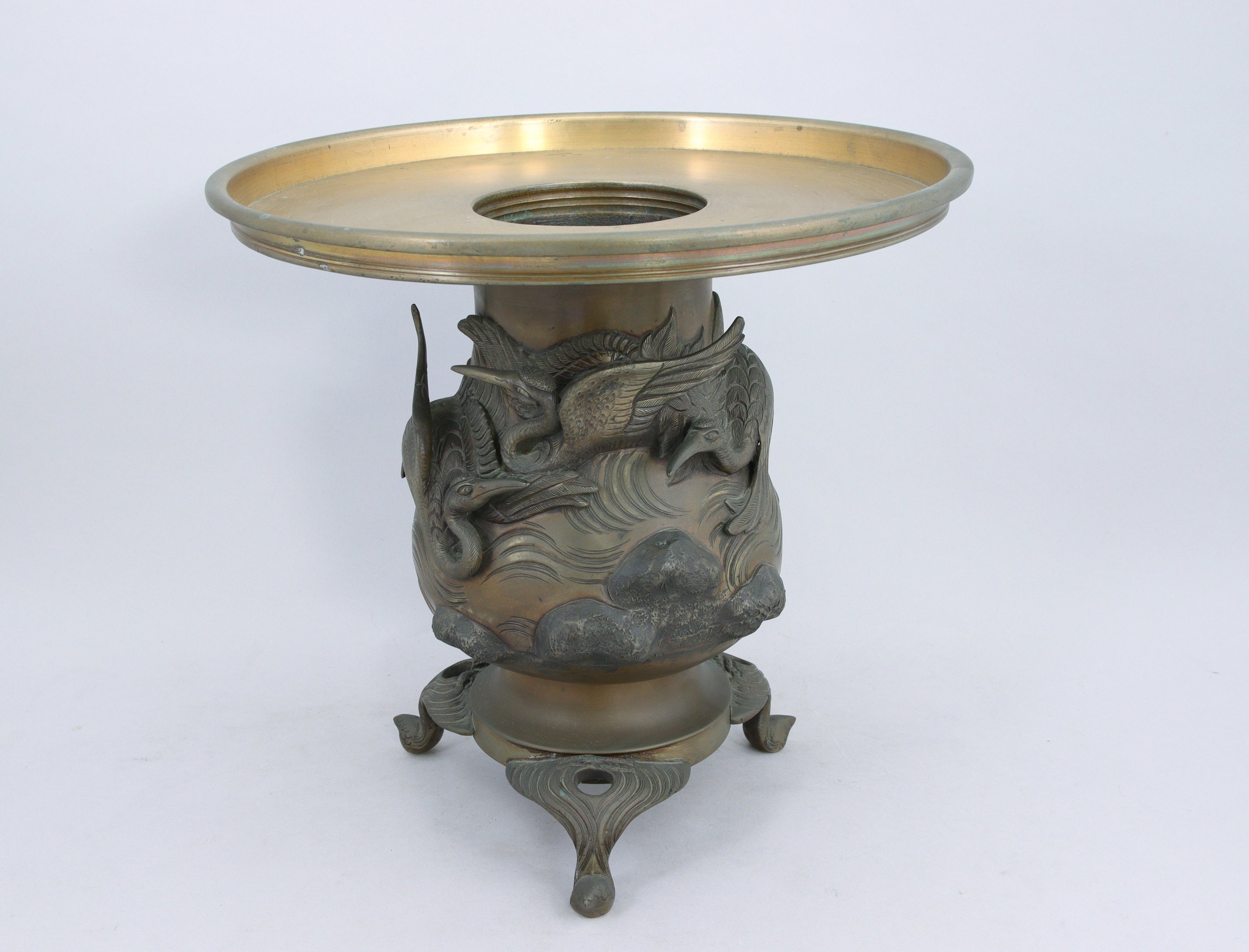 en bronze, à motif de hérons volant au dessus des rochers. Piétement tripode.