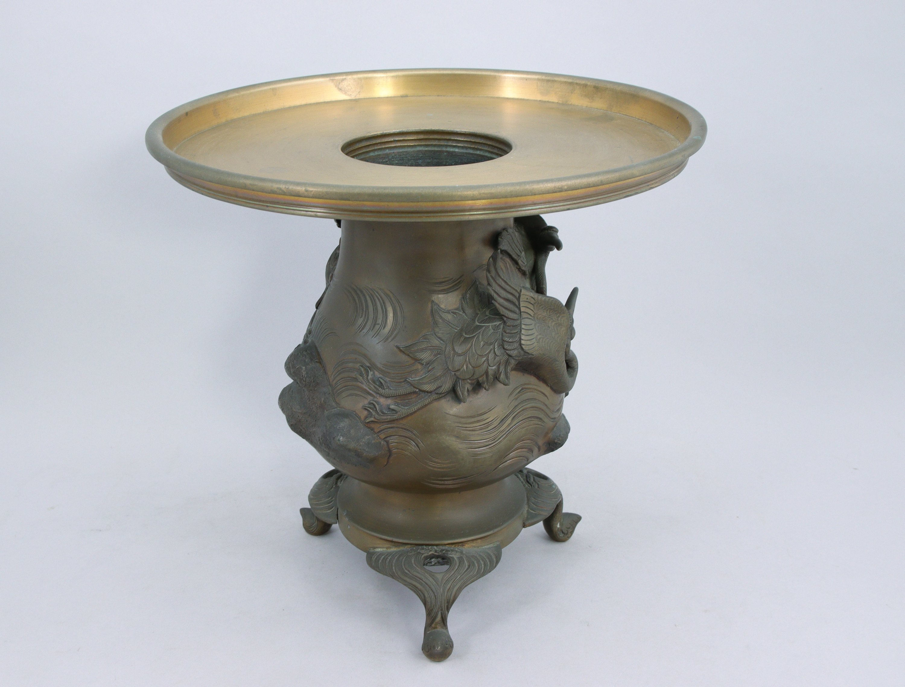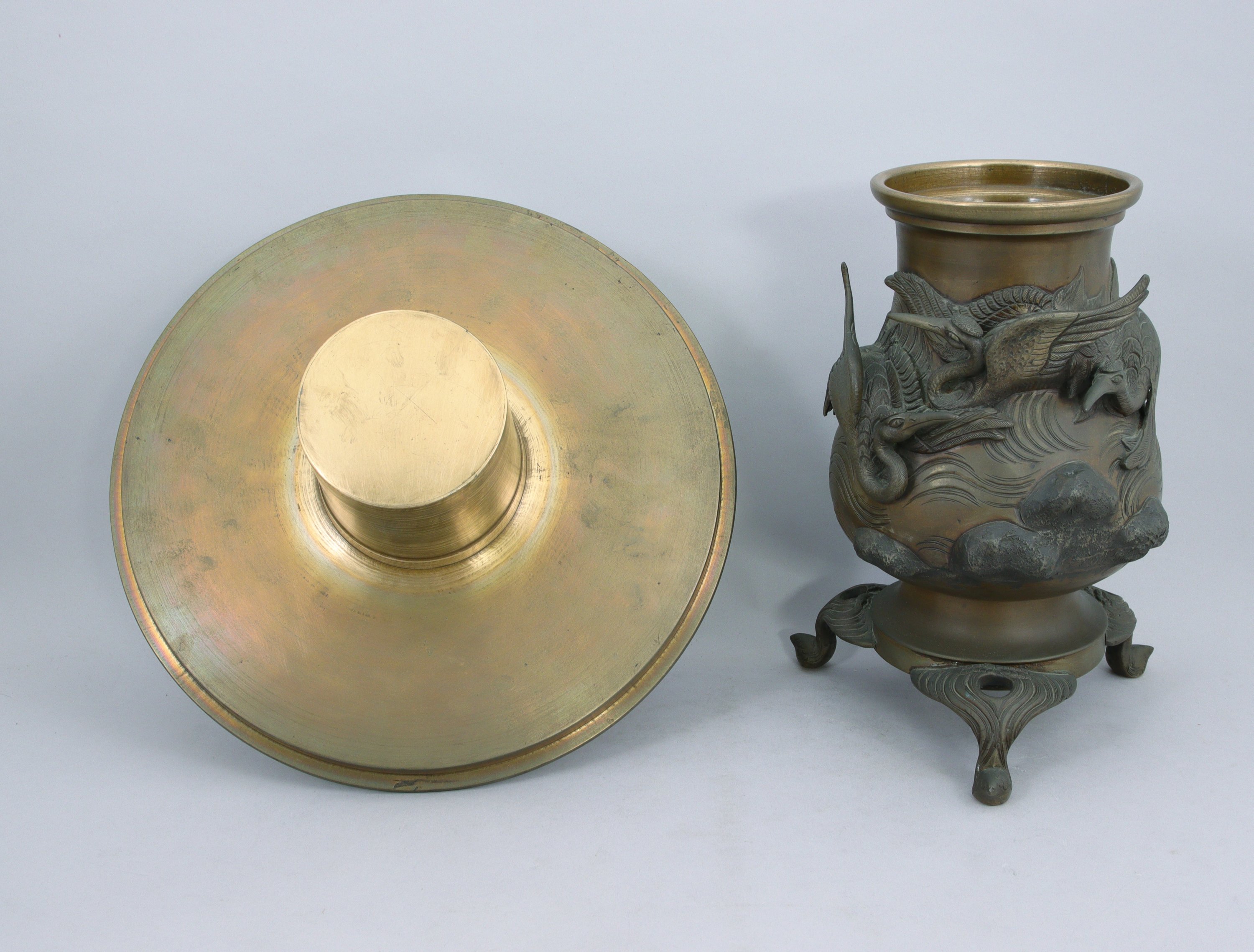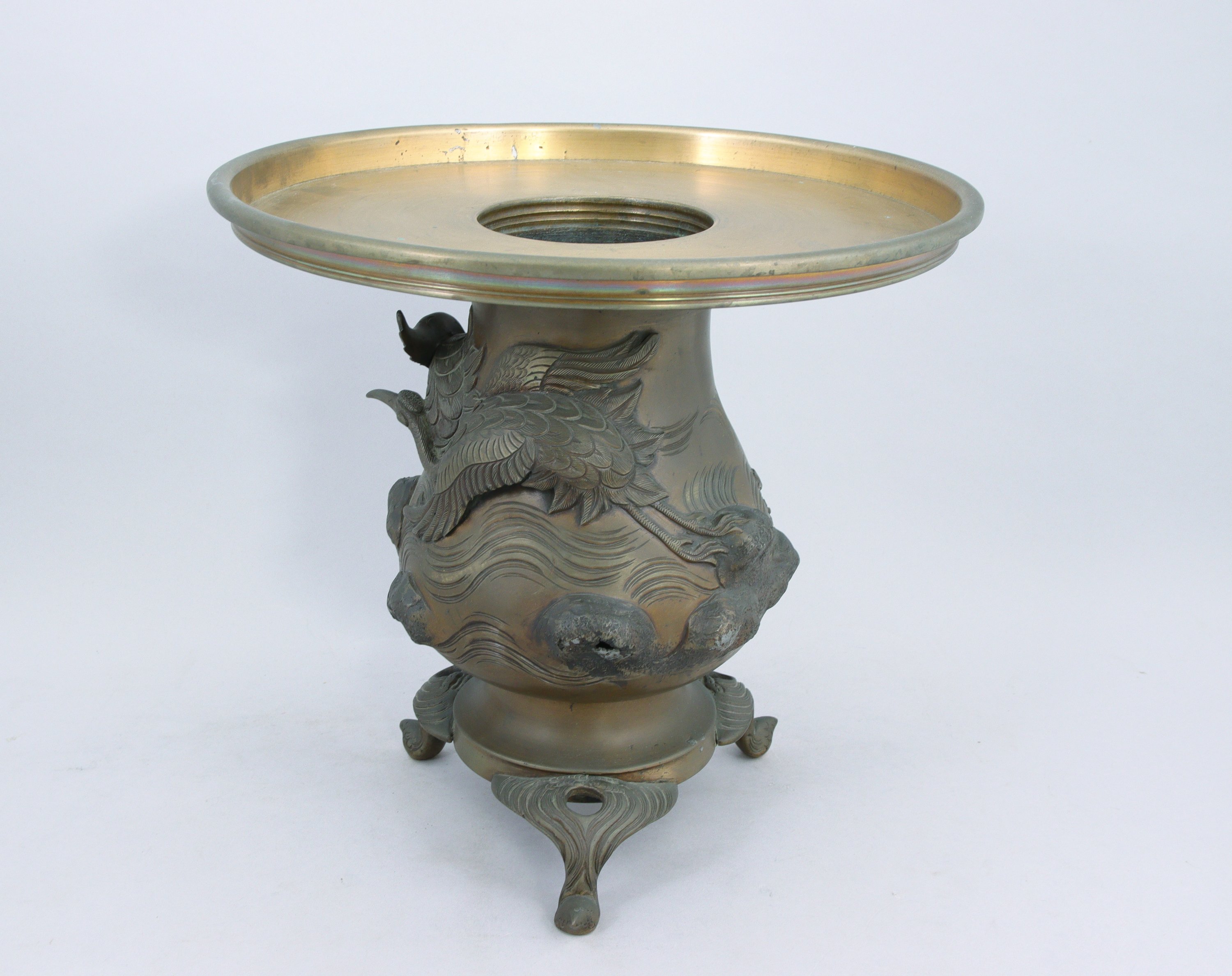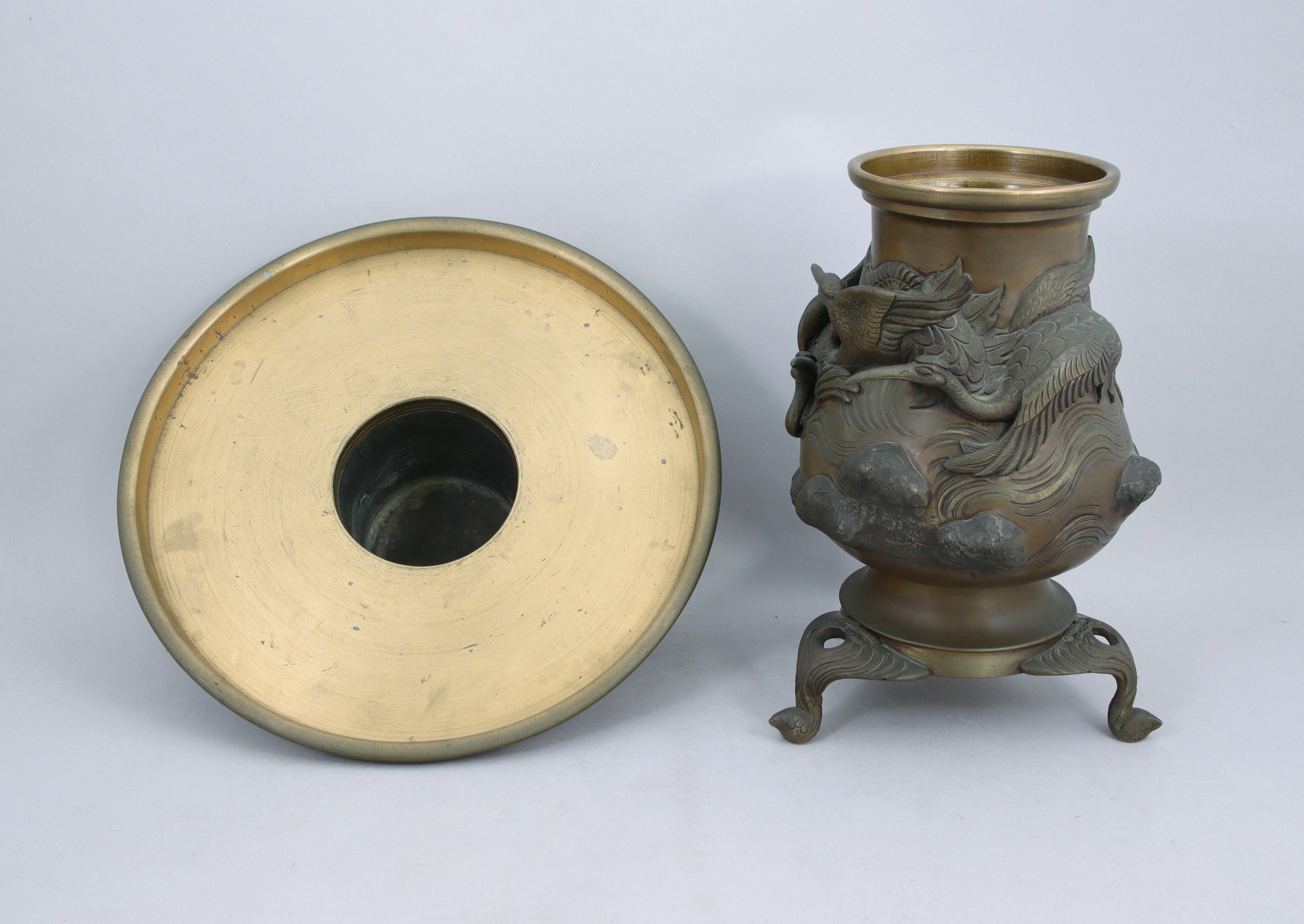 en bronze, à motif de hérons volant au dessus des rochers. Piétement tripode.
