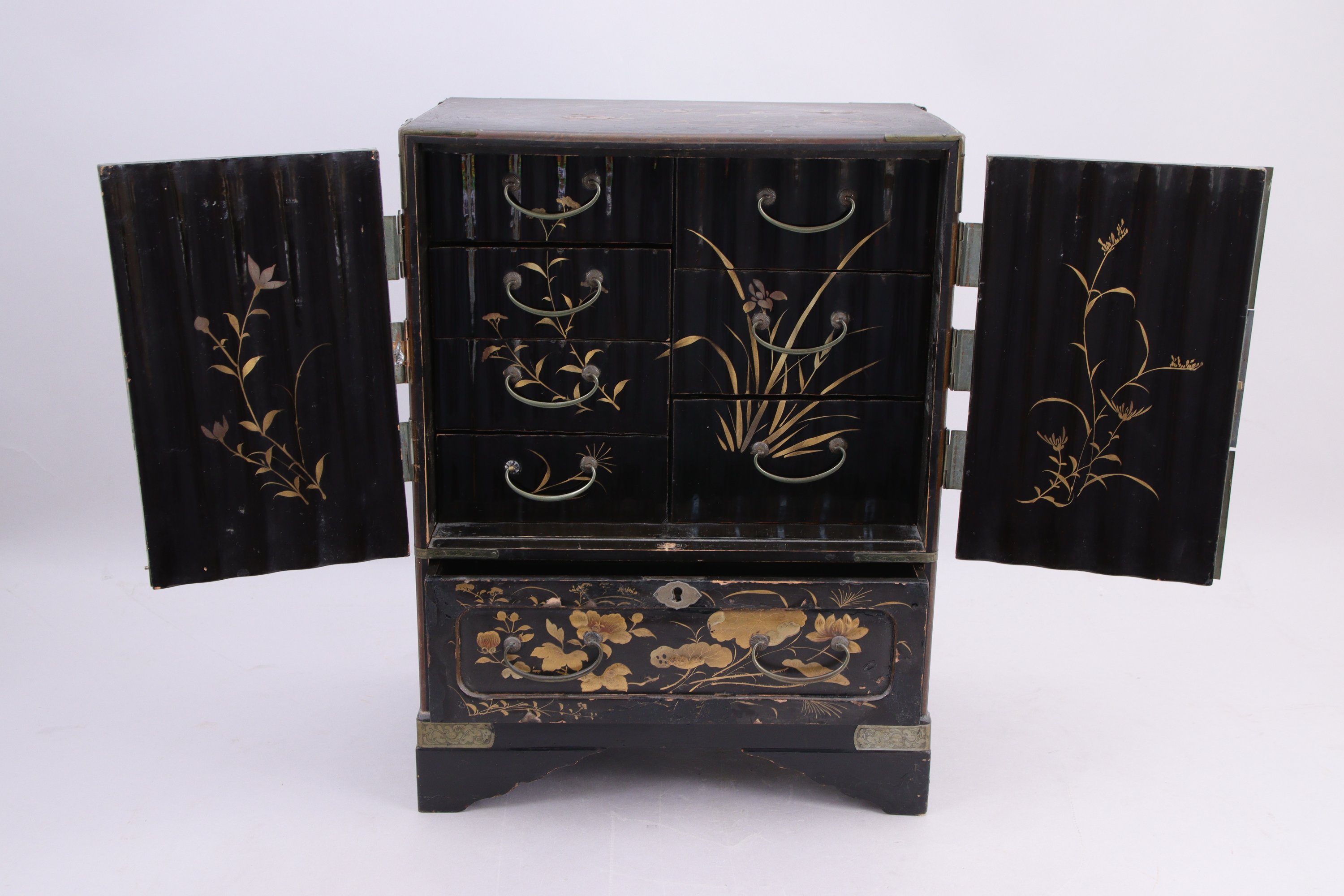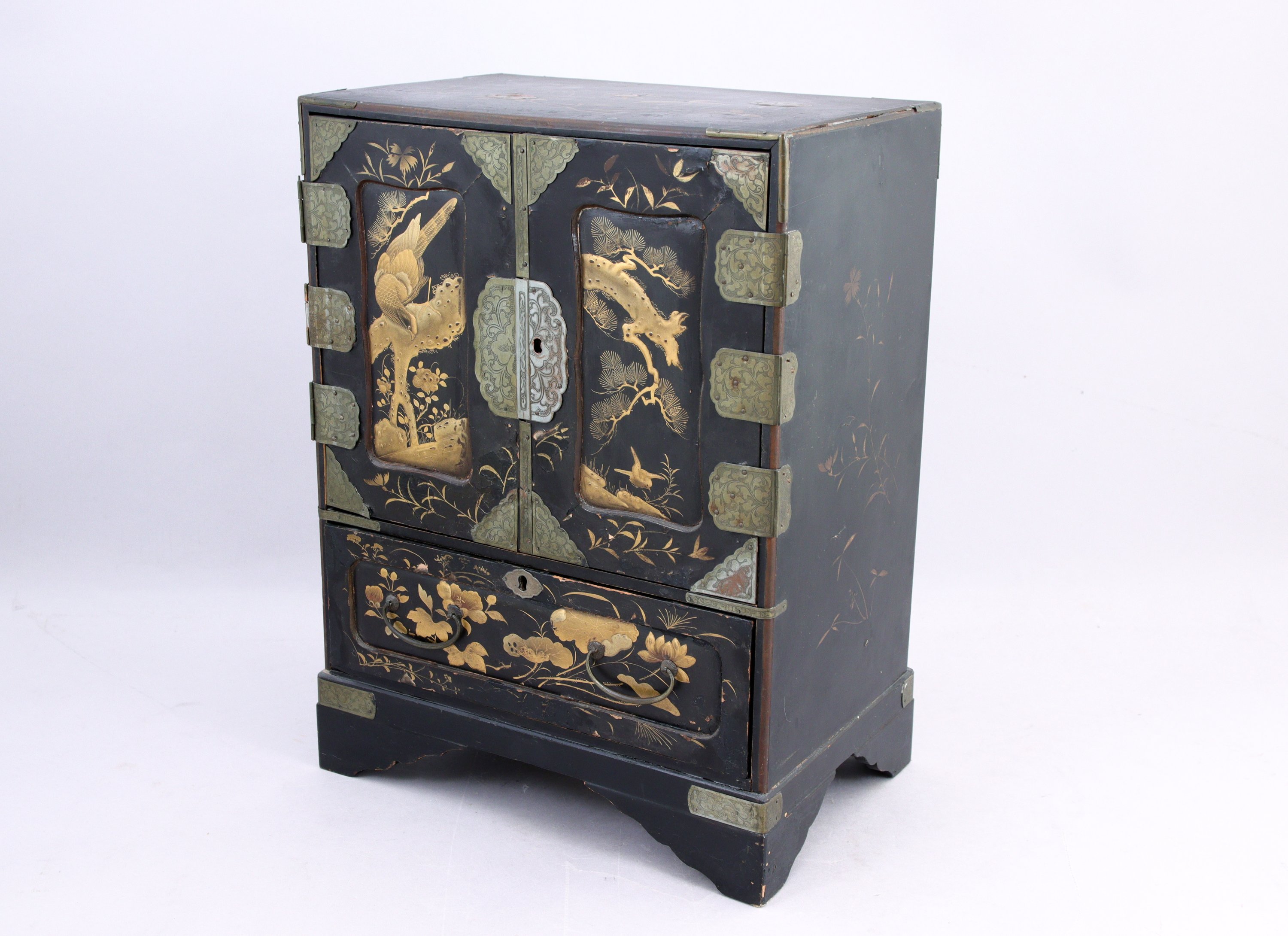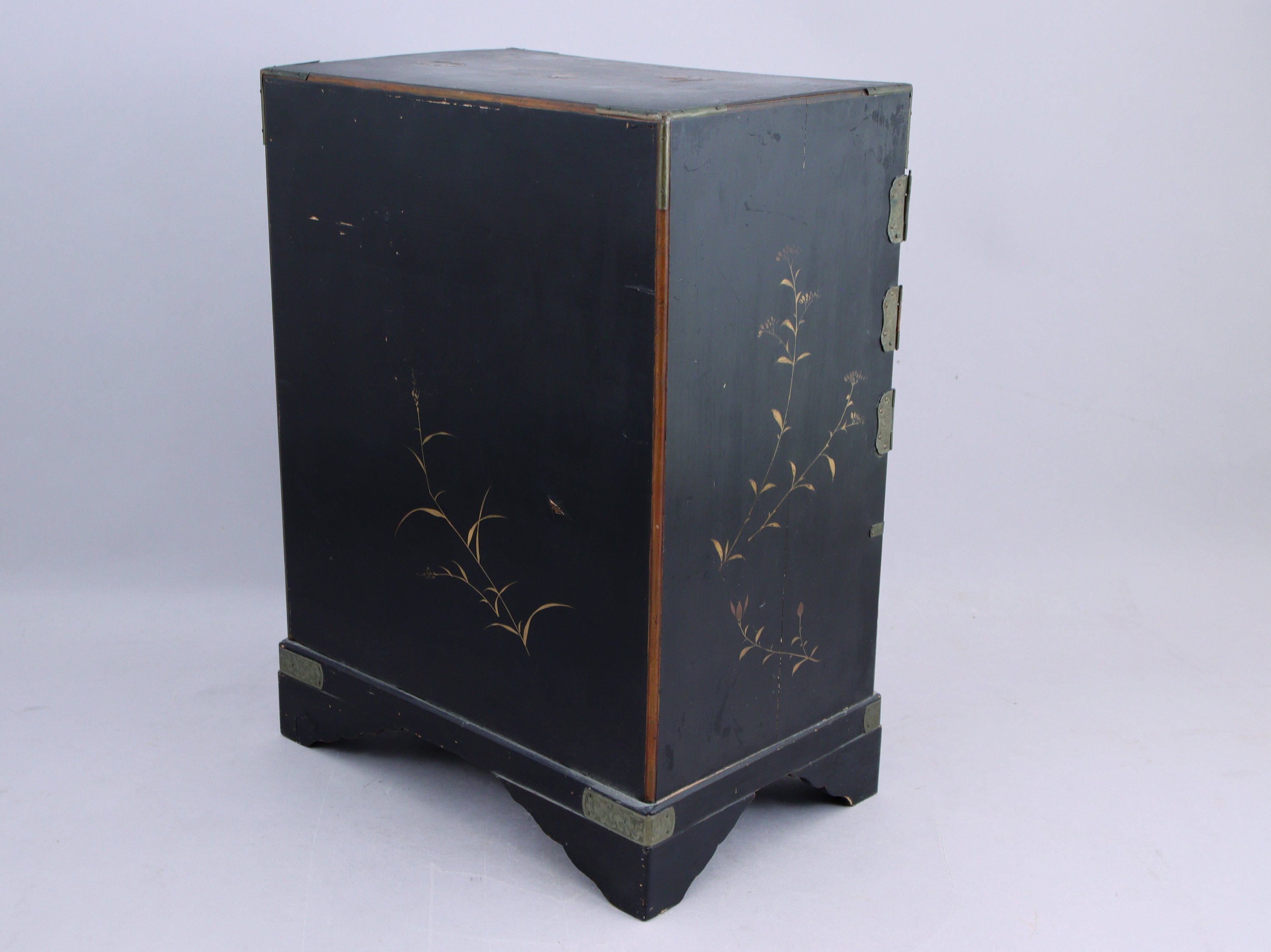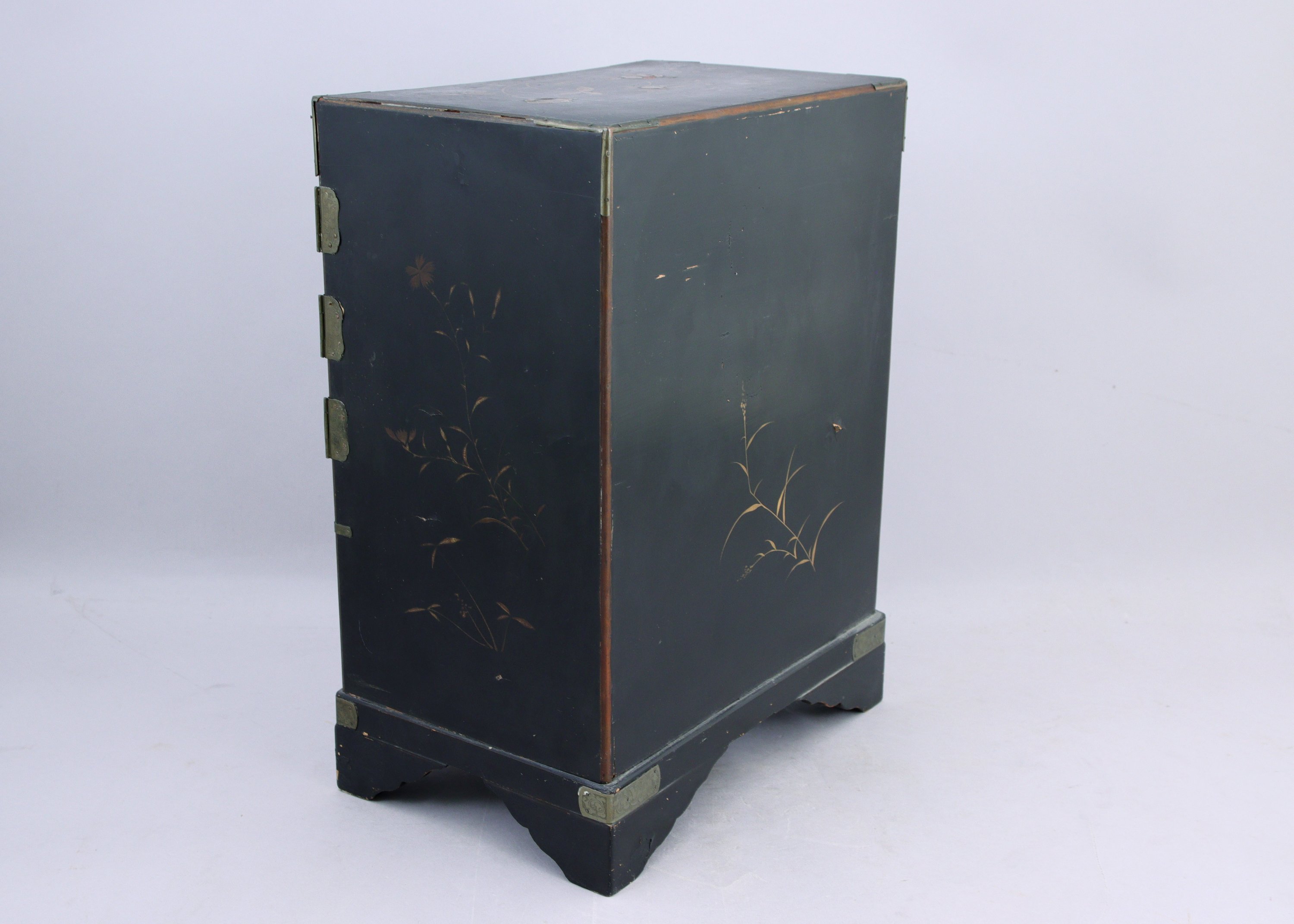 en bois laqué noir à décor d'oiseau et de végétaux, ouvrant sur la facade avant par un tiroir et deux portes, et à l'intérieur, trois tiroirs.