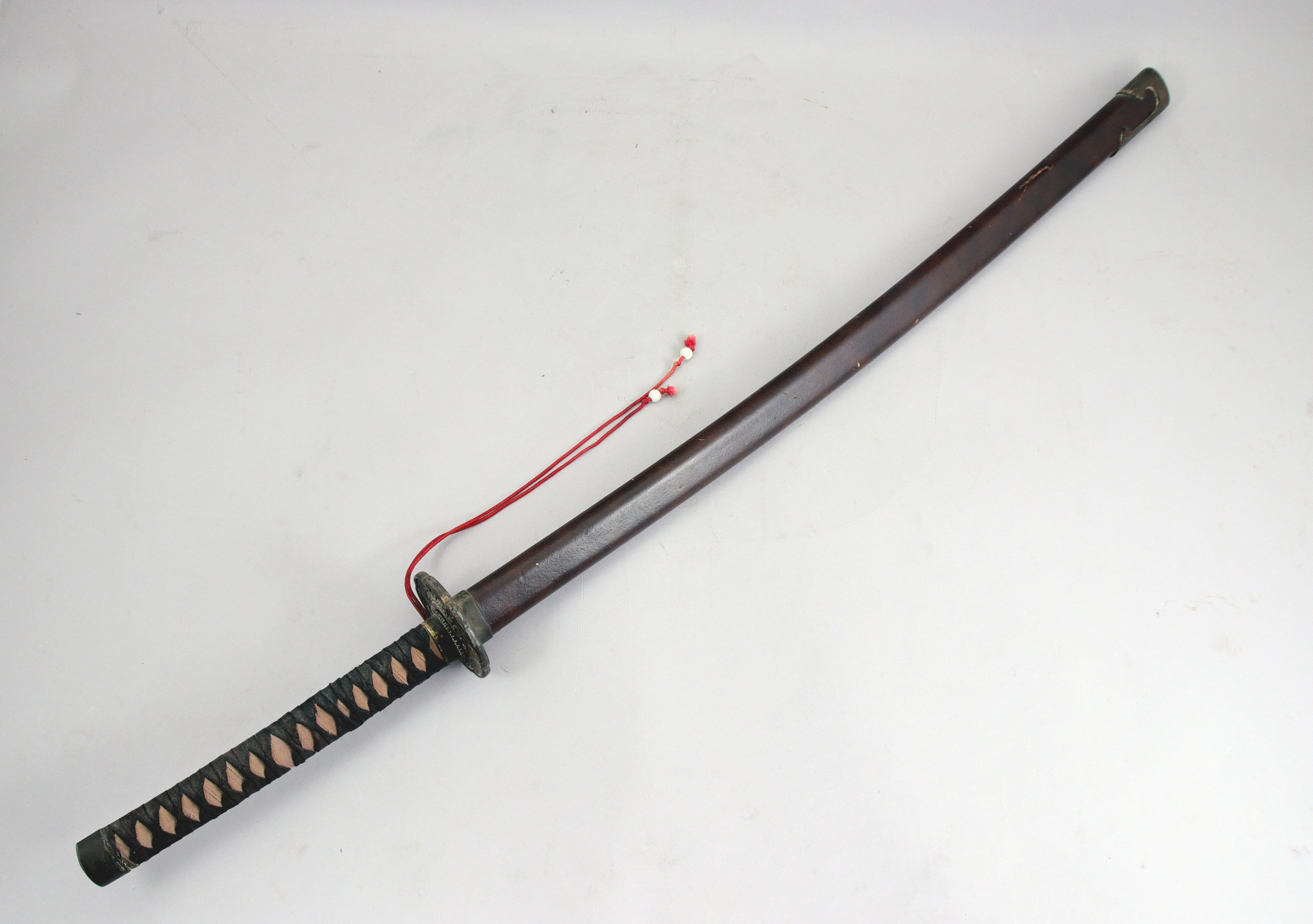 lame en acier gravée de dragons, poignée recouverte de tissu et renforcée de bronze, garde en bronze gravée de motifs floraux et fourreau recouvert de cuir brun.