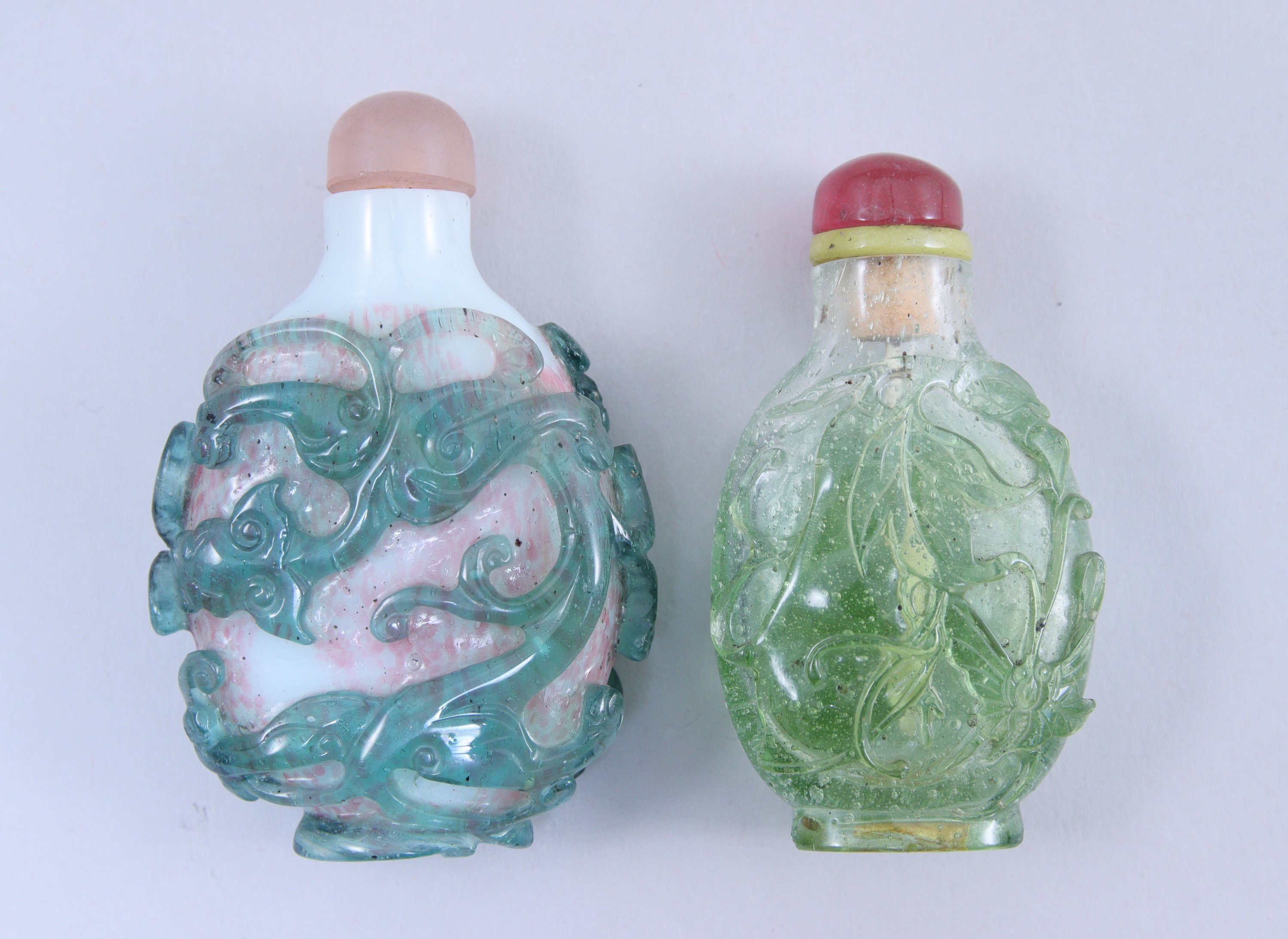 en verre overlay, l'un aplati à col droit, en vert sur fond rose sandwich et blanc à décor de qilong contorsionnés sur chaque face, l'autre en vert sur fond translucide bullé d'une branche de grenades sur une face, d'une branche de haricot sur l'autre face. Bouchon en quartz rose.