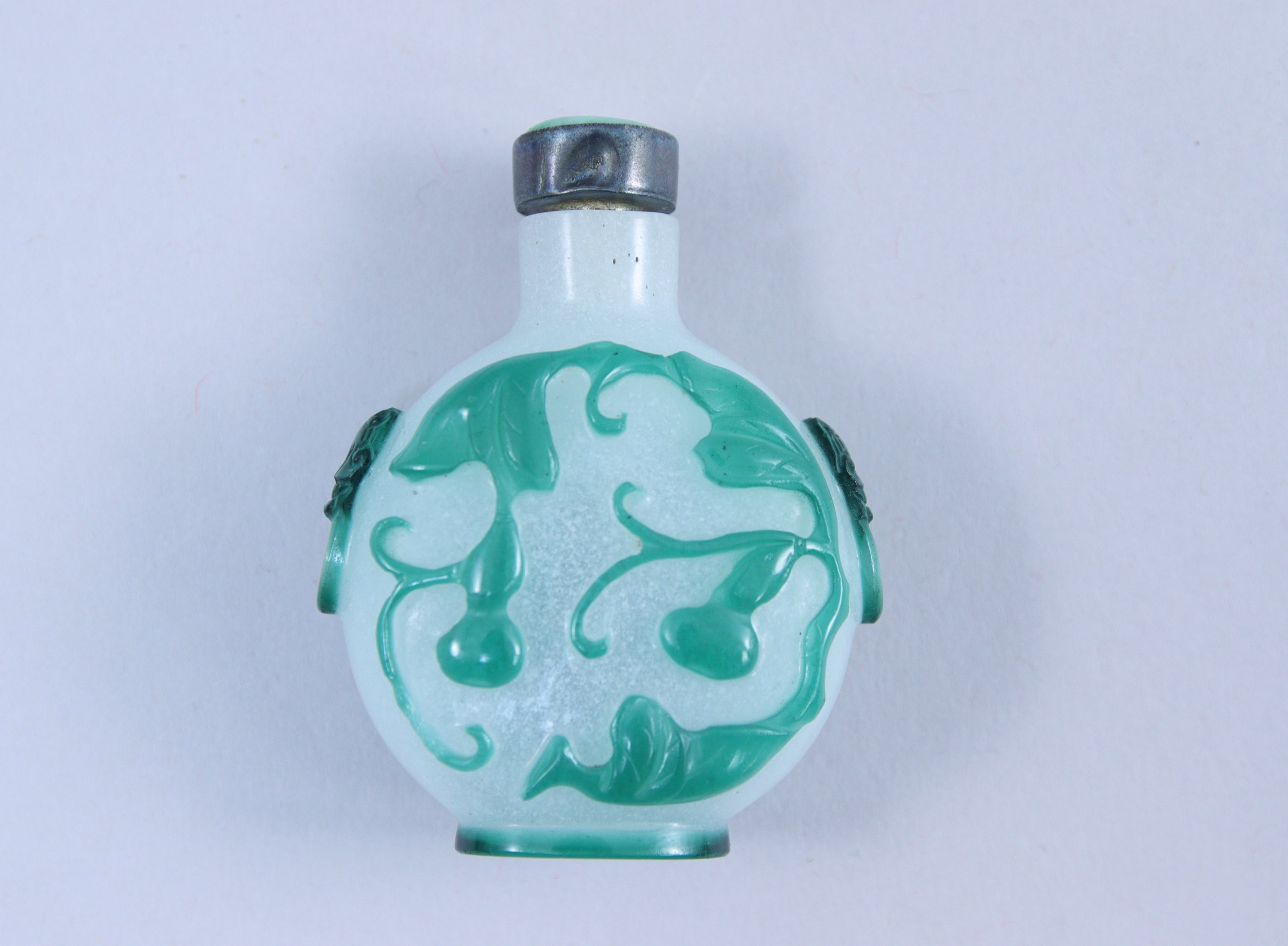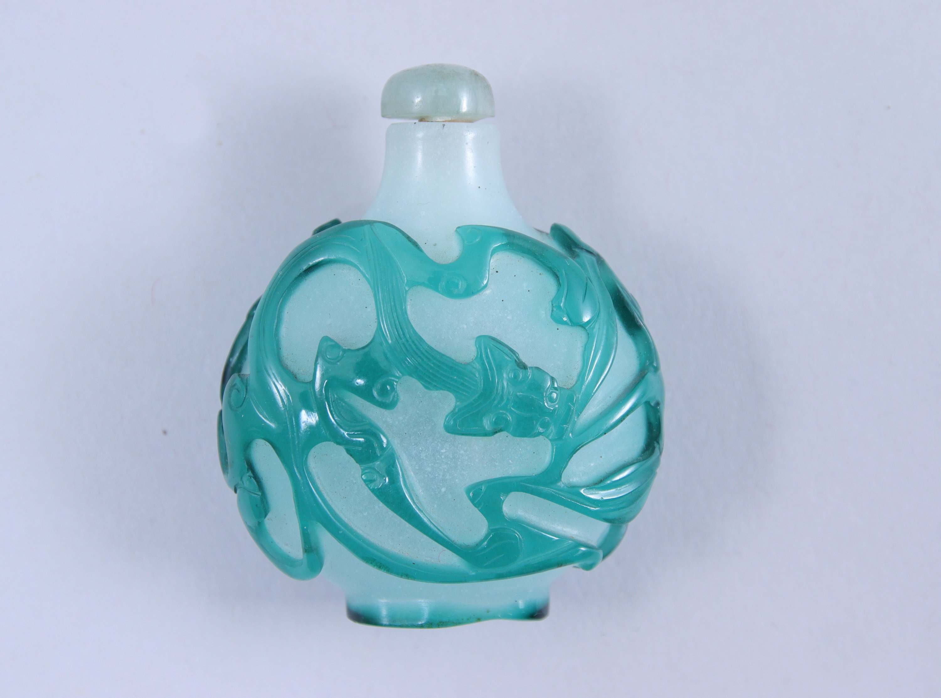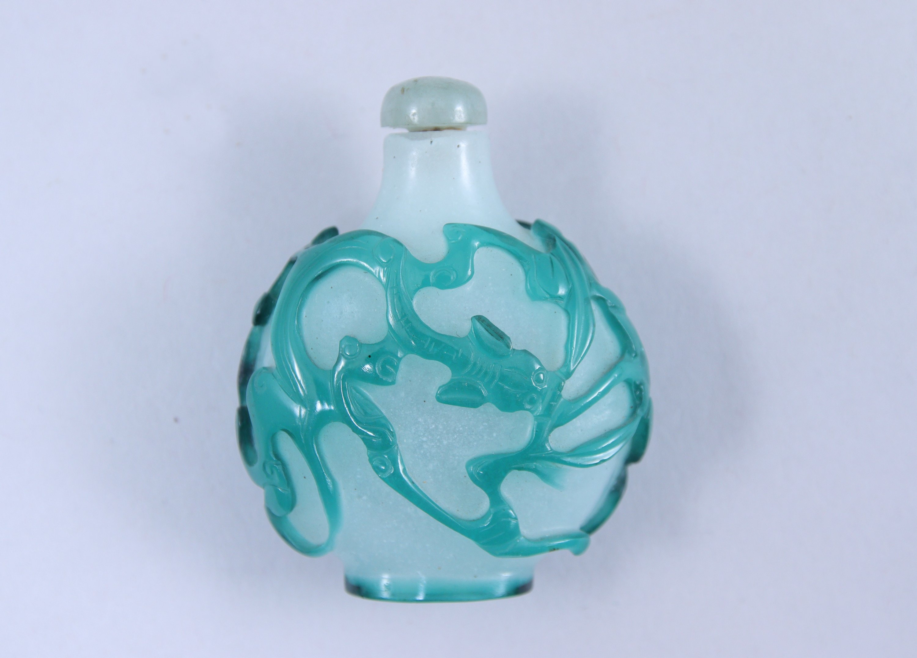 en verre overlay vert sur fond bullé d'un qilong contorsionné avec une branche de lingxi dans la gueule sur chaque face. Bouchon en néphrite.