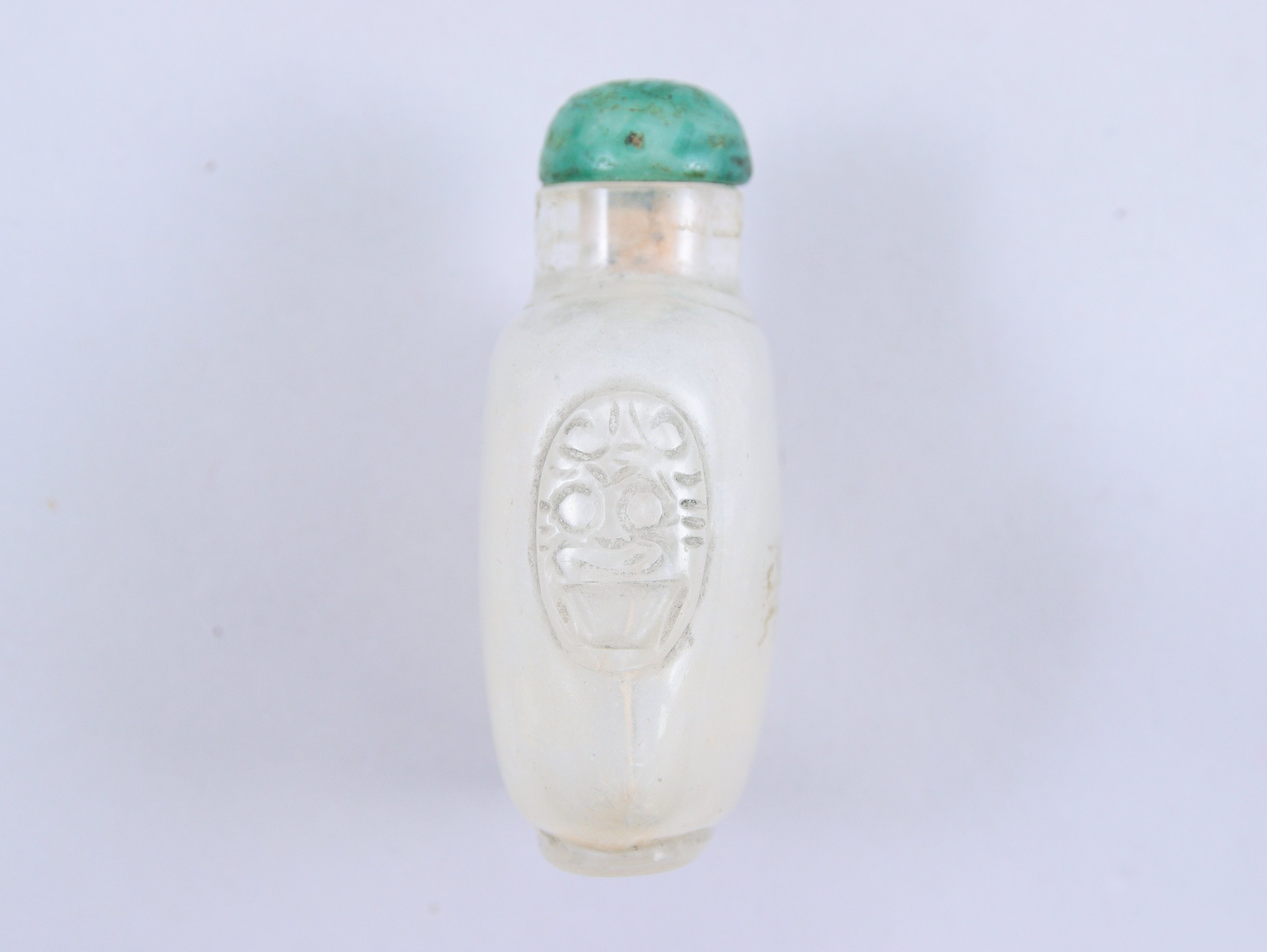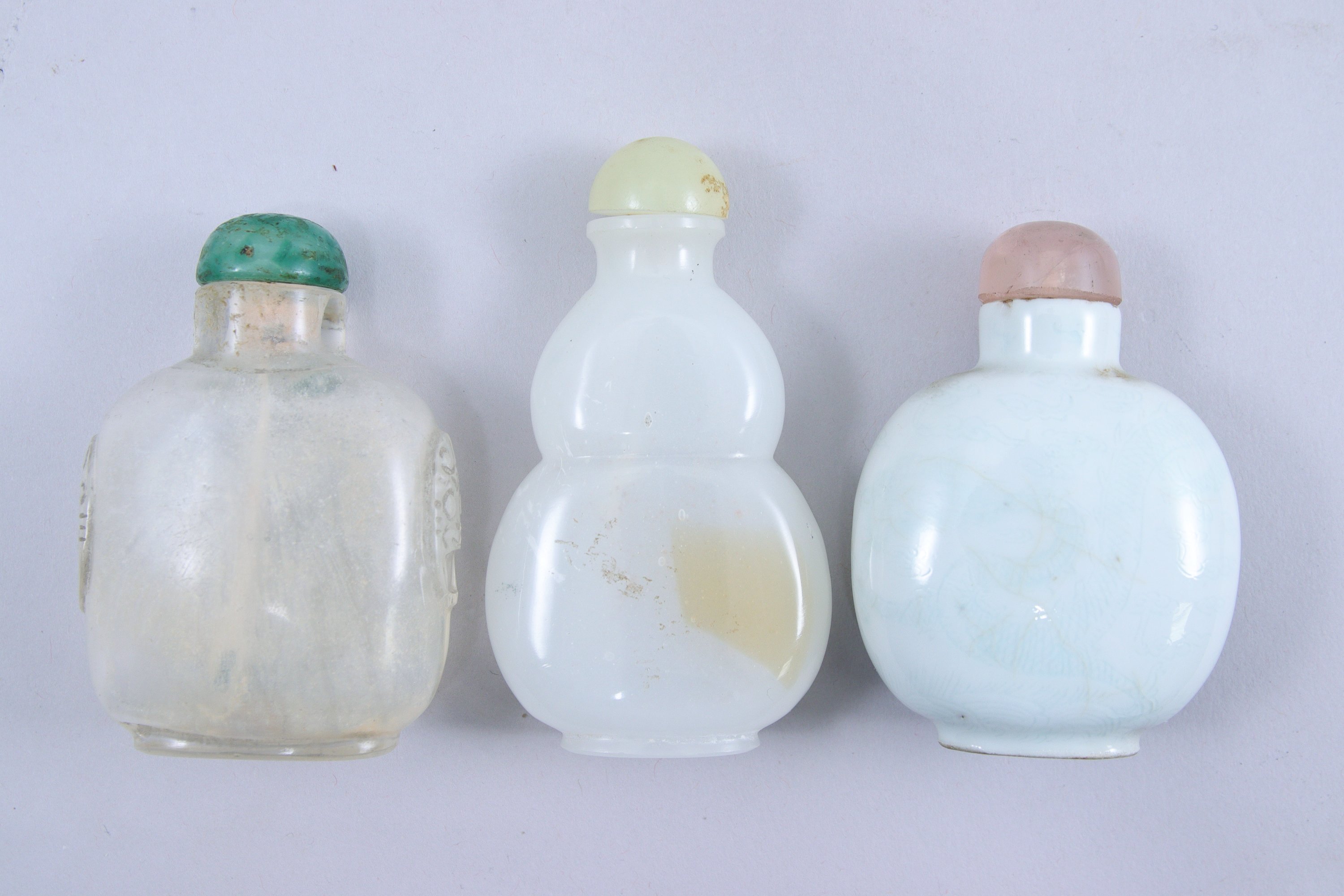 dont deux en verre, l'un rectangulaire translucide à décor sculpté sur les côté de têtes de shishi, l'un translucide double goure, l'autre en porcelaine à décor dit anhua de dragons au dessus des flots parmi les nuages.