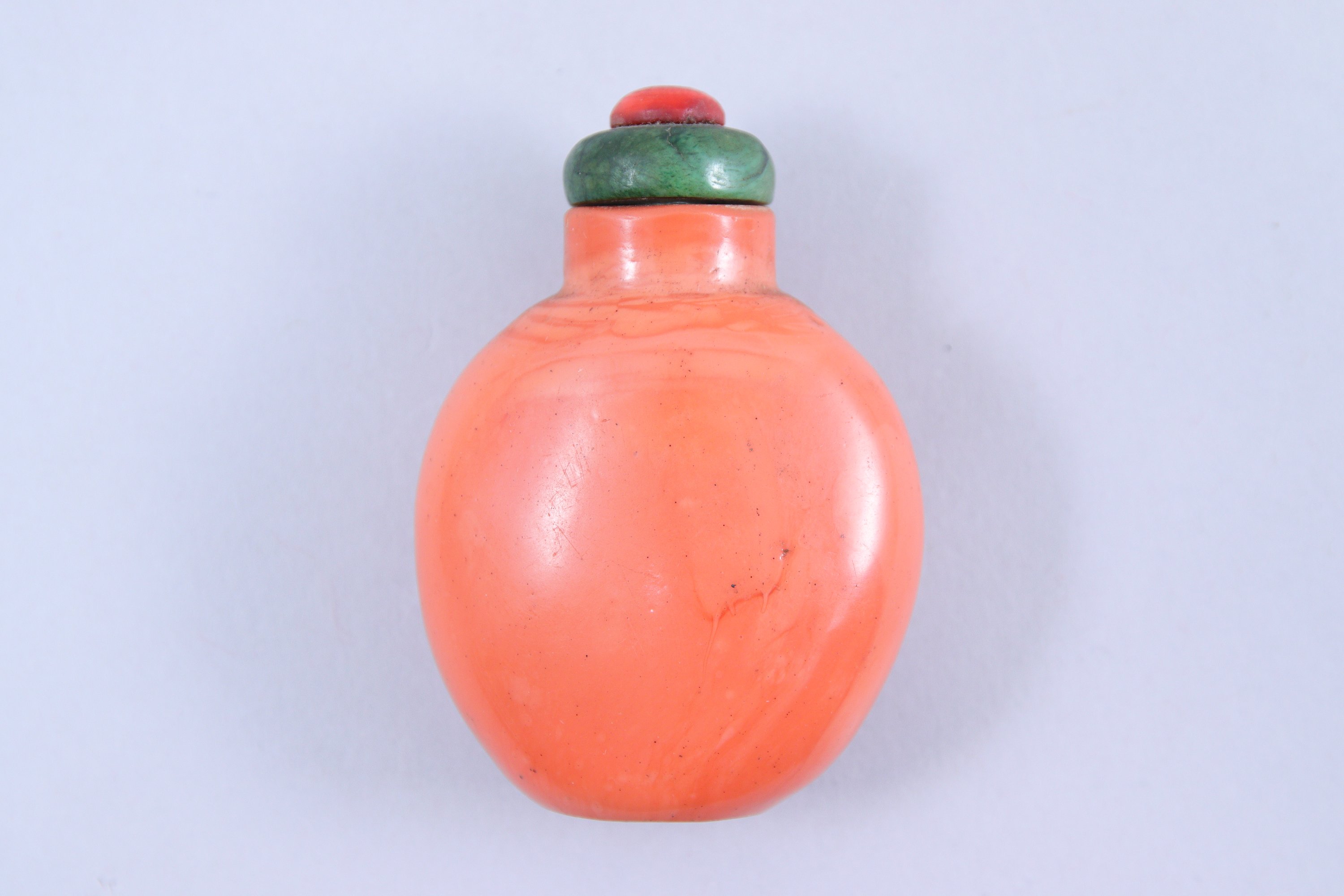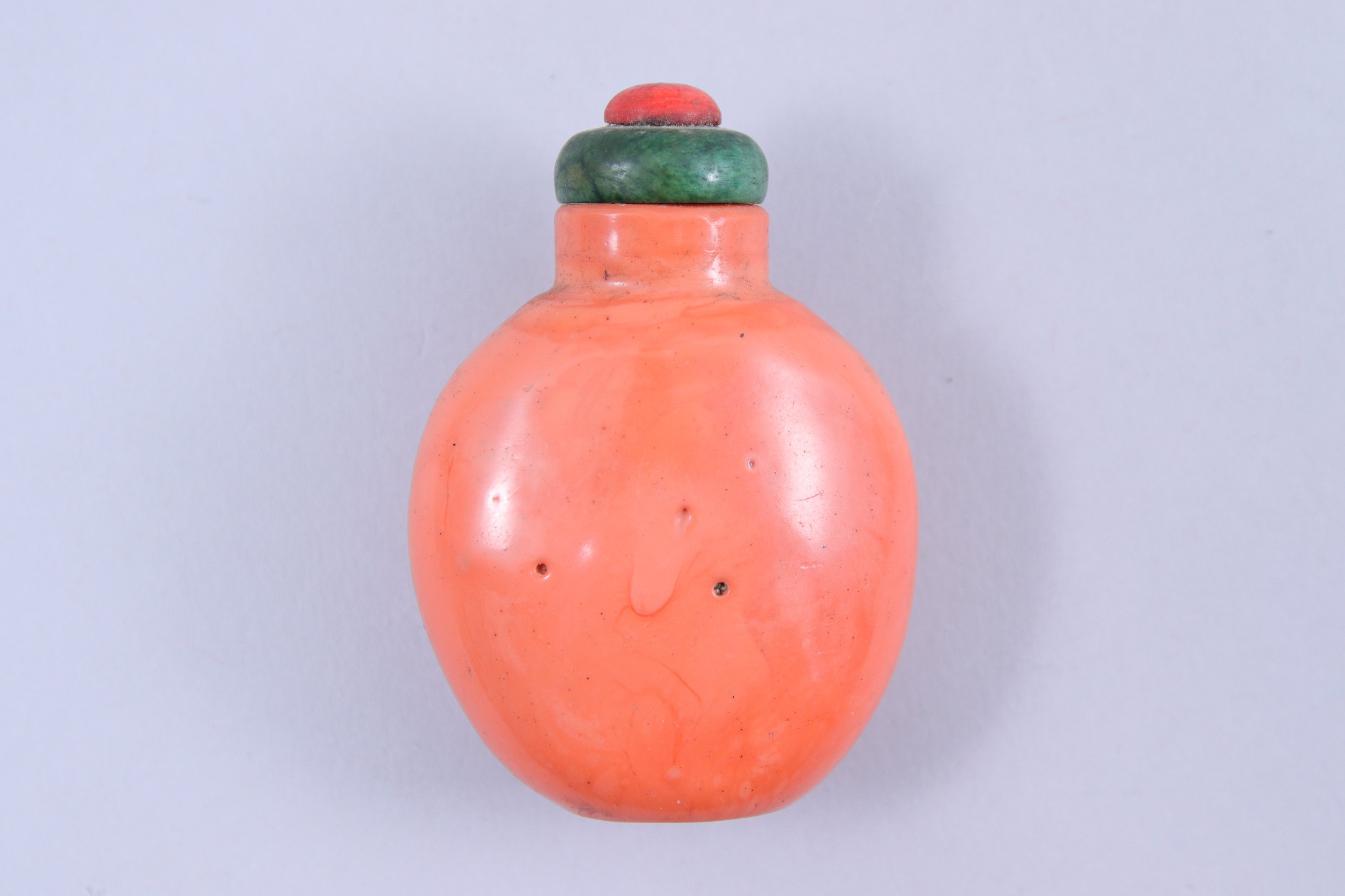 balustre à petit col droit en verre imitant le corail rouge. Bouchon teinté d'un cabochon en rouge corail cerclé de vert.