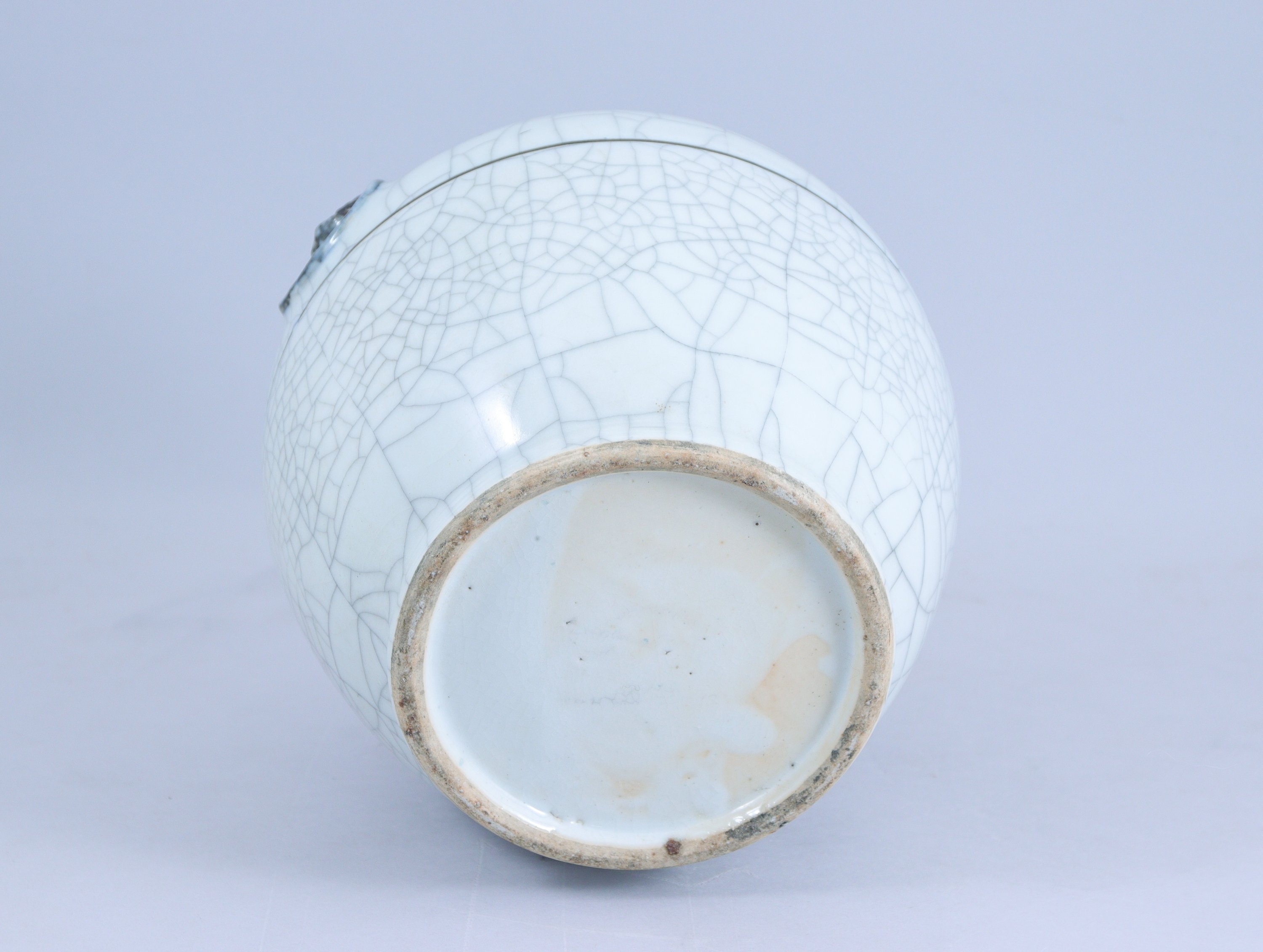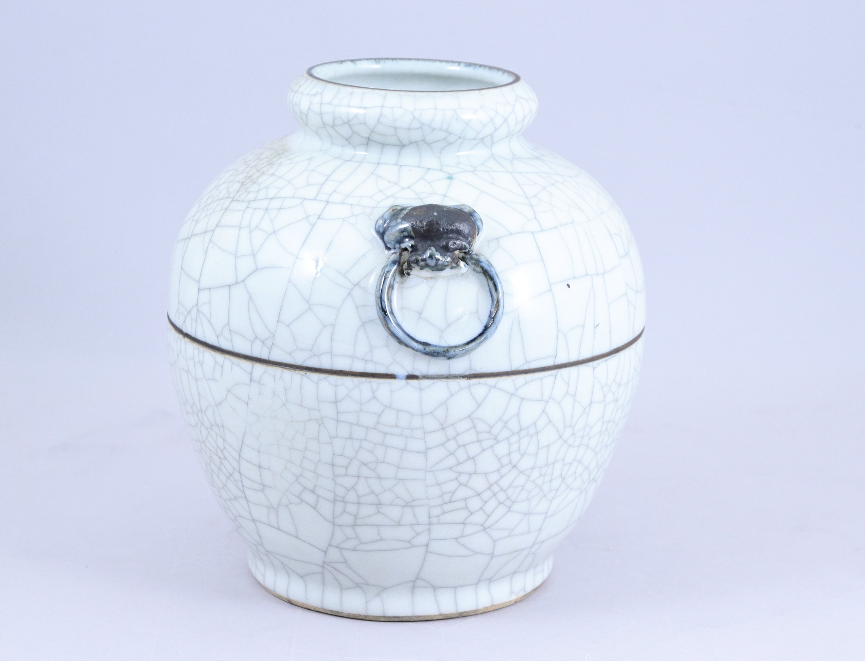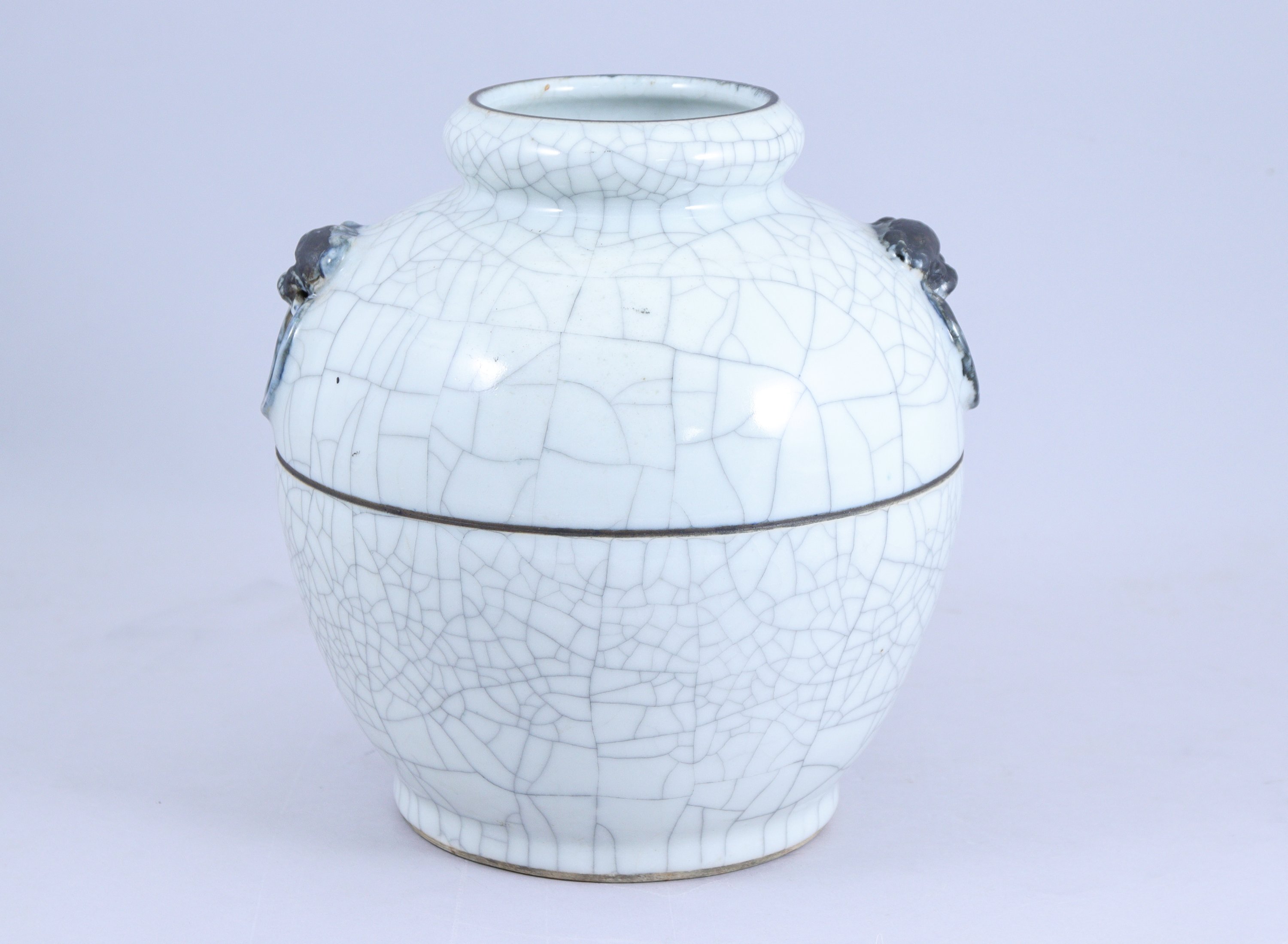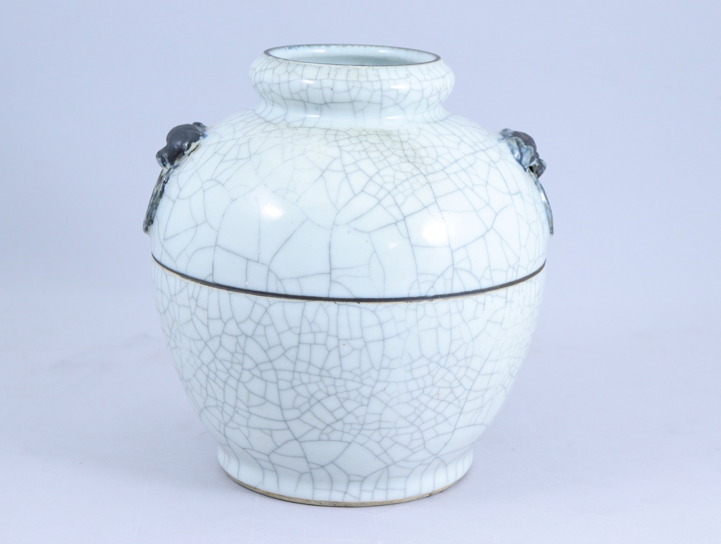 en porcelaine craquelée blanche, les anses à têtes de chimère tenant un anneau dans leur gueule.