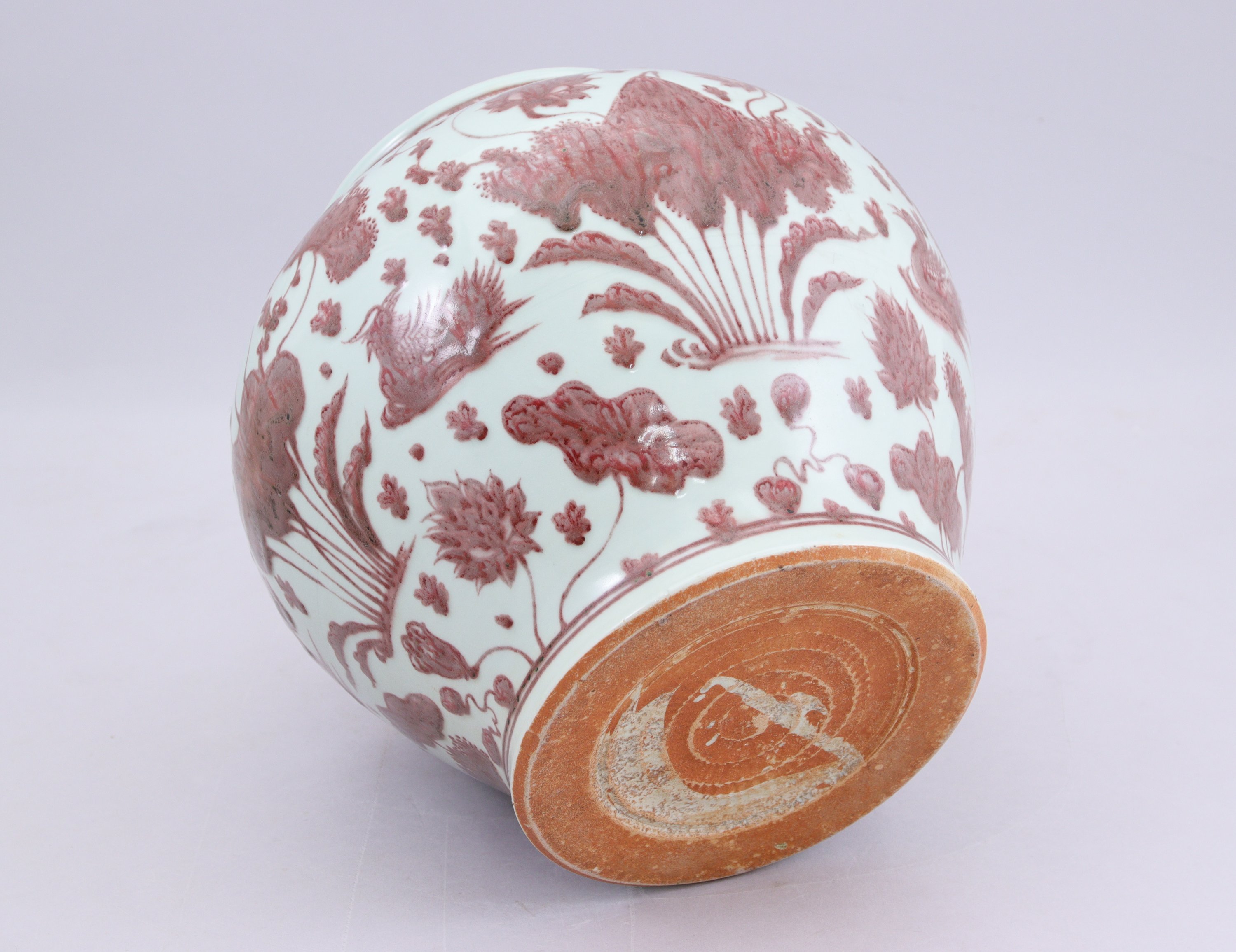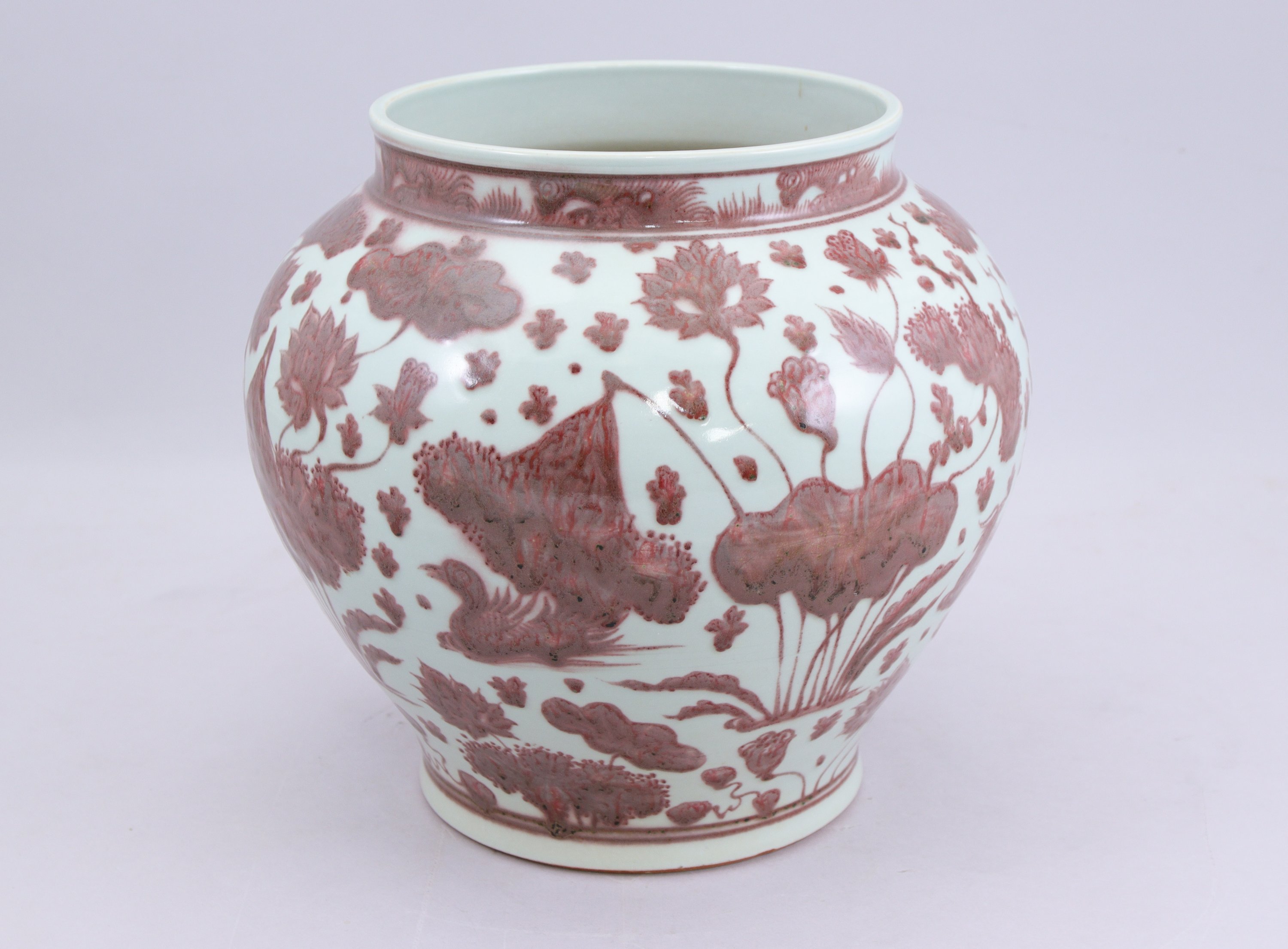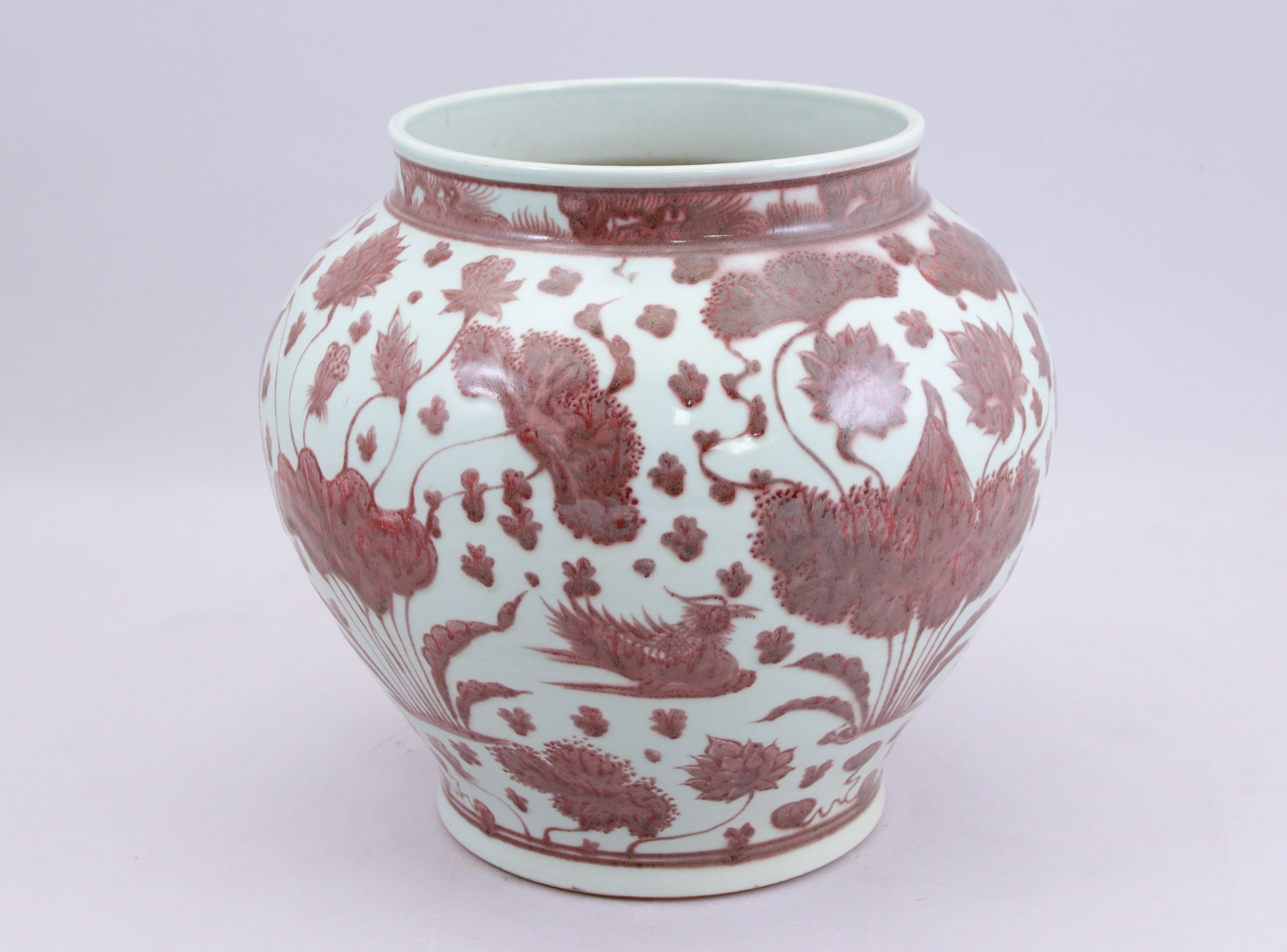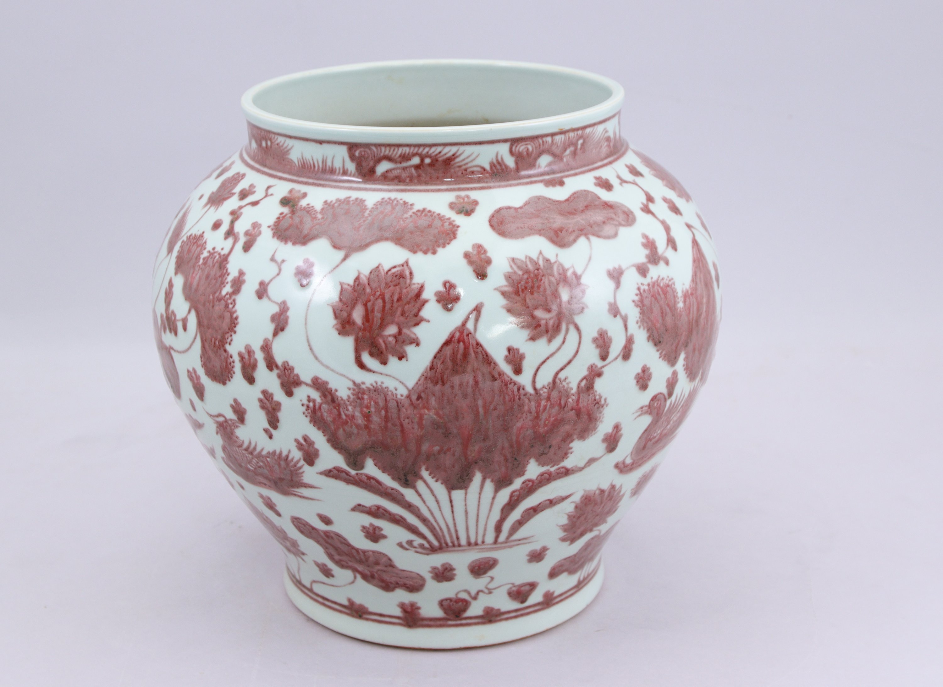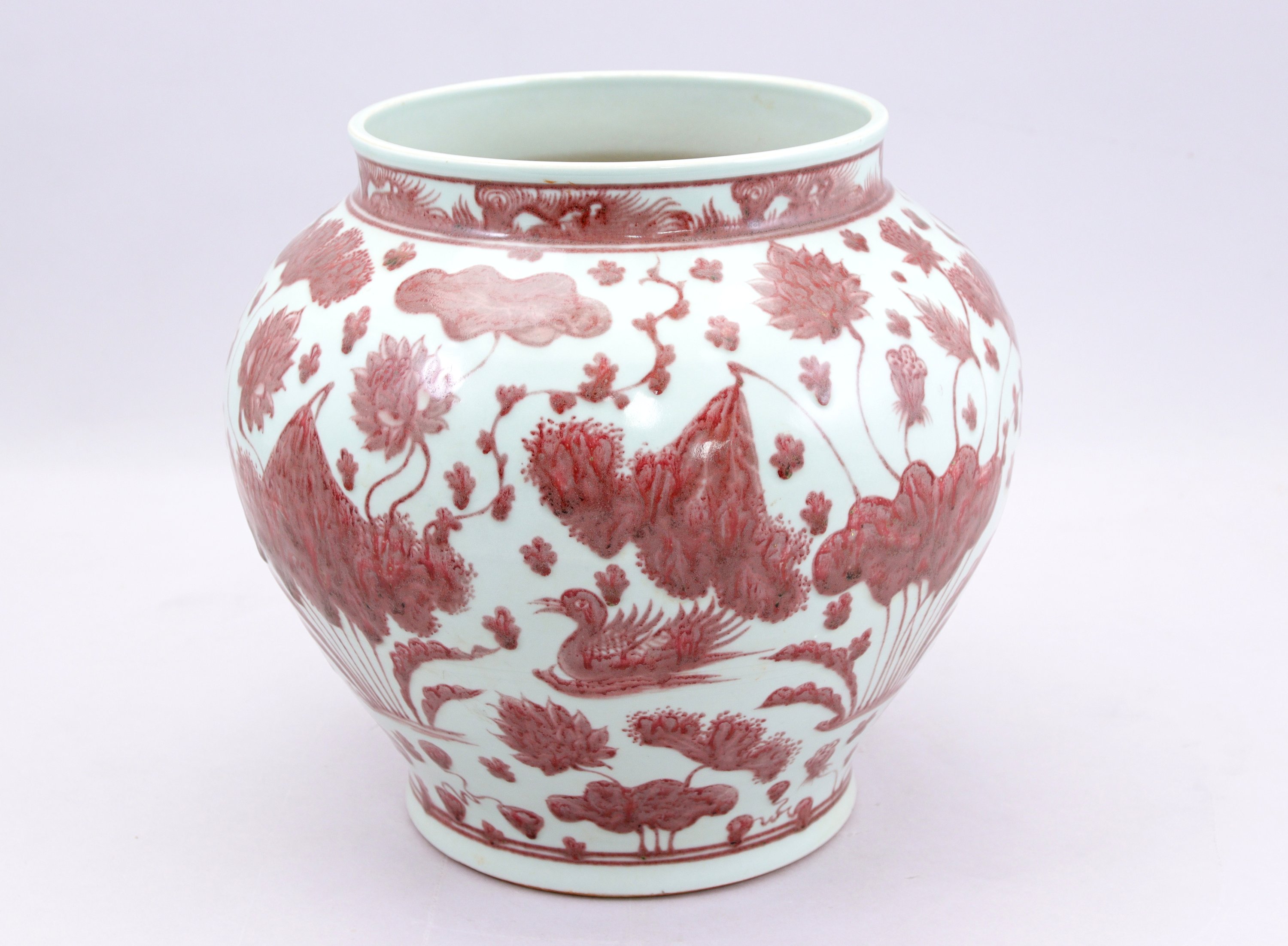 Vase blanc à décor de fleurs et d'oiseaux rouge.