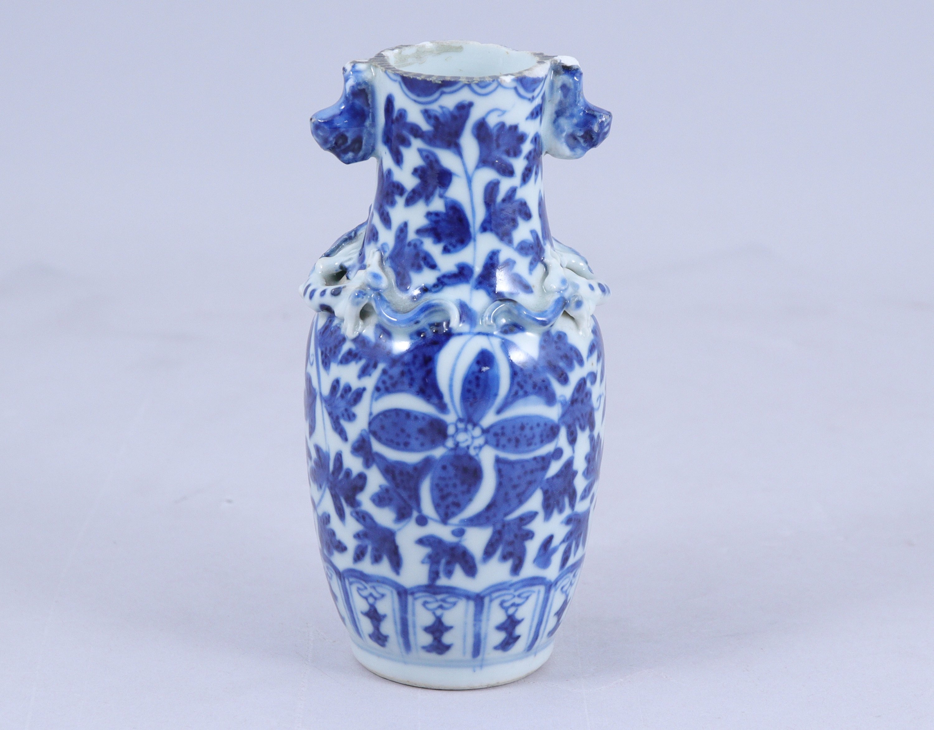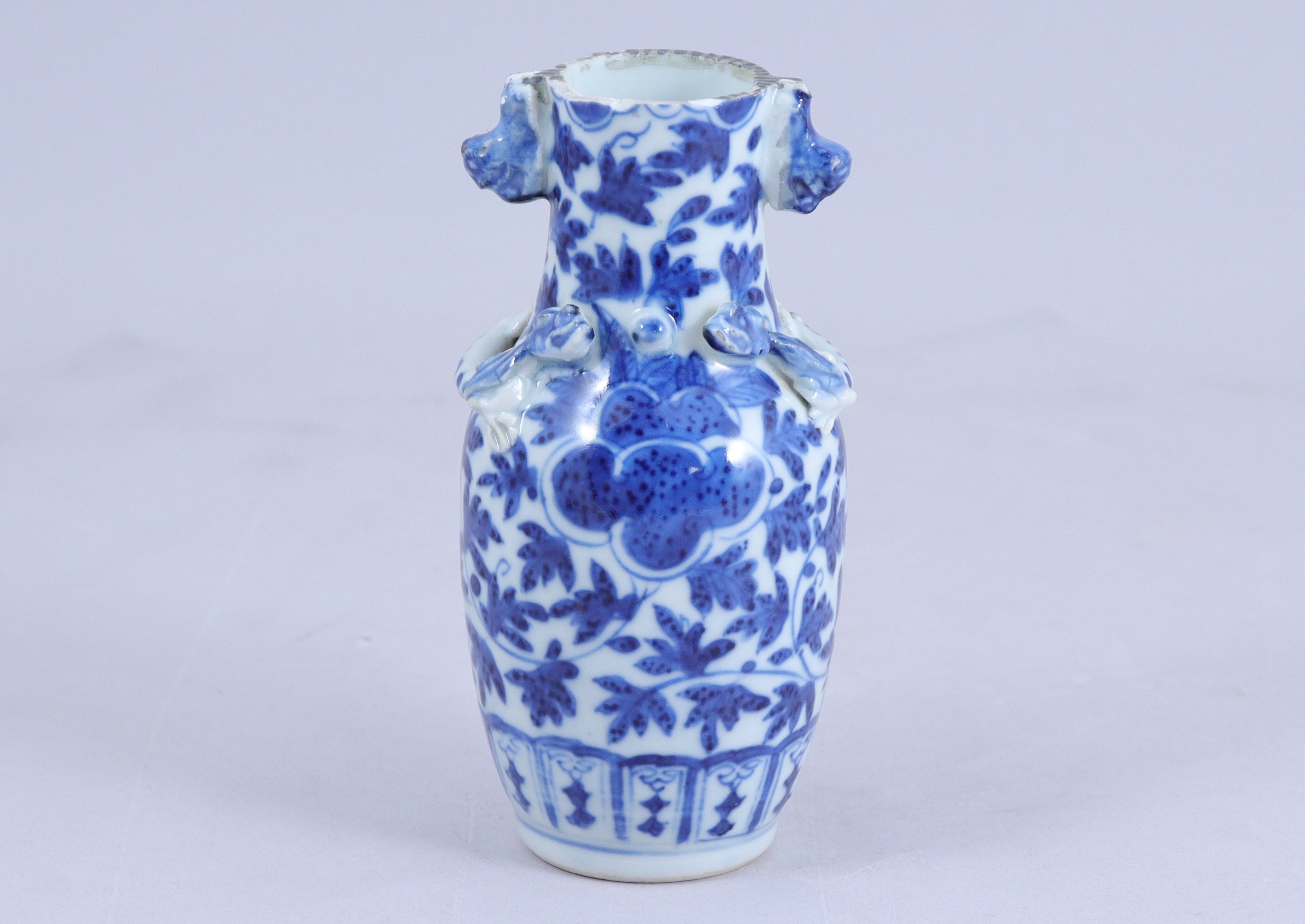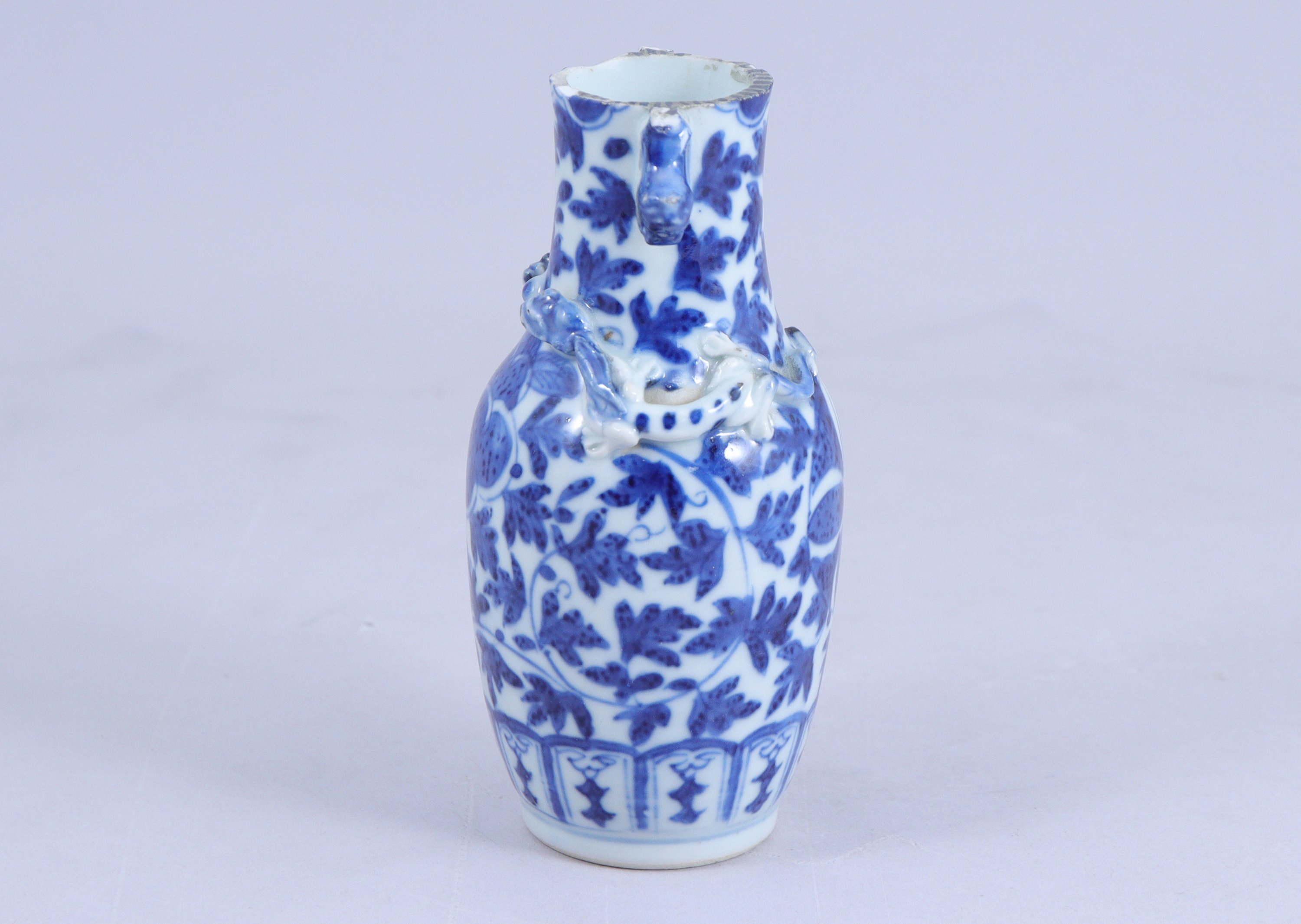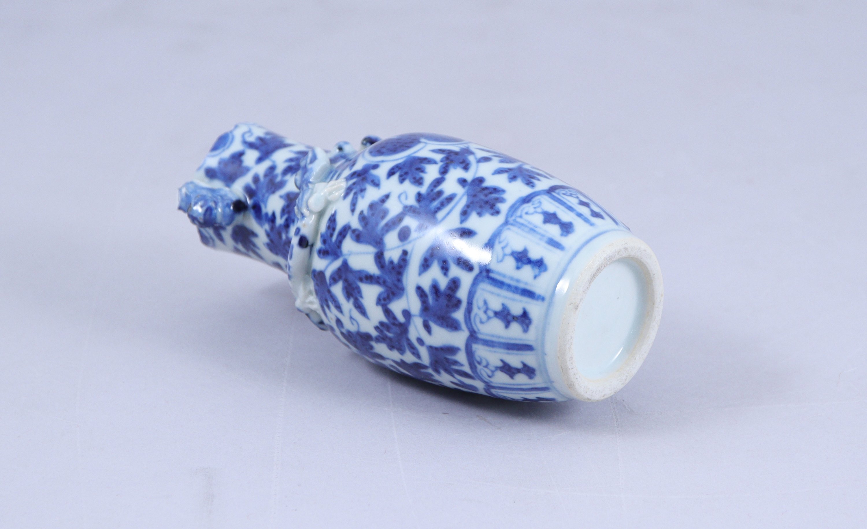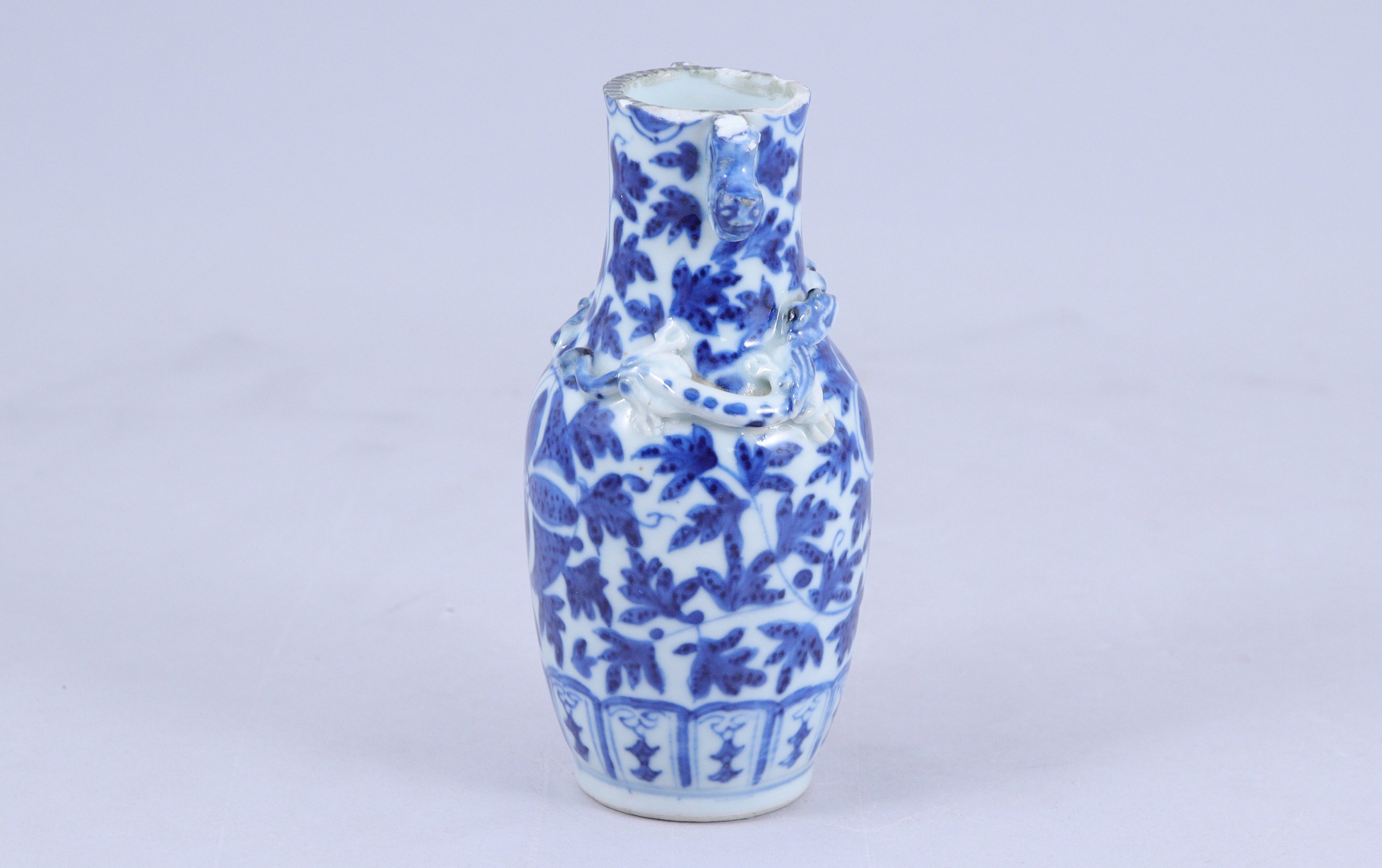 en porcelaine bleue et blanche avec deux dragons appliqués chassant la perme sacrée. Anses à motifs de lions allongés.