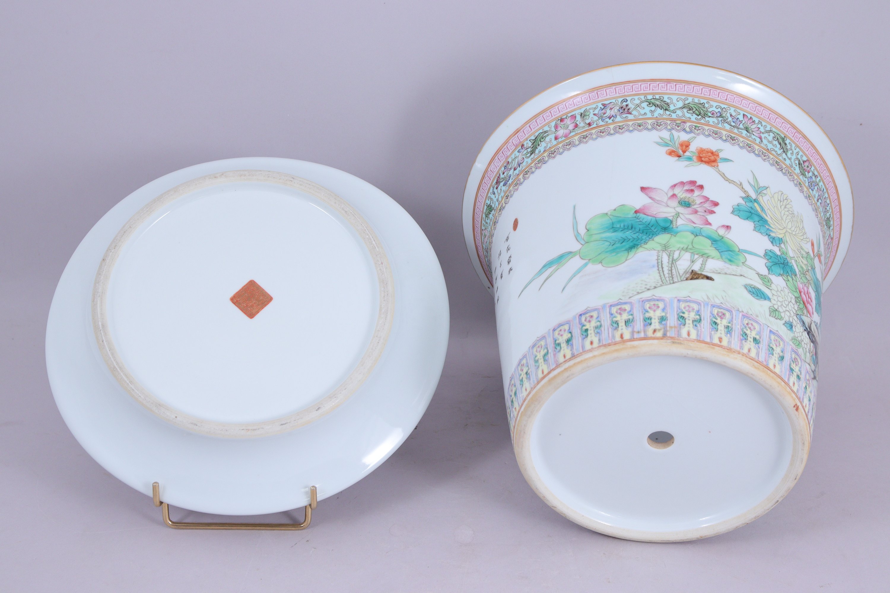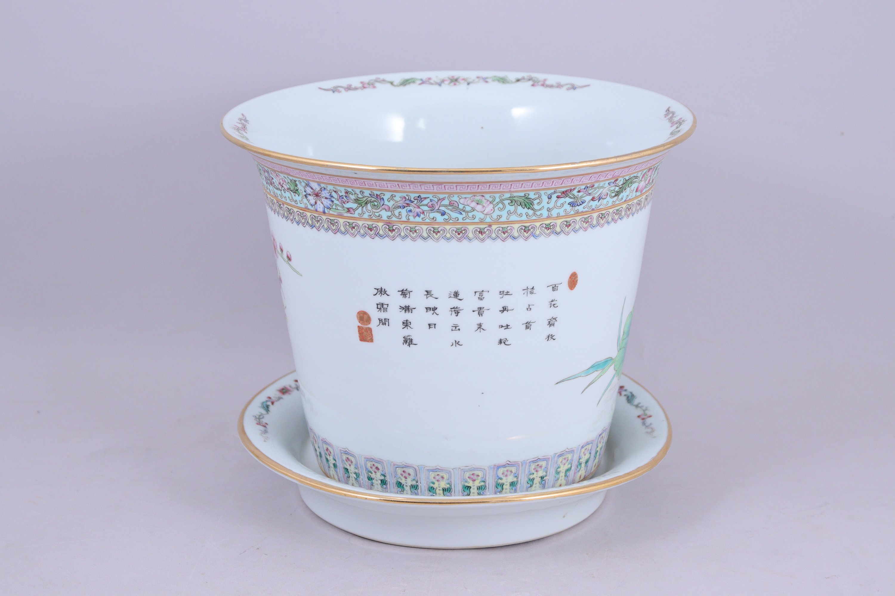 - Jardinière et sa coupelle, en porcelaine blanche, à décor floral polychrome. Tampon rouge (Zhuanshu?). Haut. 22,5 Diam. 26 cm. (Fissure, restauration).