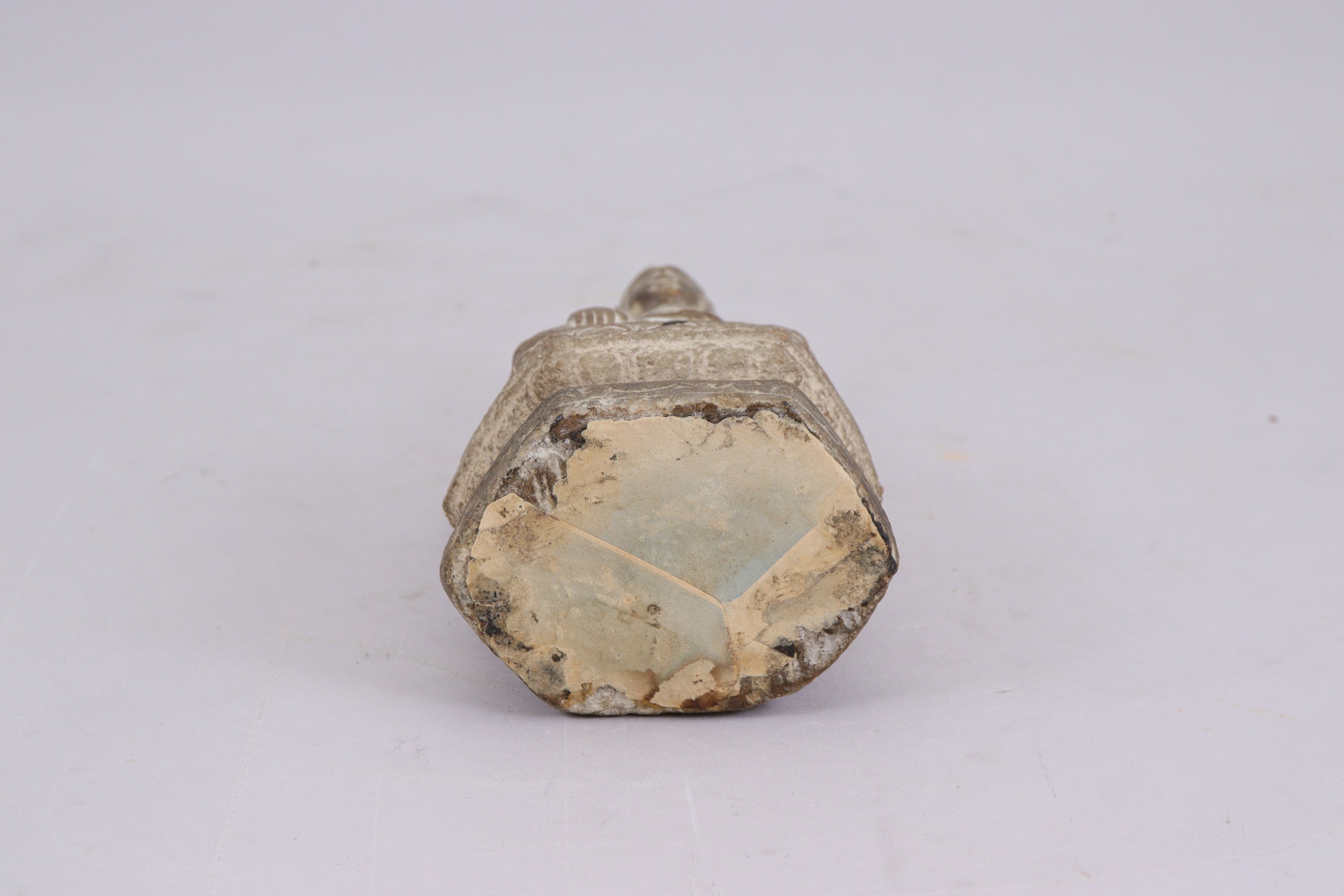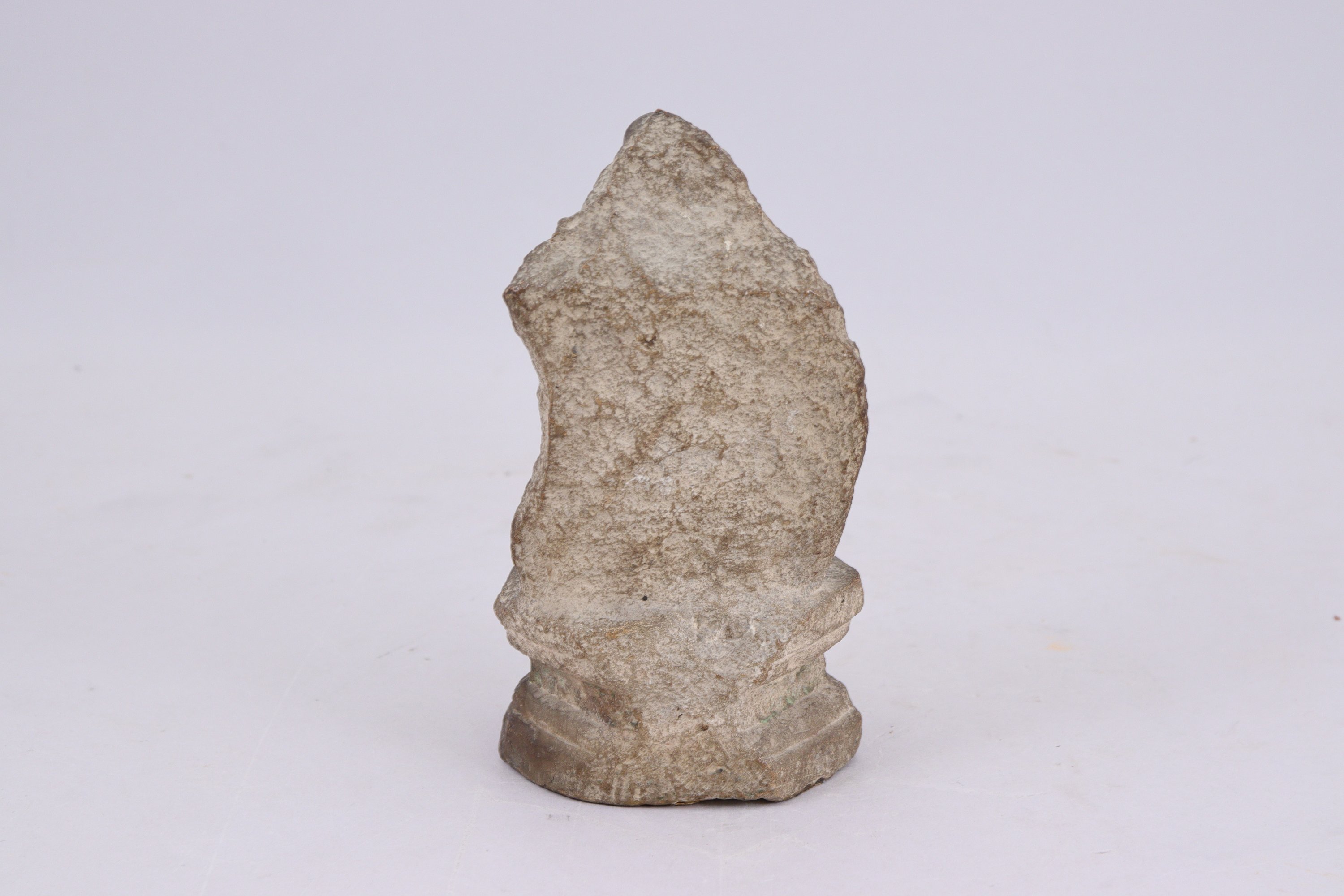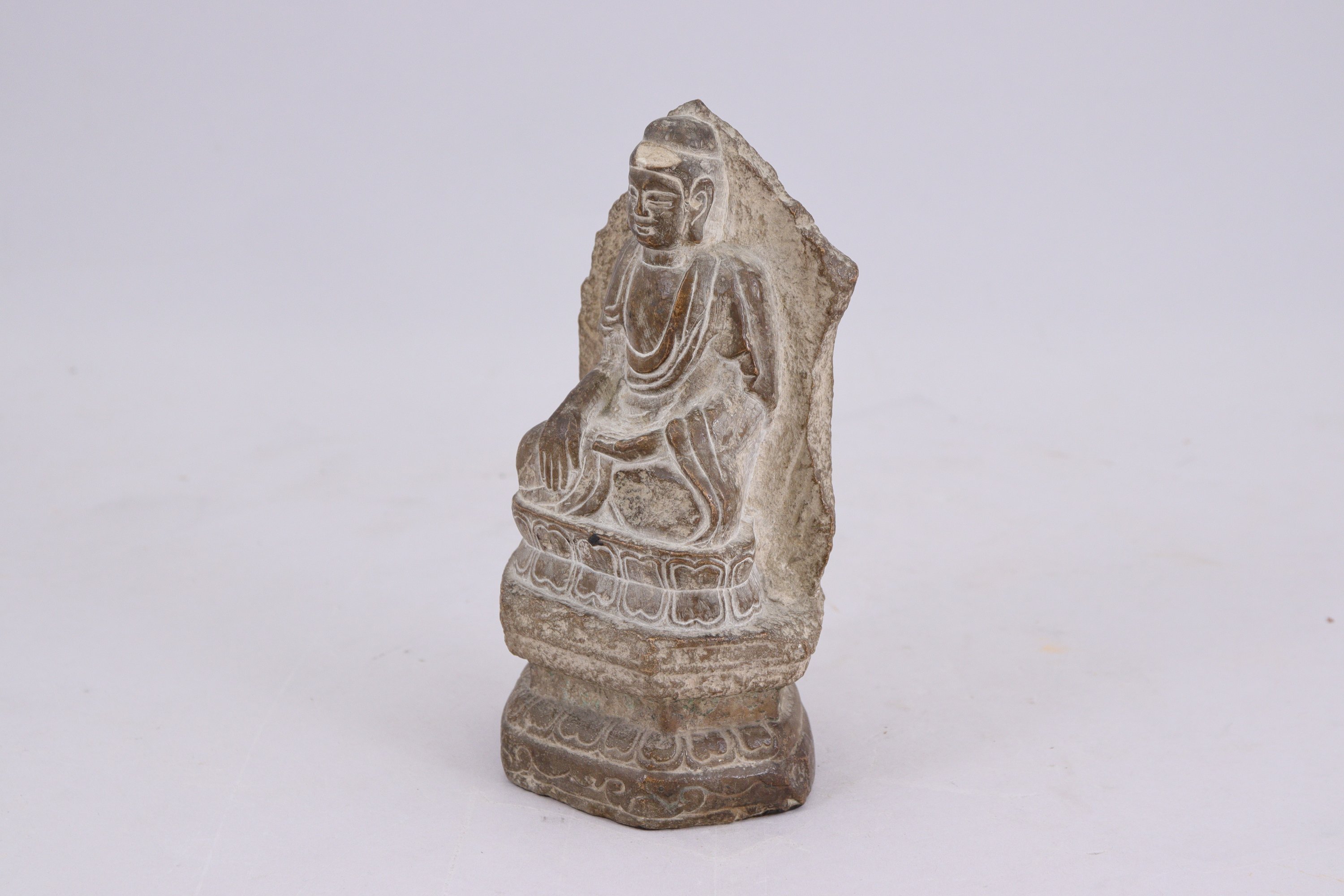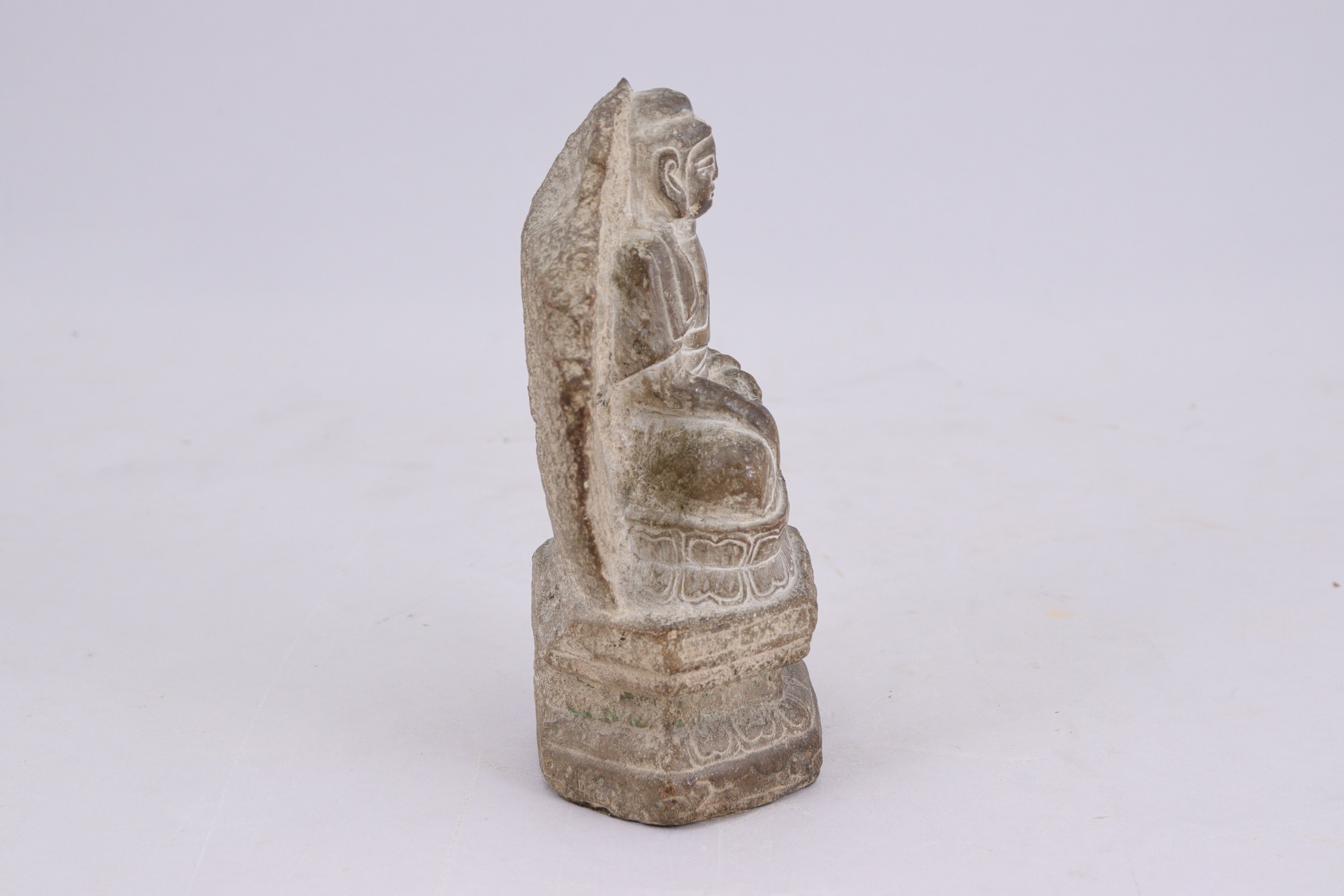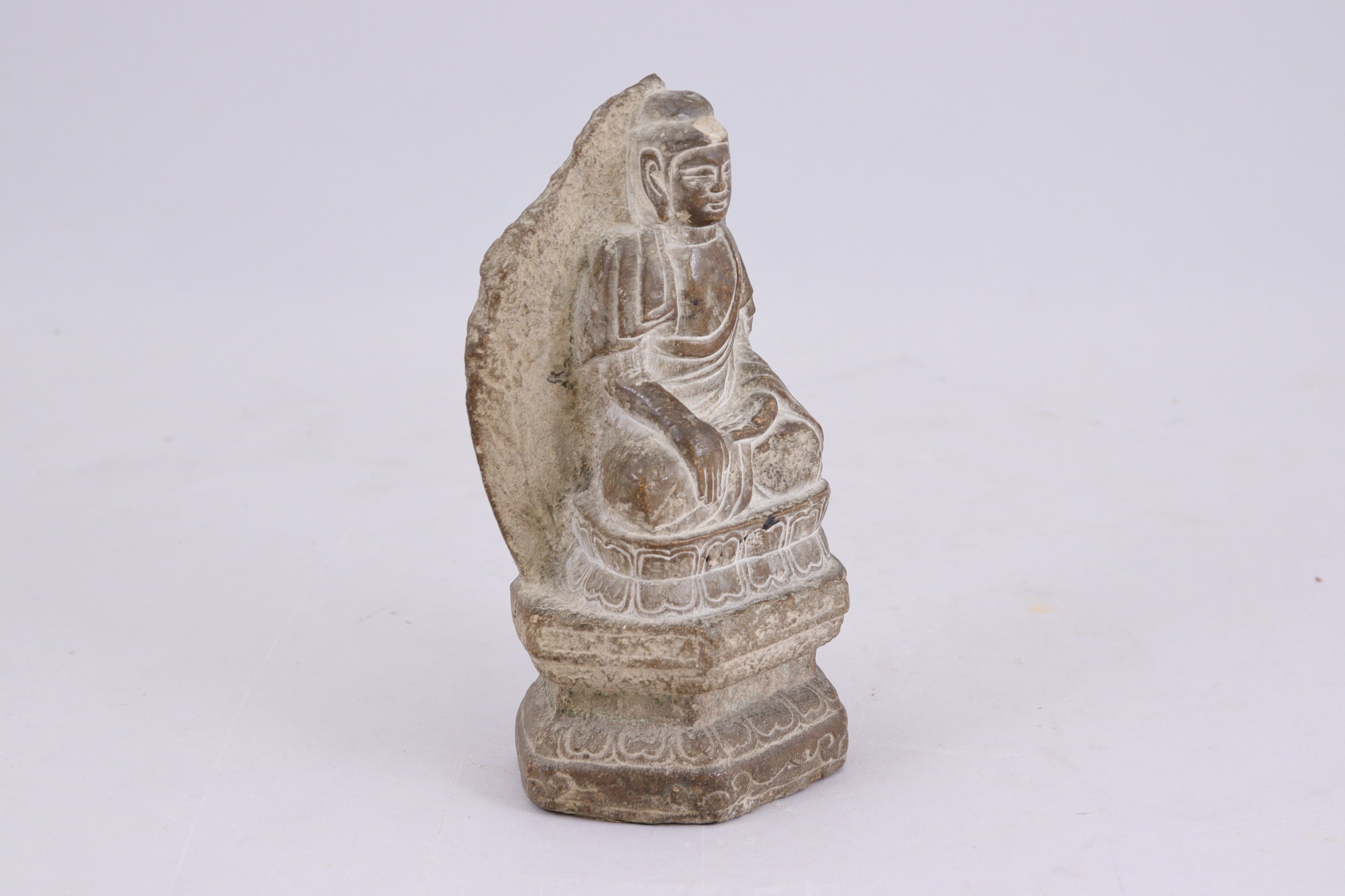 en grès, assis sur un socle en forme de double lotus.